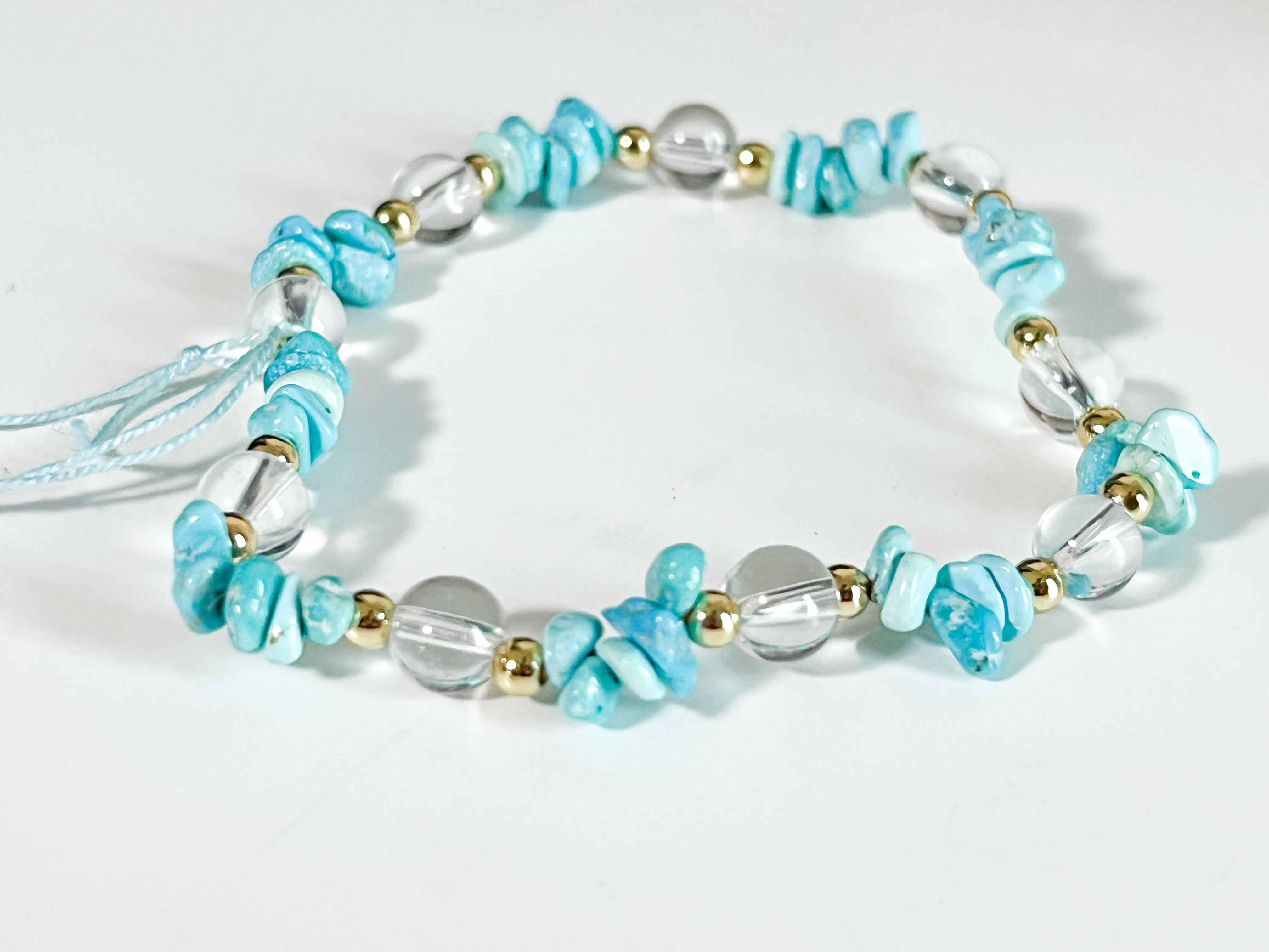 スリーピングビューティターコイズブレスレットは、鮮やかなブルーが目を引く美しいアイテムです。スリーピングビューティターコイズは、その名の通り深い青色が特徴で、特別な存在感を放っています。 このブレスレットは、心を落ち着け、安心感をもたらすパワーストーンとして多くの人に愛されています。また、手首にフィットしつつ、どんなコーディネートにも調和し、日常の中でスタイルを際立たせることでしょう。 シンプルでありながらも存在感のあるデザインは、普段使いはもちろん、特別なシーンでも華やかさを添えます。ぜひ、スリーピングビューティターコイズの魅力をあなたのスタイルに取り入れてみてください。身につけることで、毎日の装いに新しい彩りと心の安らぎをもたらしてくれることでしょう。 使用ストーン スリーピングビューティターコイズ 水晶 内径 16センチ