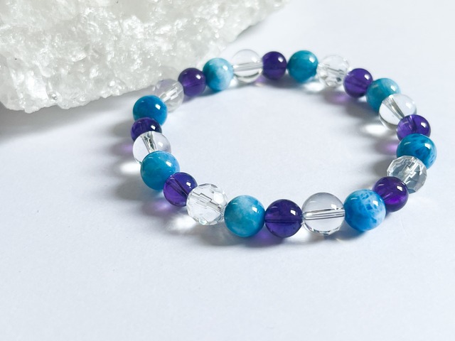 このブレスレットは、明るい気持ちをもたらす美しいアパタイトと神秘的な紫色のアメシストを贅沢に使用したアイテムです。 それぞれの天然石が絶妙に調和し、ポジティブなエネルギーを与える印象を持っています。日常のスタイルに加えるだけでなく、特別なシーンでも存在感を放つこと間違いなしです。 心の平和を求める方や、自信を高めたい方にぴったりなブレスレットです。このアイテムを身に着けることで、明るい気持ちで毎日を楽しむことができるでしょう。 使用ストーン アパタイト 7-8ミリ アメシスト 7-8ミリ 水晶8ミリ 内径16センチ