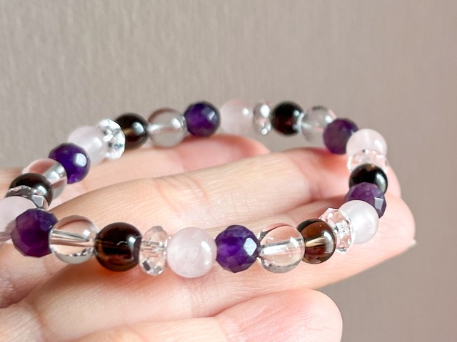 【意味・願い】 恋愛運をサポートするブレス。ローズクォーツとアメジストの組み合わせブレスレットです。 新しい恋をしたいなぁと思っている人にオススメ。優しい気持ちになれるブレスです。つい感情的になってしまう人にもおすすめ。 アメジストは睡眠障害のある方におすすめのストーンです。自分をついつい傷つけてしまったり、パニックやヒステリーなどに陥りやすい方にもオススメのストーンです。心穏やかに生活することが出来ます。 【サイズ・ストーン】 ローズクォーツ 6ミリ アメジスト 6ミリ スモーキークォーツ 6ミリ 水晶 6ミリ 水晶 ロンデル 内径 13.5センチ