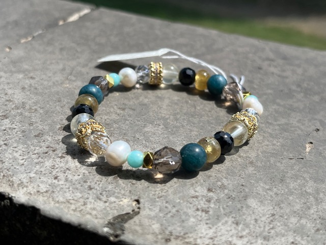 ブルーグリーンとゴールドイエローが印象的な、爽やかで知的なブレスレットです。 直感力や行動力を高めるアパタイトに、スピネルの集中力、レモンクォーツの明るいエネルギーを重ねました。 小粒ながらそれぞれの個性が活きていて、パールやスモーキークォーツが全体の印象をやわらげています。 新しいことを始めたいときや、自信を持って前に進みたいときに。 心のブレを整えながら、軽やかな一歩を後押ししてくれる一本です。 使用ストーン ブルーグリーンアパタイト 6-7ミリ ゴールデンアパタイト 6-7ミリ スピネル 6ミリ レモンクォーツ 6ミリ パール 7ミリ アマゾナイト 4ミリ-5ミリ スモーキークォーツ 6ミリ 内径13.5センチ