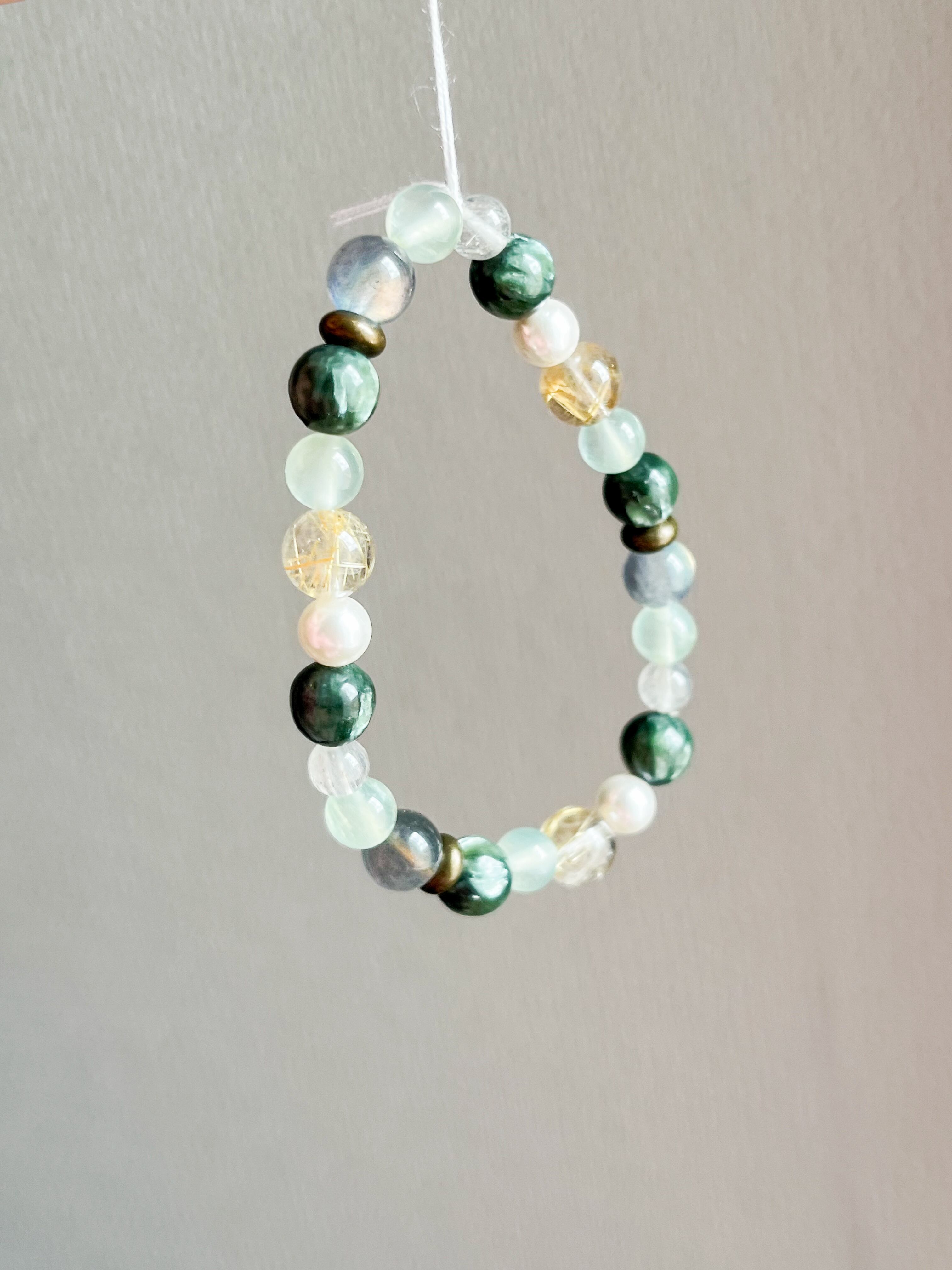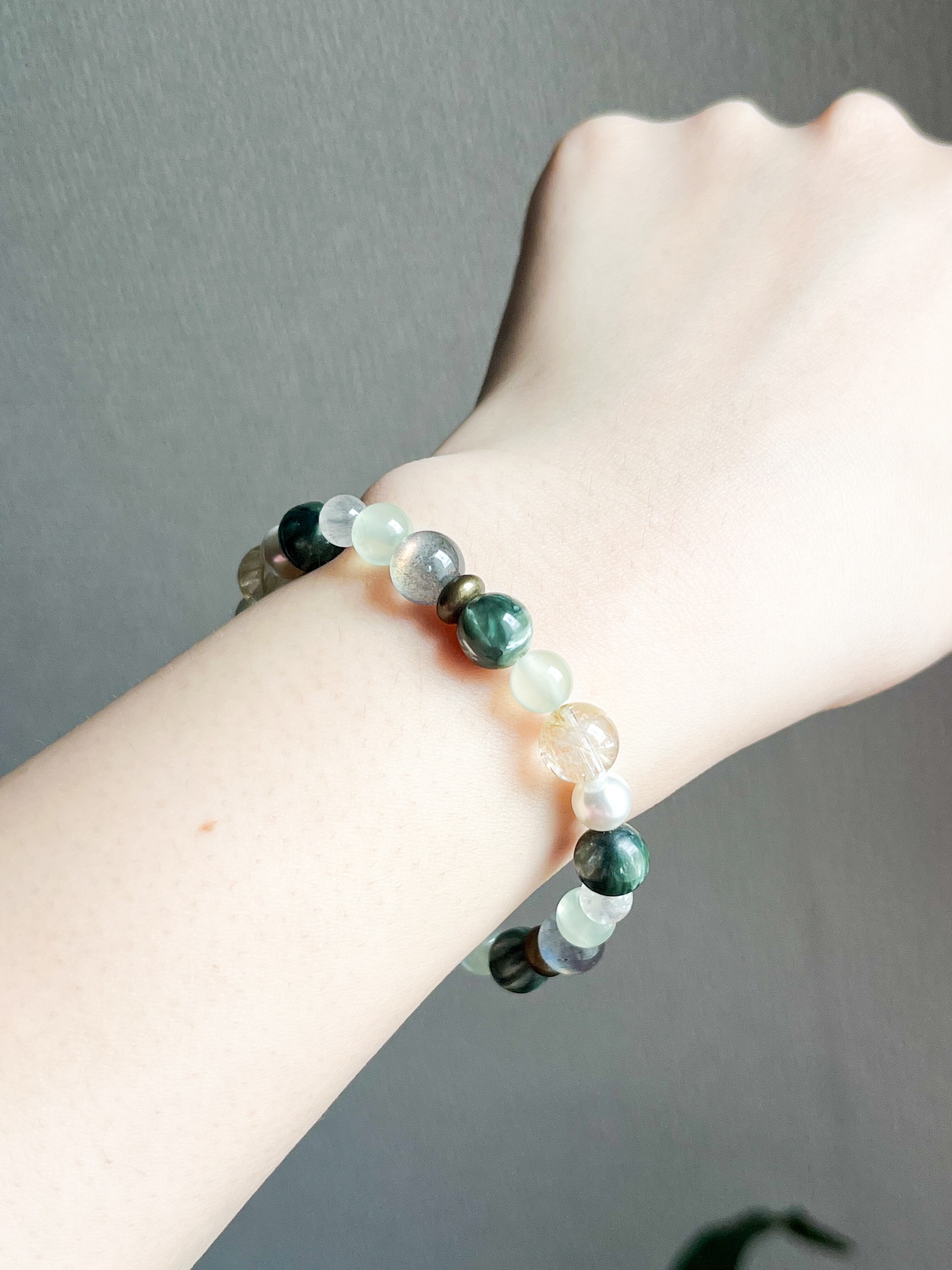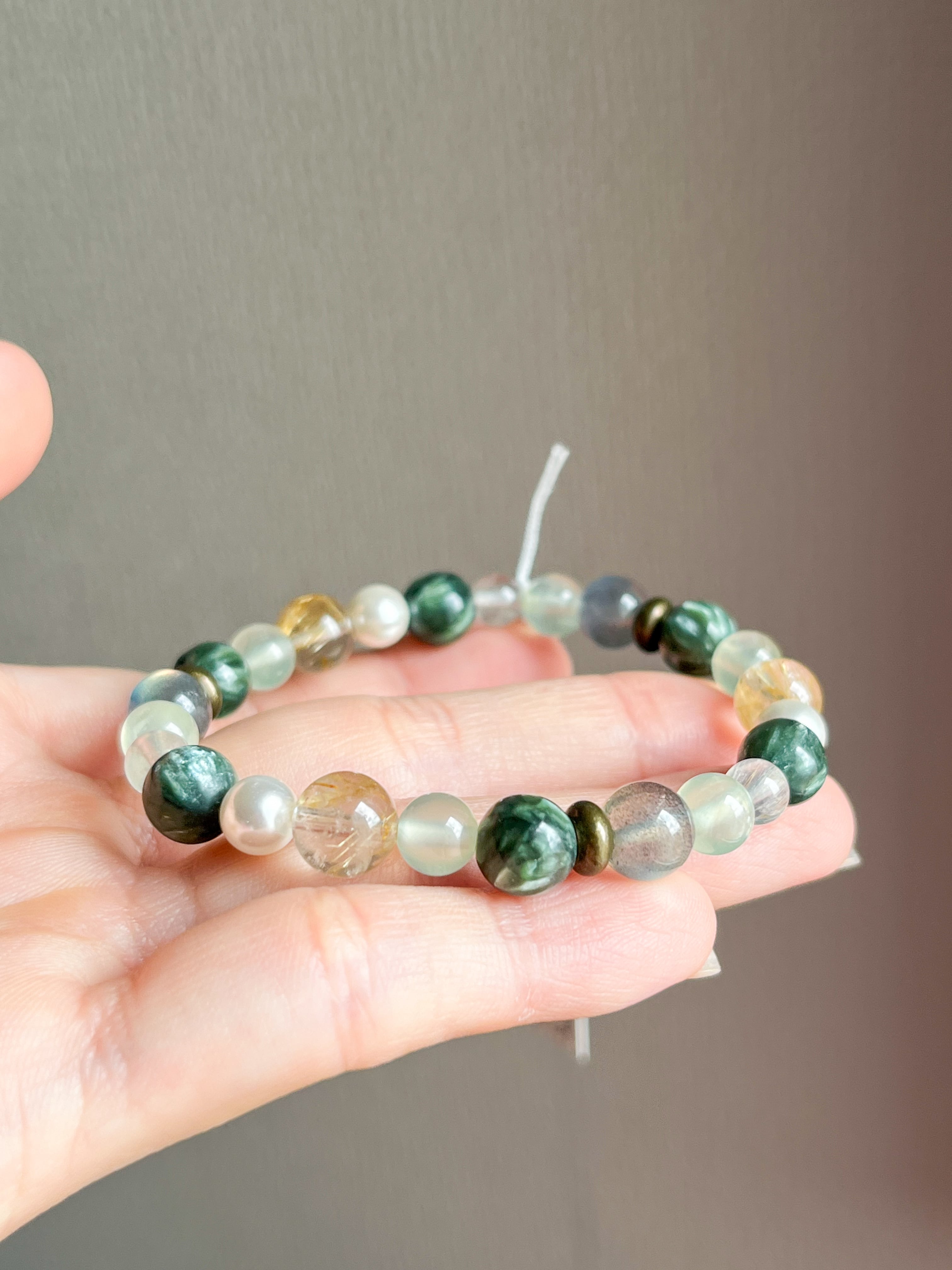 魅力的なセラフィナイト、ルチル、ラブラドライト、パールを使用したブレスレットです。このブレスレットでは、各ストーンが持つ美しい輝きと神秘的なエネルギーを感じることができます。