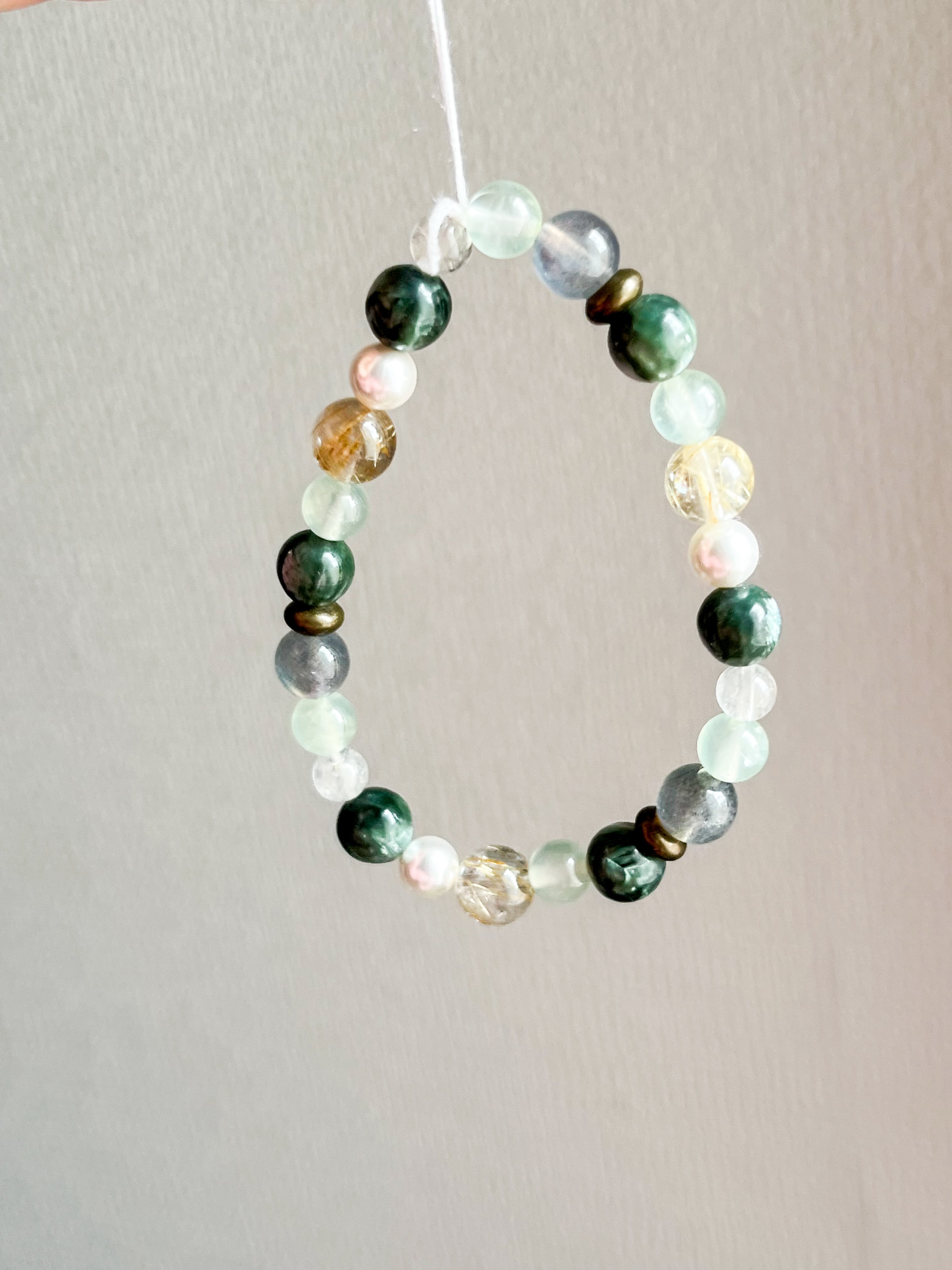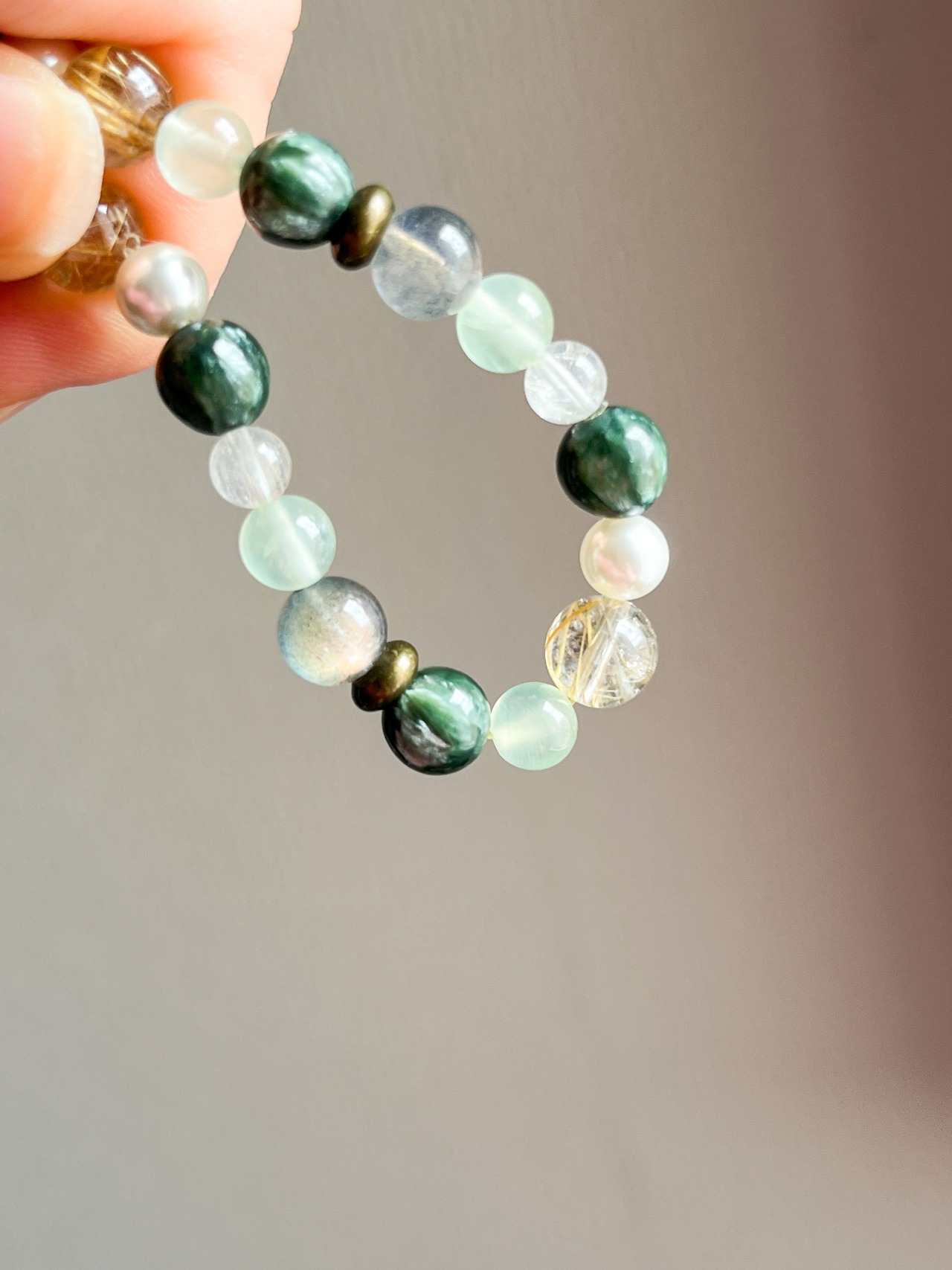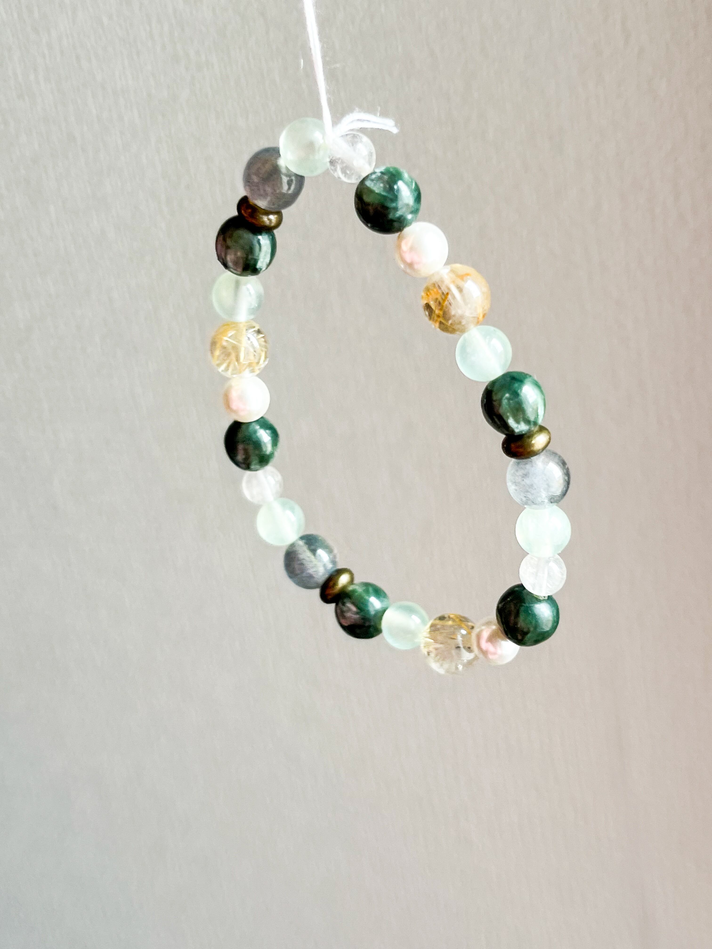 魅力的なセラフィナイト、ルチル、ラブラドライト、パールを使用したブレスレットです。このブレスレットでは、各ストーンが持つ美しい輝きと神秘的なエネルギーを感じることができます。
