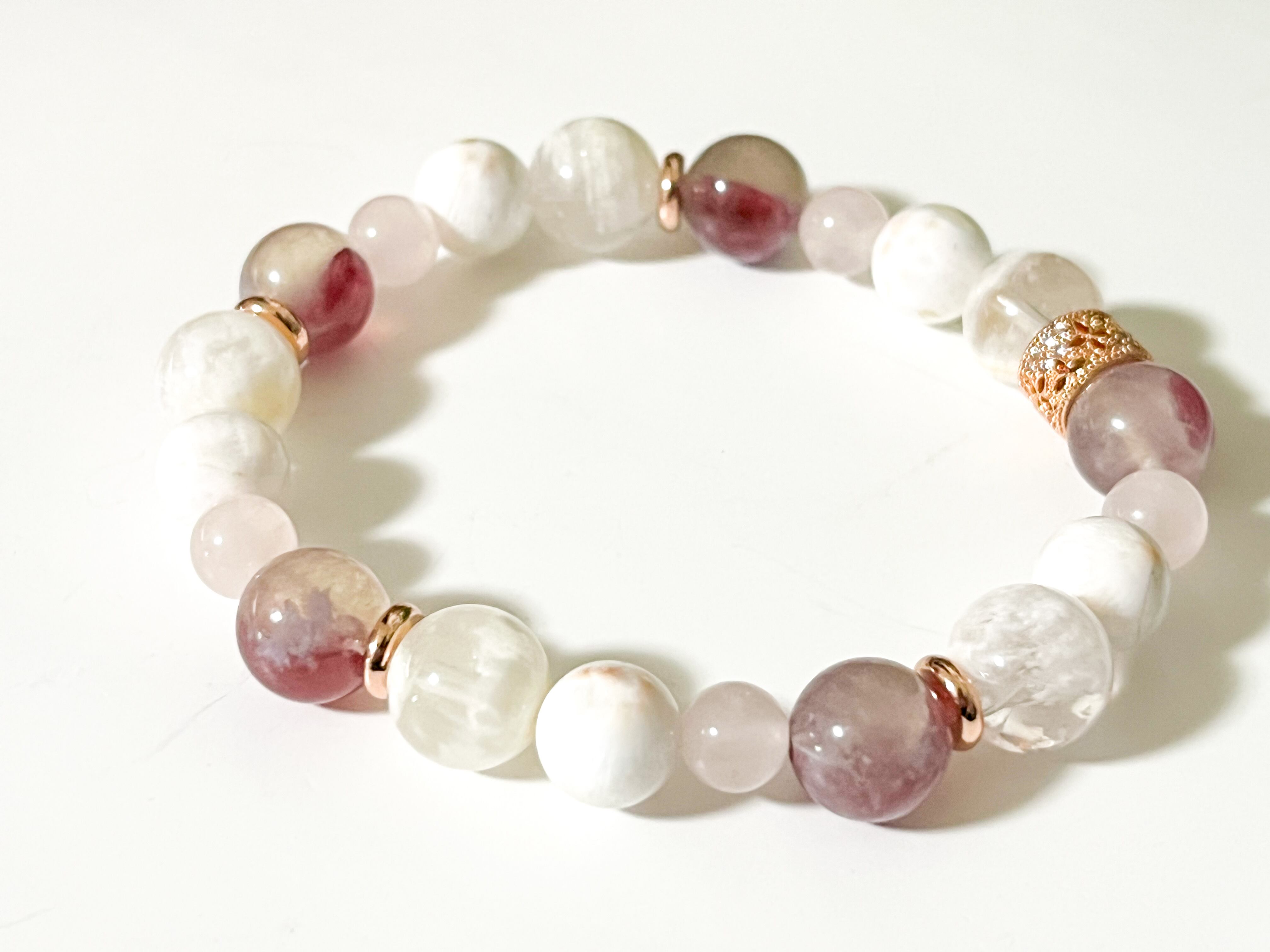 爽やかな美しさを放つ、トムソナイトとピンクトルマリンシリカ、そしてセリサイトインローズクォーツのブレスレットです。このブレスレットでは、豊かな色合いとそれぞれのストーンが持つエネルギーを存分に体感できます。