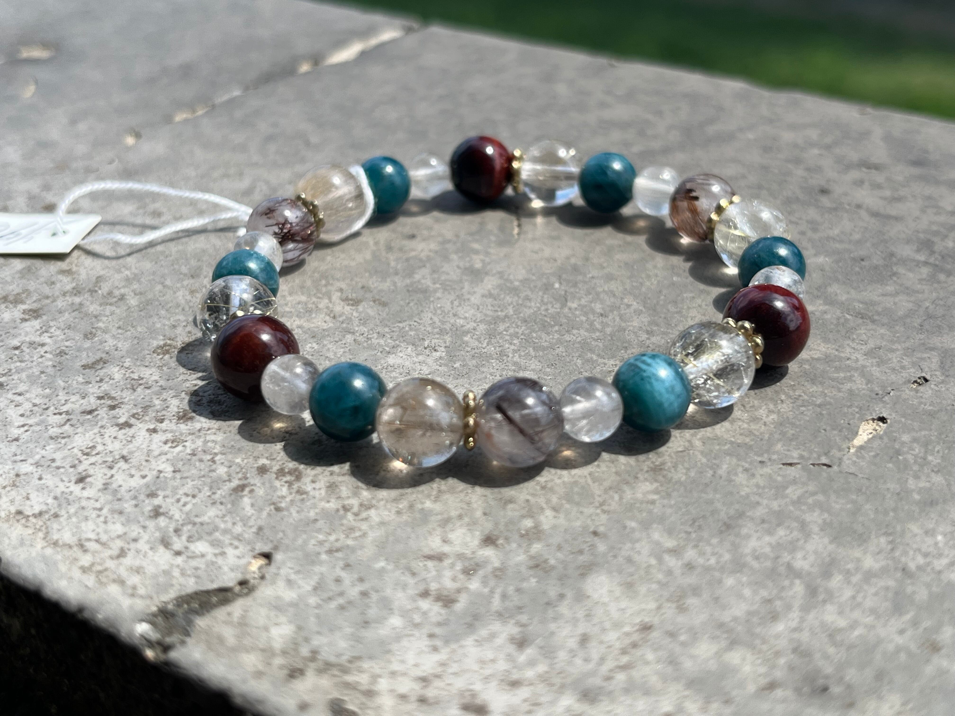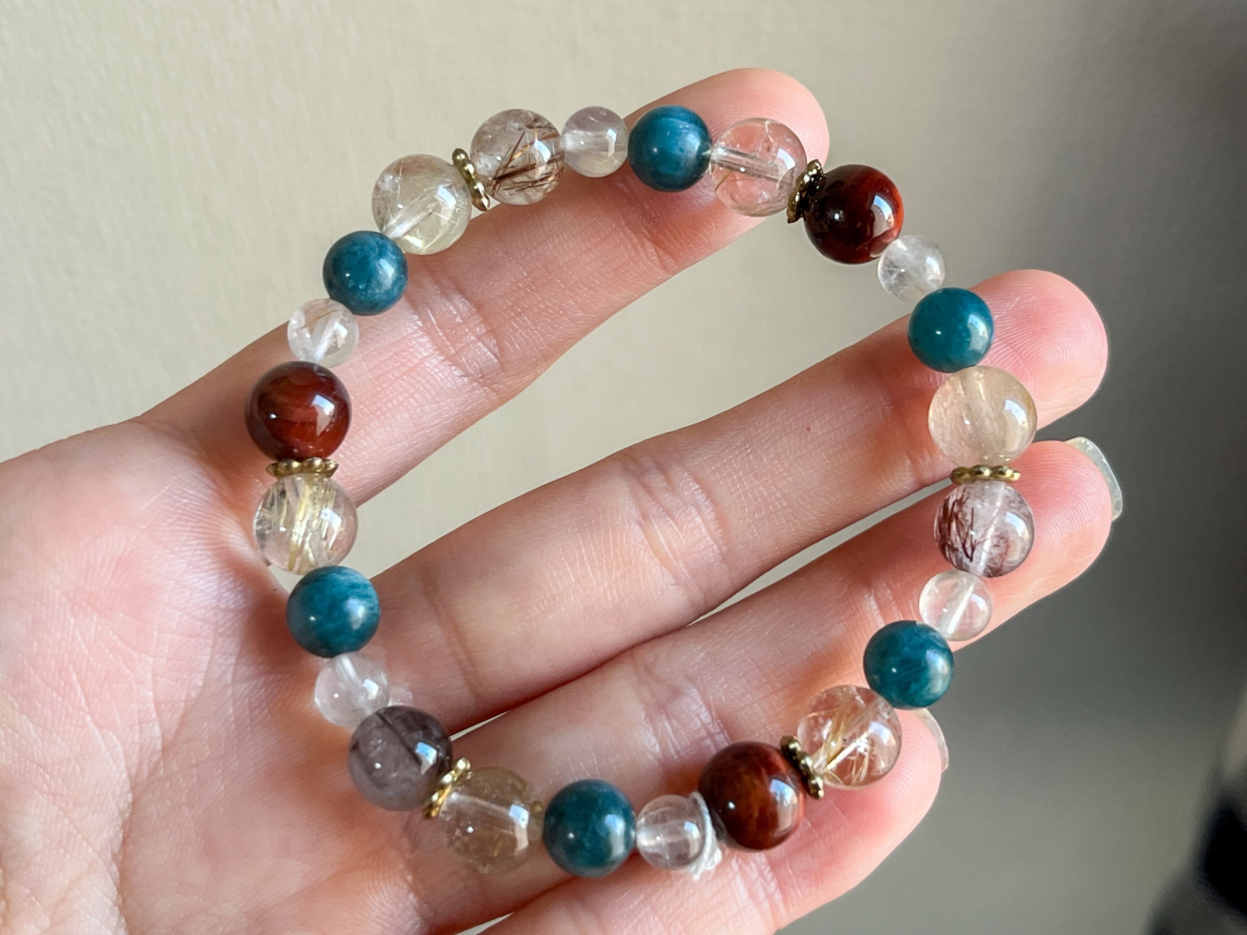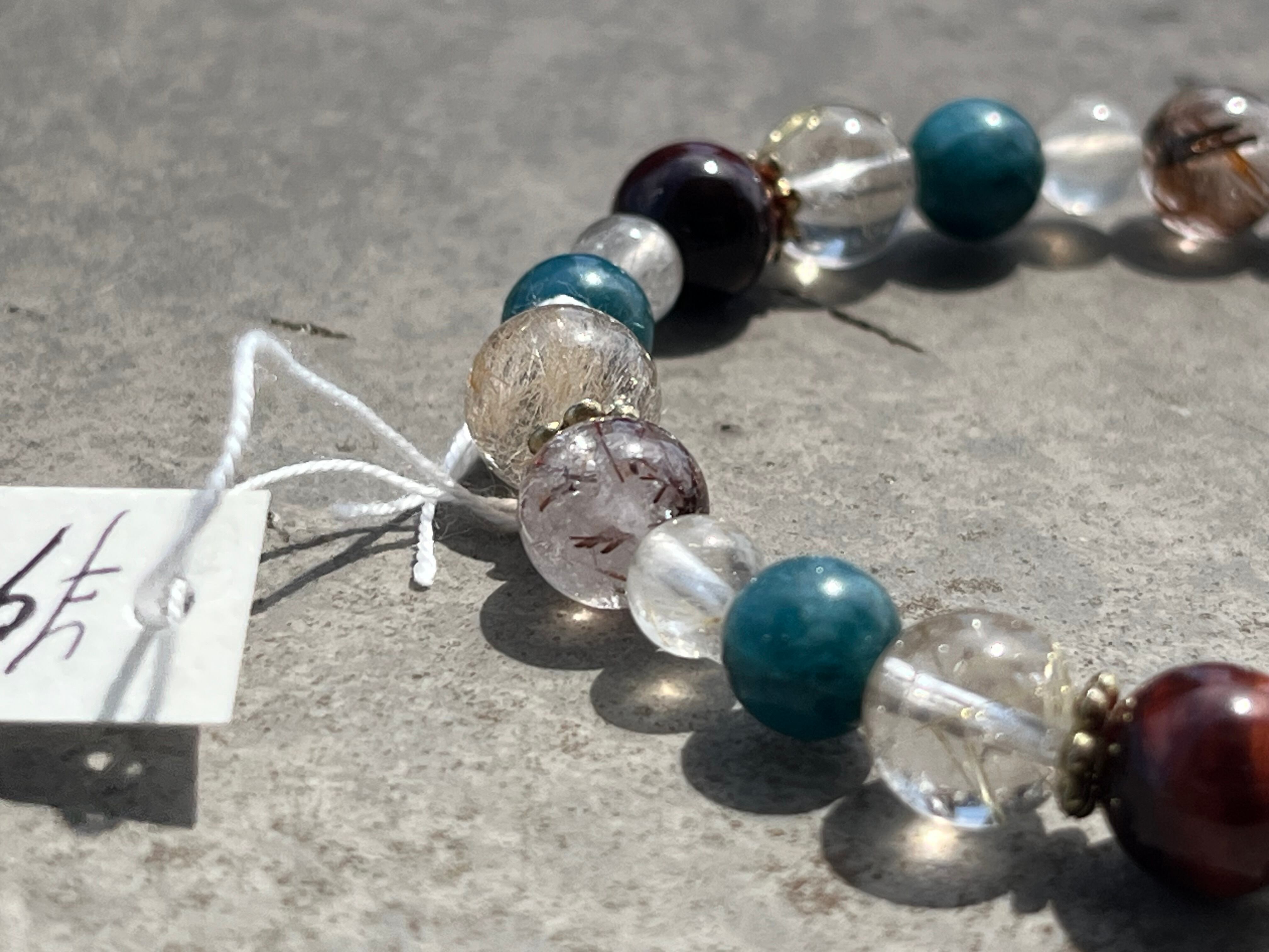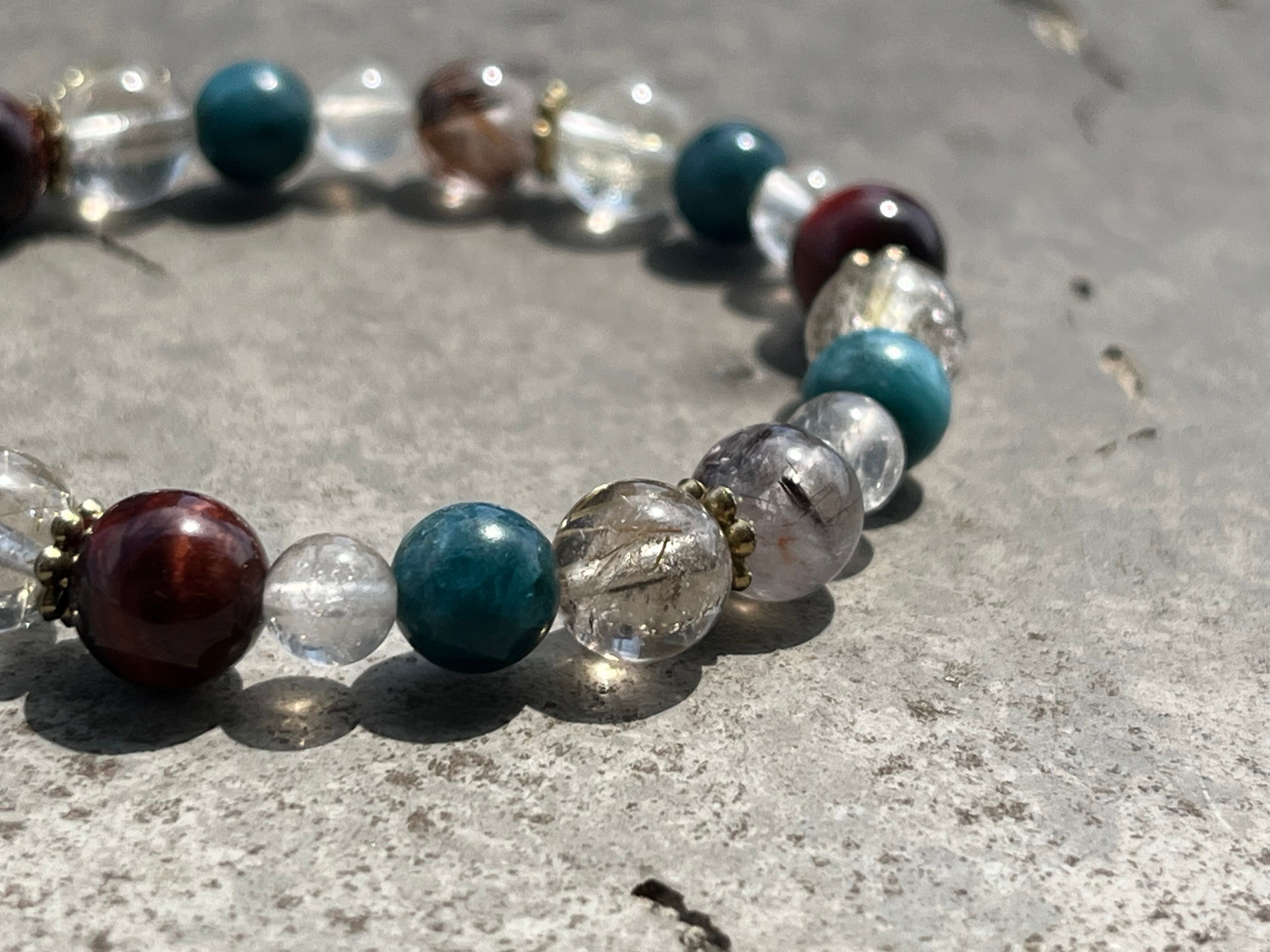 深みのあるグリーンブルーのアパタイト、力強く輝くタイガーアイ、透明感のあるルチルクォーツ——それぞれがまるで異国の風を運ぶような、個性豊かな天然石たちをリズムよく配した一本。