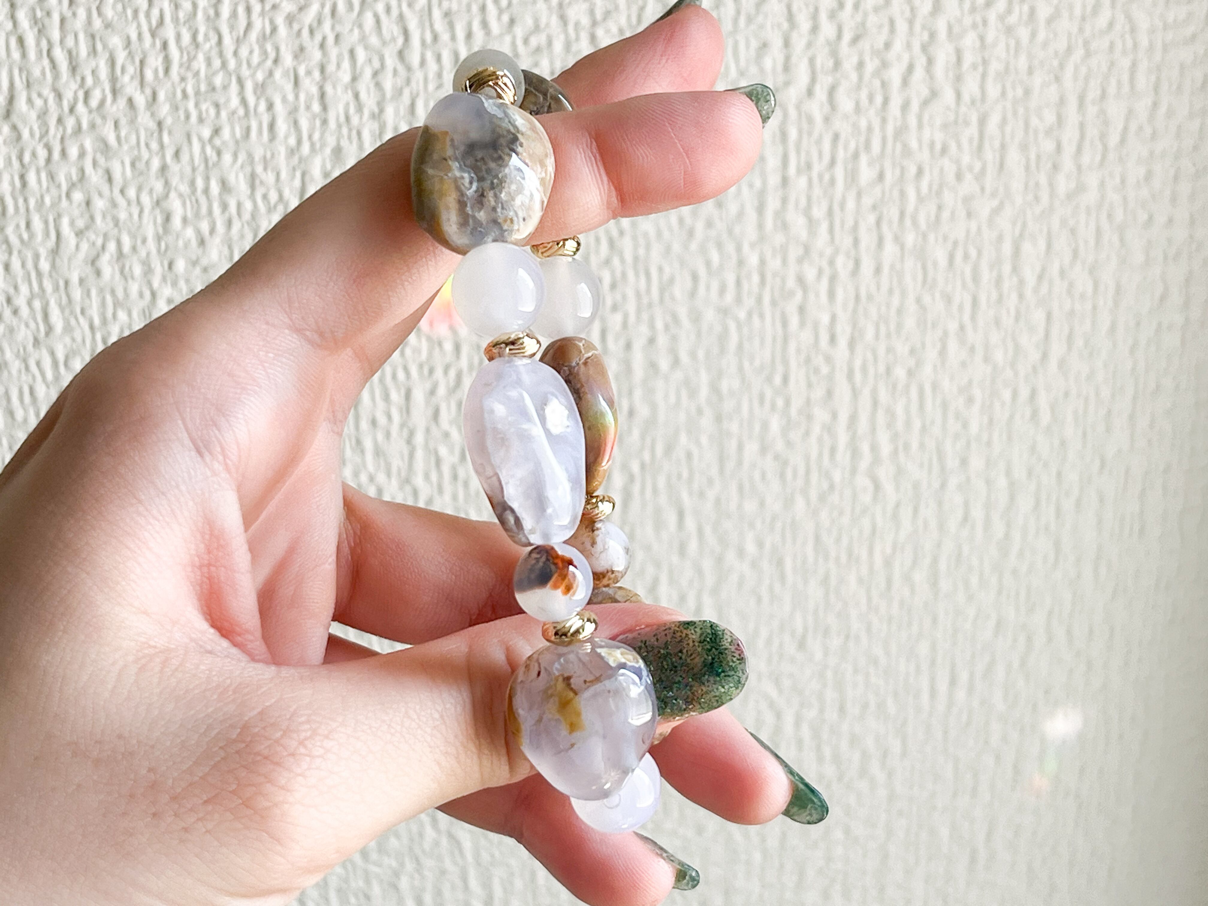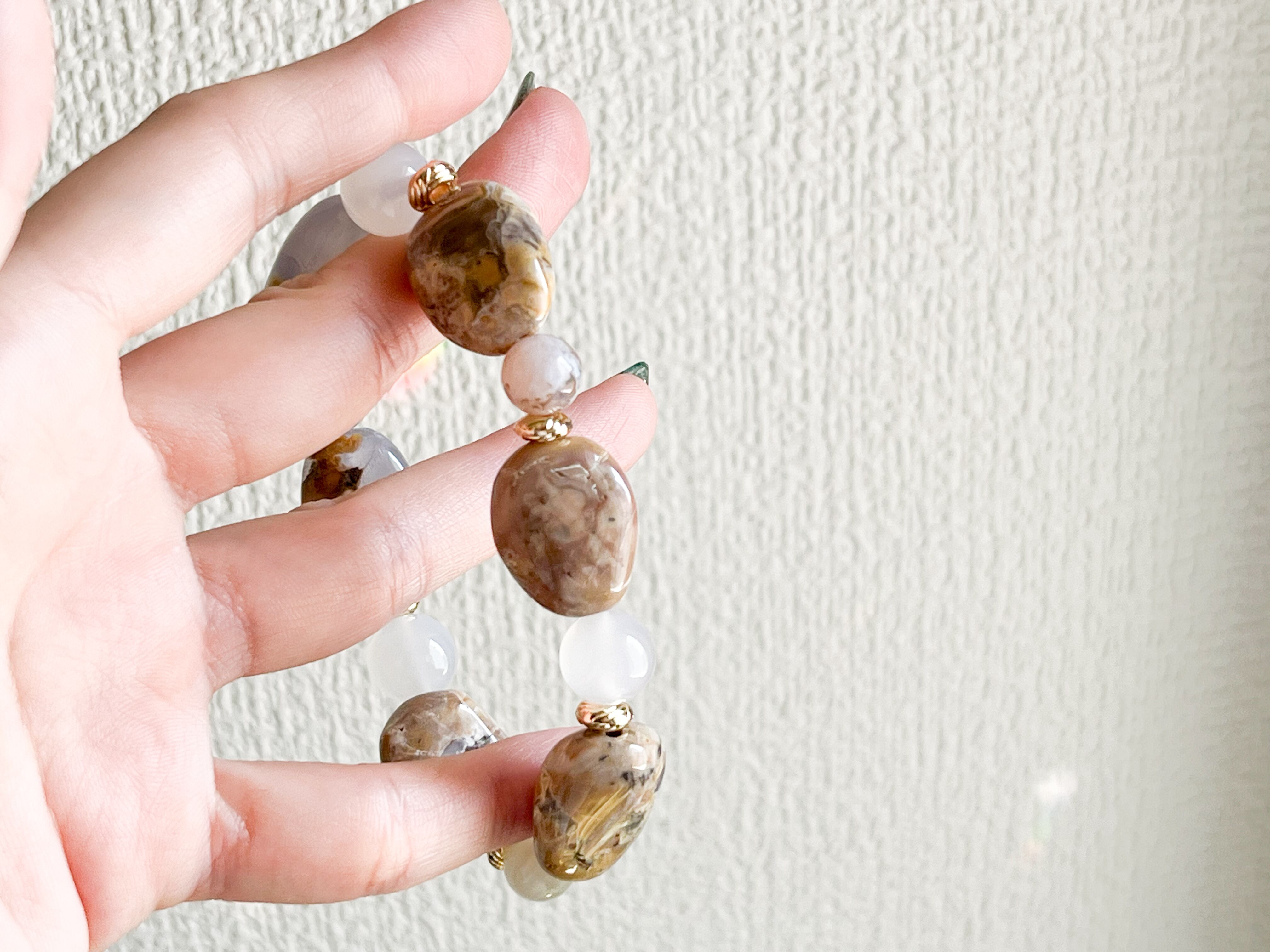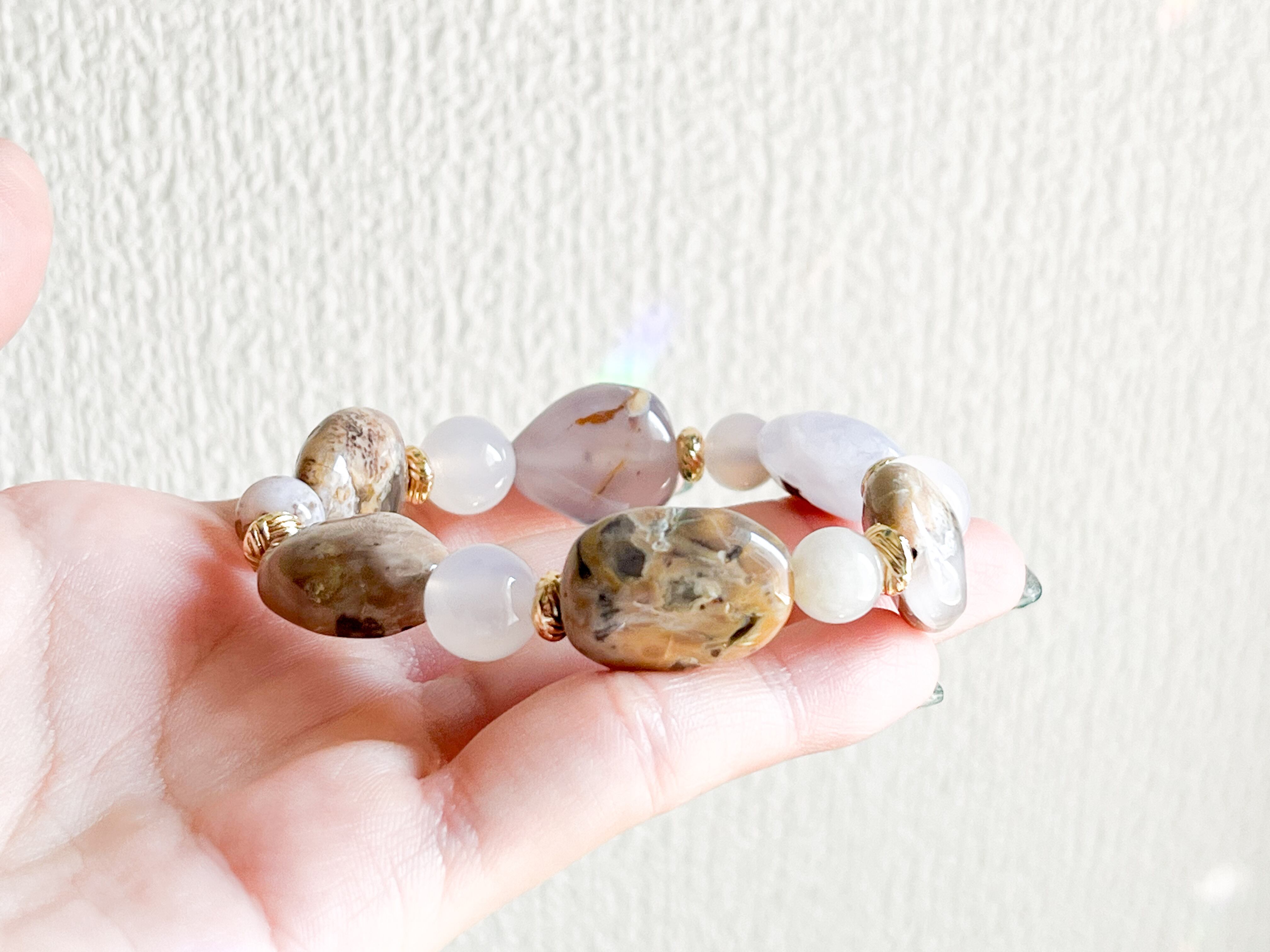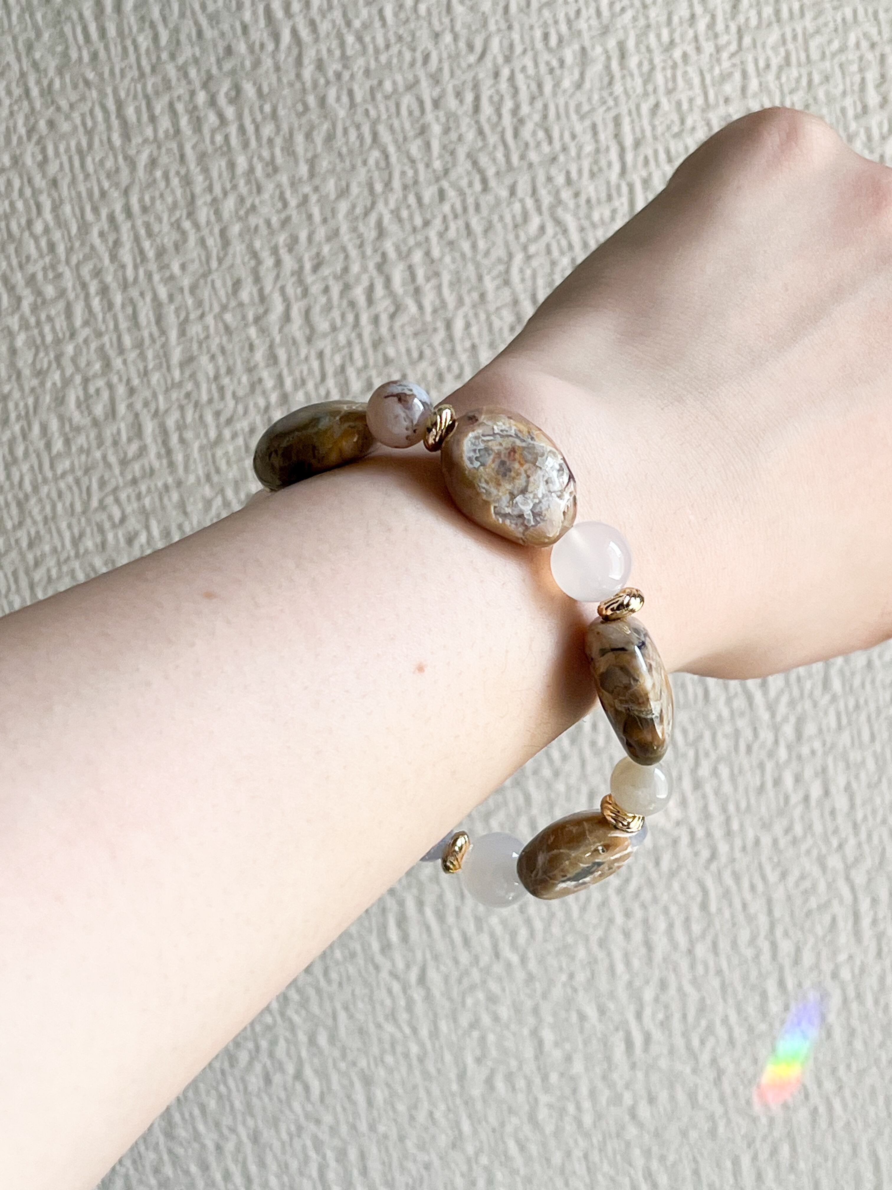 まるで大地の記憶と空の祈りを繋ぐような、やさしく包み込むナチュラルストーンブレスレット。