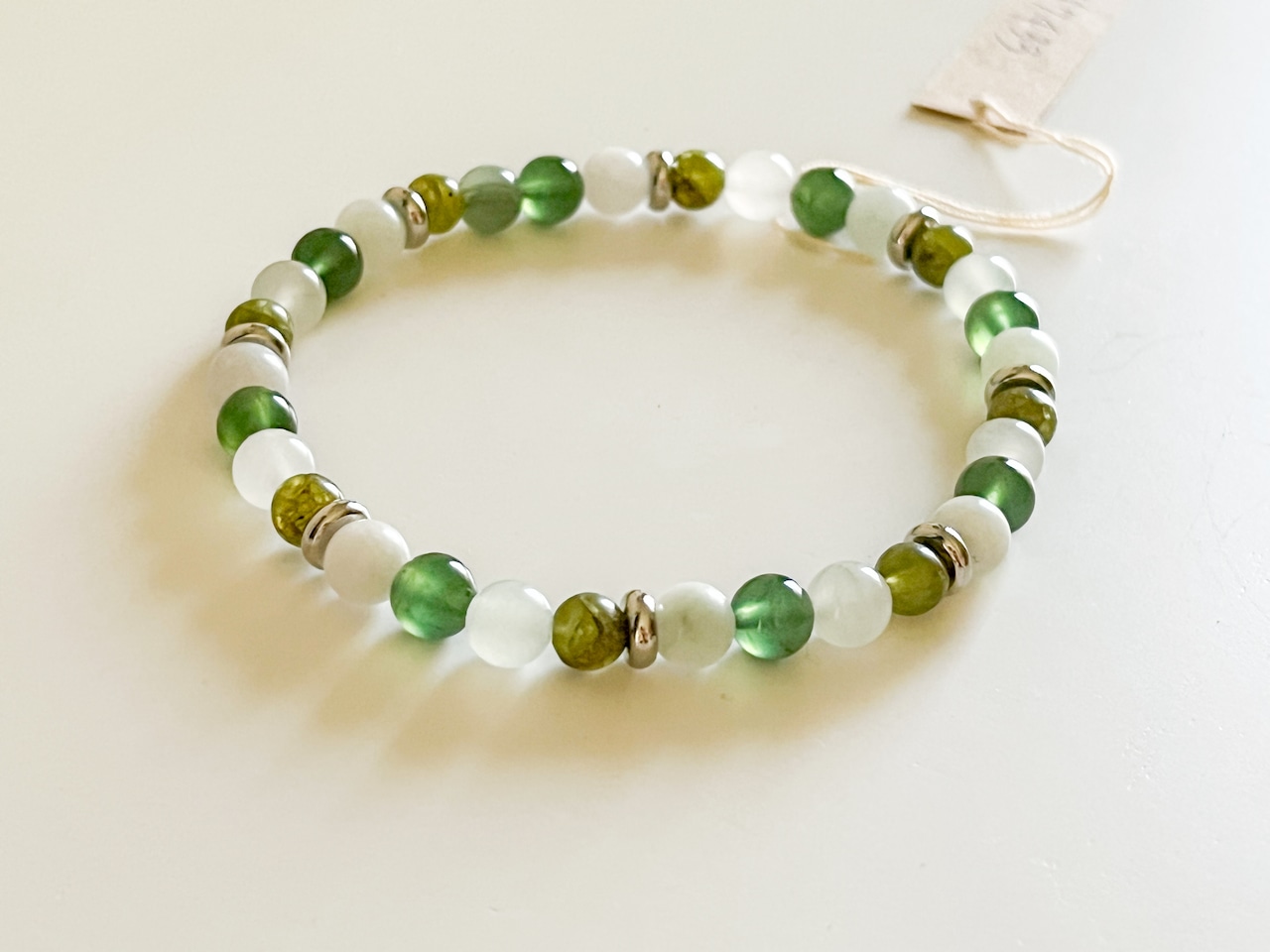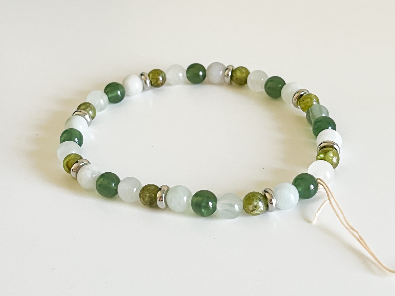 色鮮やかな優雅なサーペンティンとペリドットが調和した、魅力的なデザインのブレスレットです。深い緑色が心を癒し、翡翠の柔らかな色合いがさらなる華やかさを添えます。このブレスレットを身につけることで、内なる平和を感じ、日常が一層輝くことでしょう。