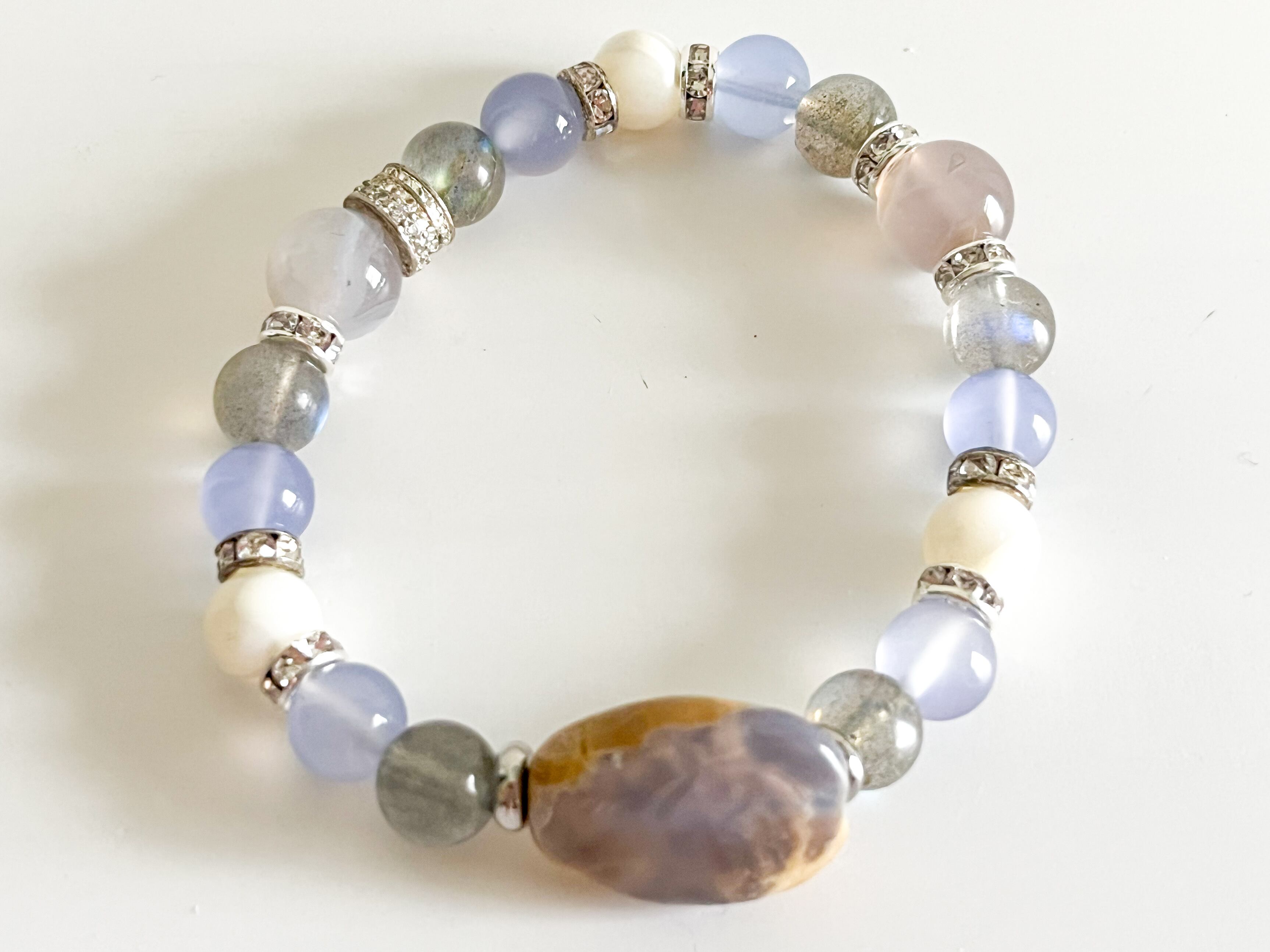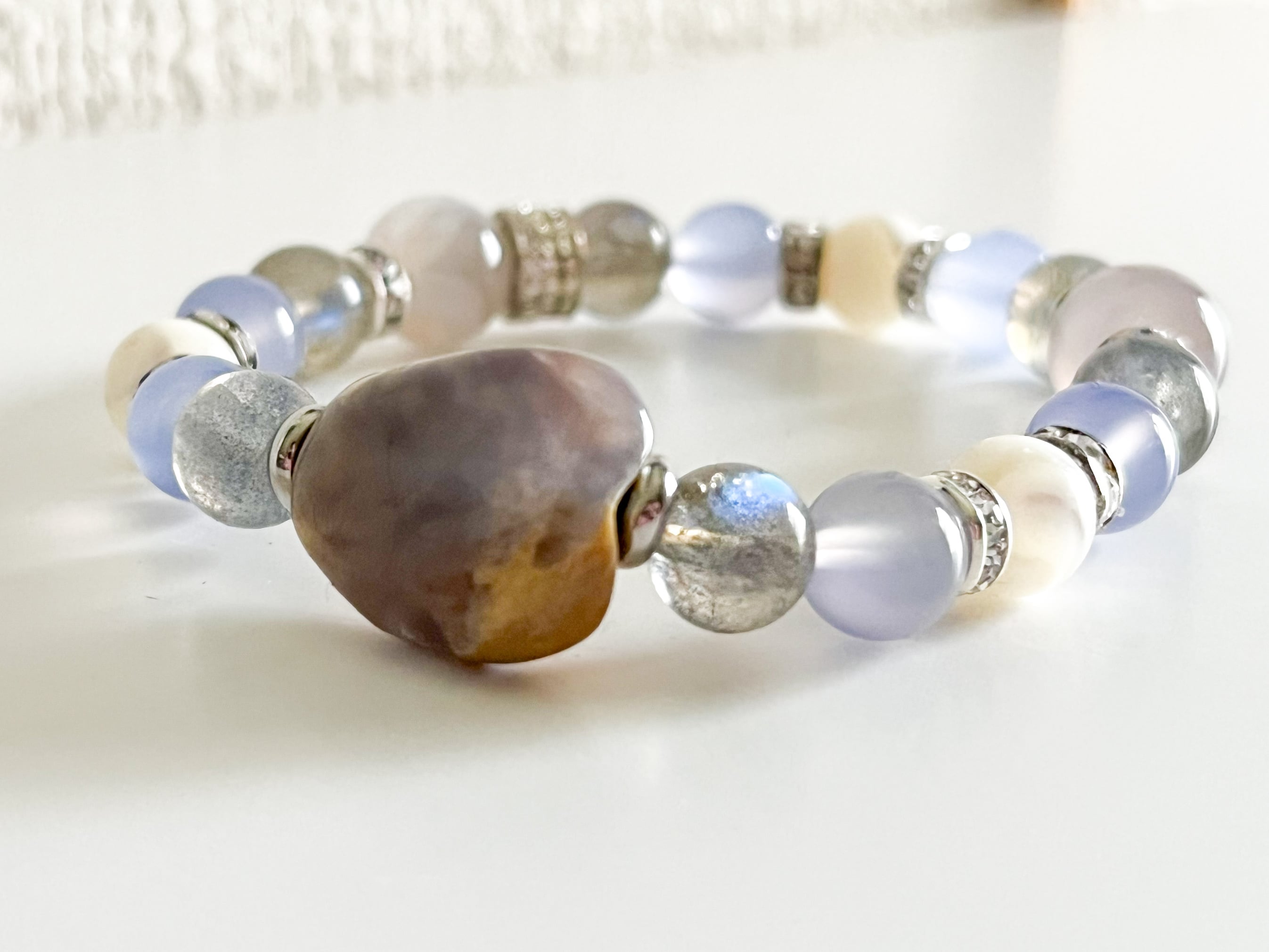 神秘的な母岩つきブルーカルセドニーと、美しい光を放つラブラドライトが調和したデザインのブレスレットです。このブレスレットを身につけることで、心が落ち着き、内面的なバランスを感じられることでしょう。ブルーカルセドニーの持つ穏やかなエネルギーと、ラブラドライトの不思議な輝きが、日常をより特別なものに彩ります。
