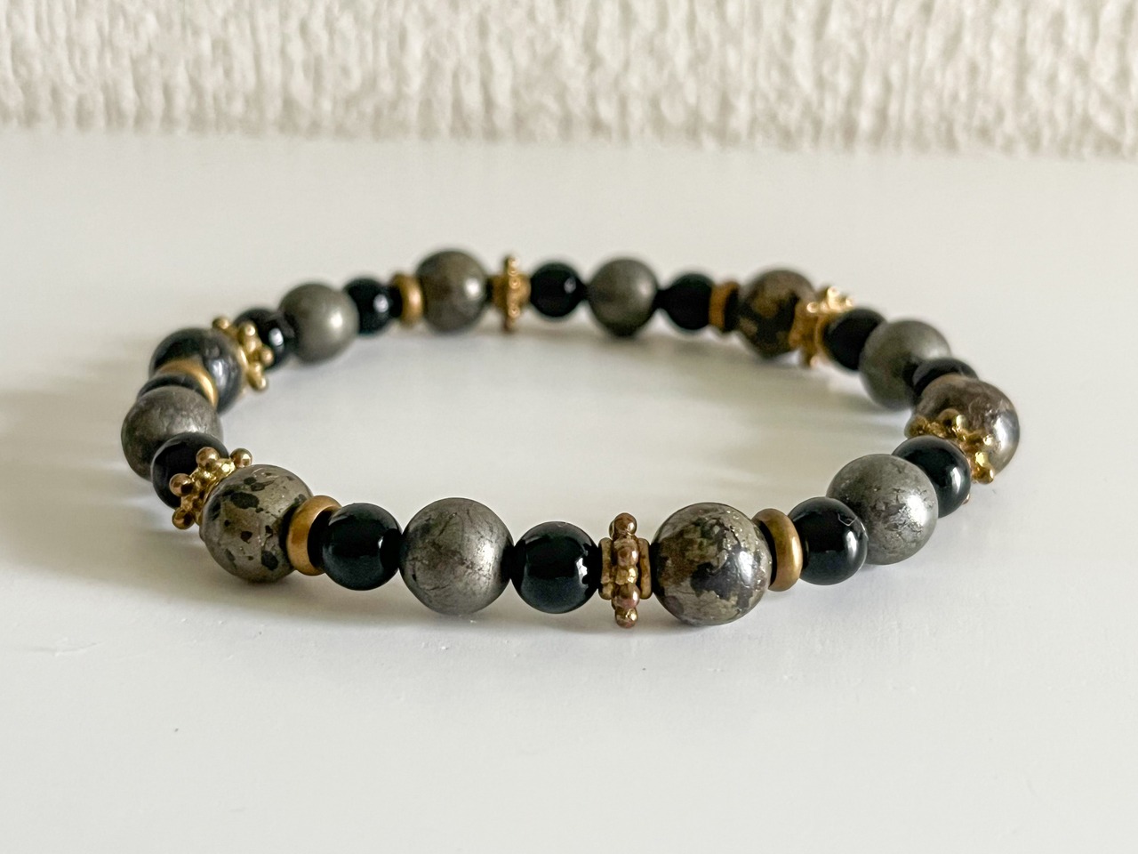 この魅力的な二種類のパイライトのブレスレットは、チベット産モリオンと共に融合し、心に安らぎと力強さを与える素晴らしいアイテムです。