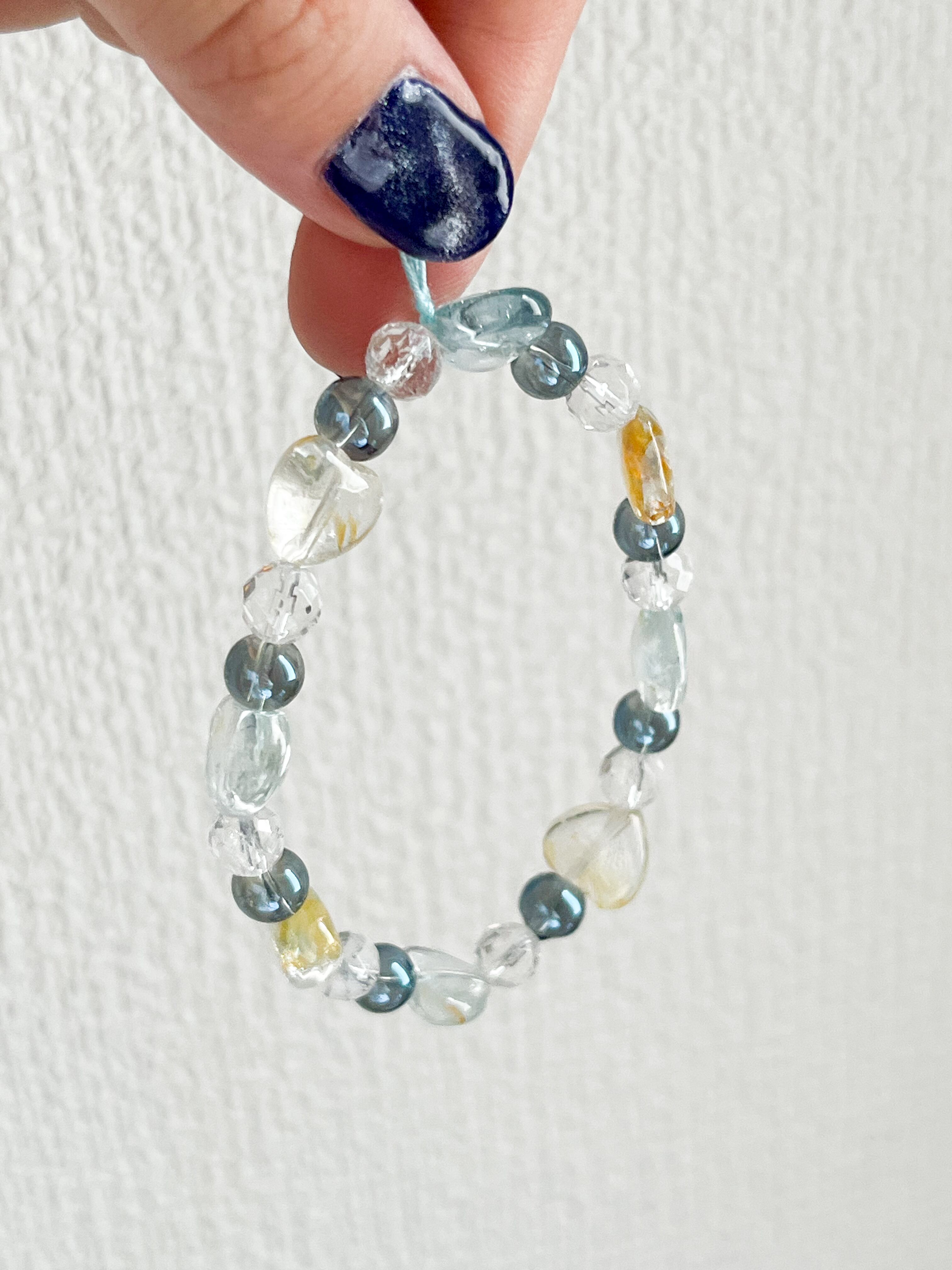 心を明るく照らすブルートパーズとイエロートパーズの美しい組み合わせ。アクアオーラと水晶をあしらったこのブレスレットは、輝きとエネルギーをユーザーに希望をもたらすデザインです!内径15センチの適度なサイズ感で、手首に優しくフィットします。