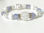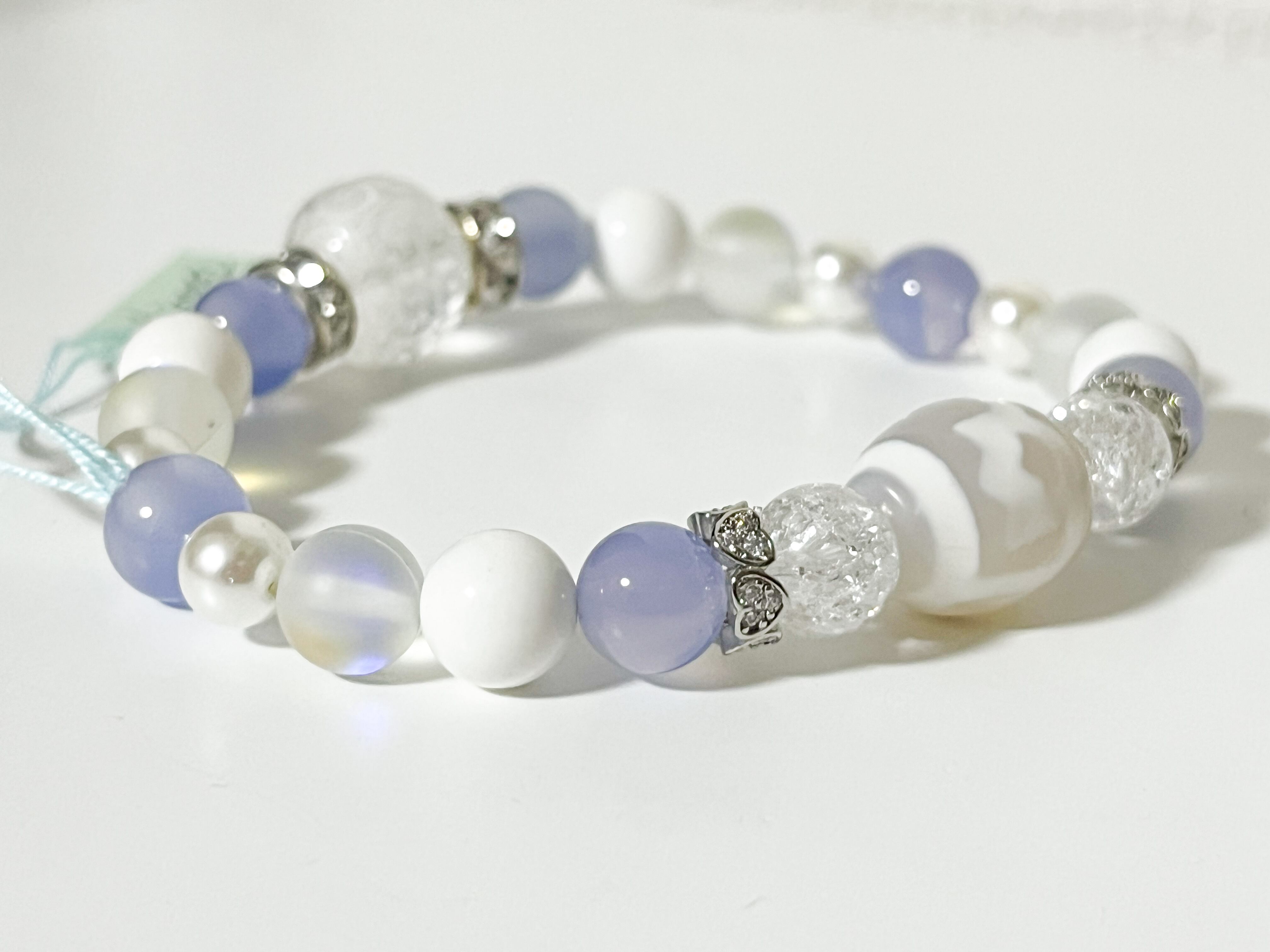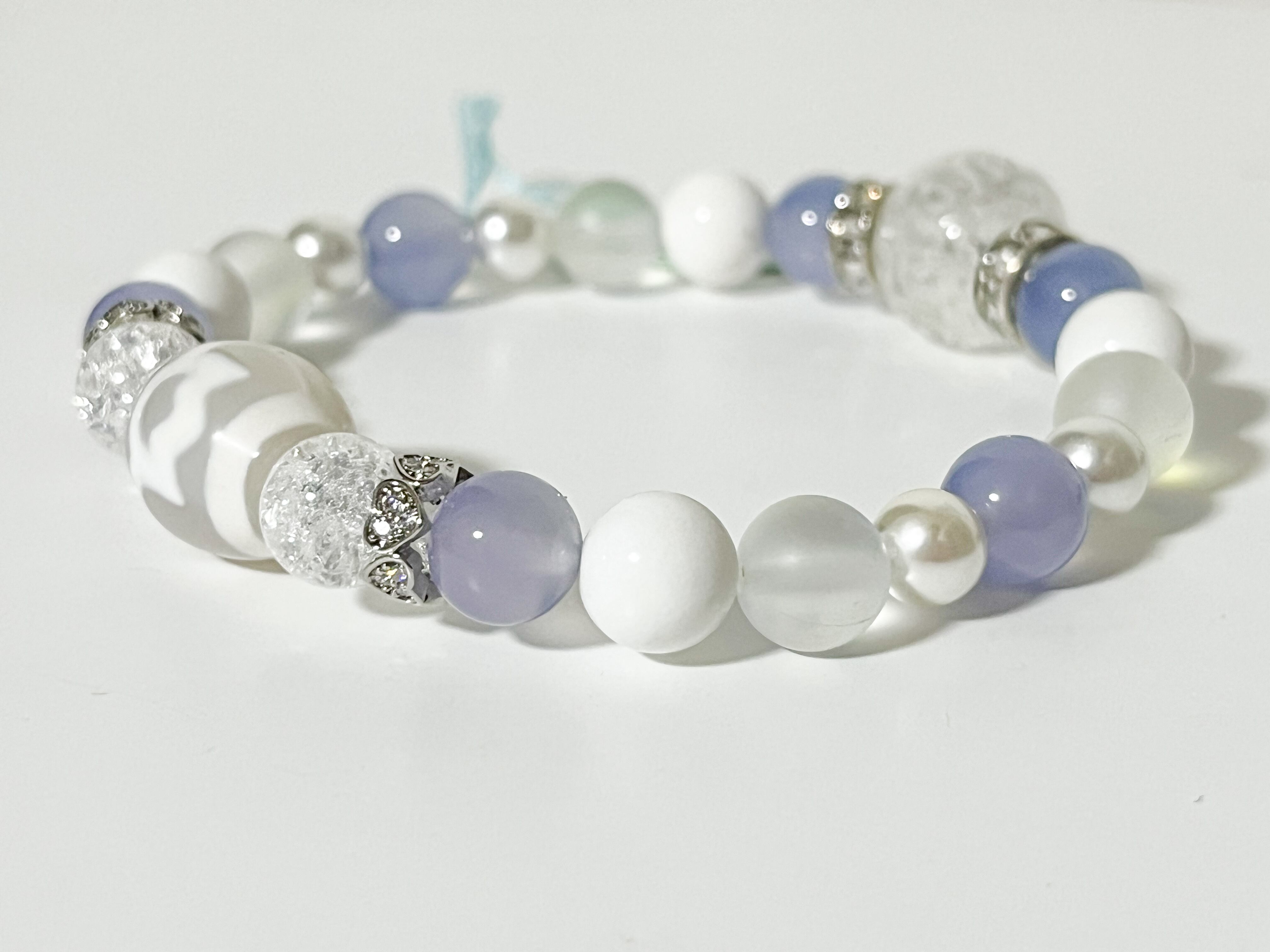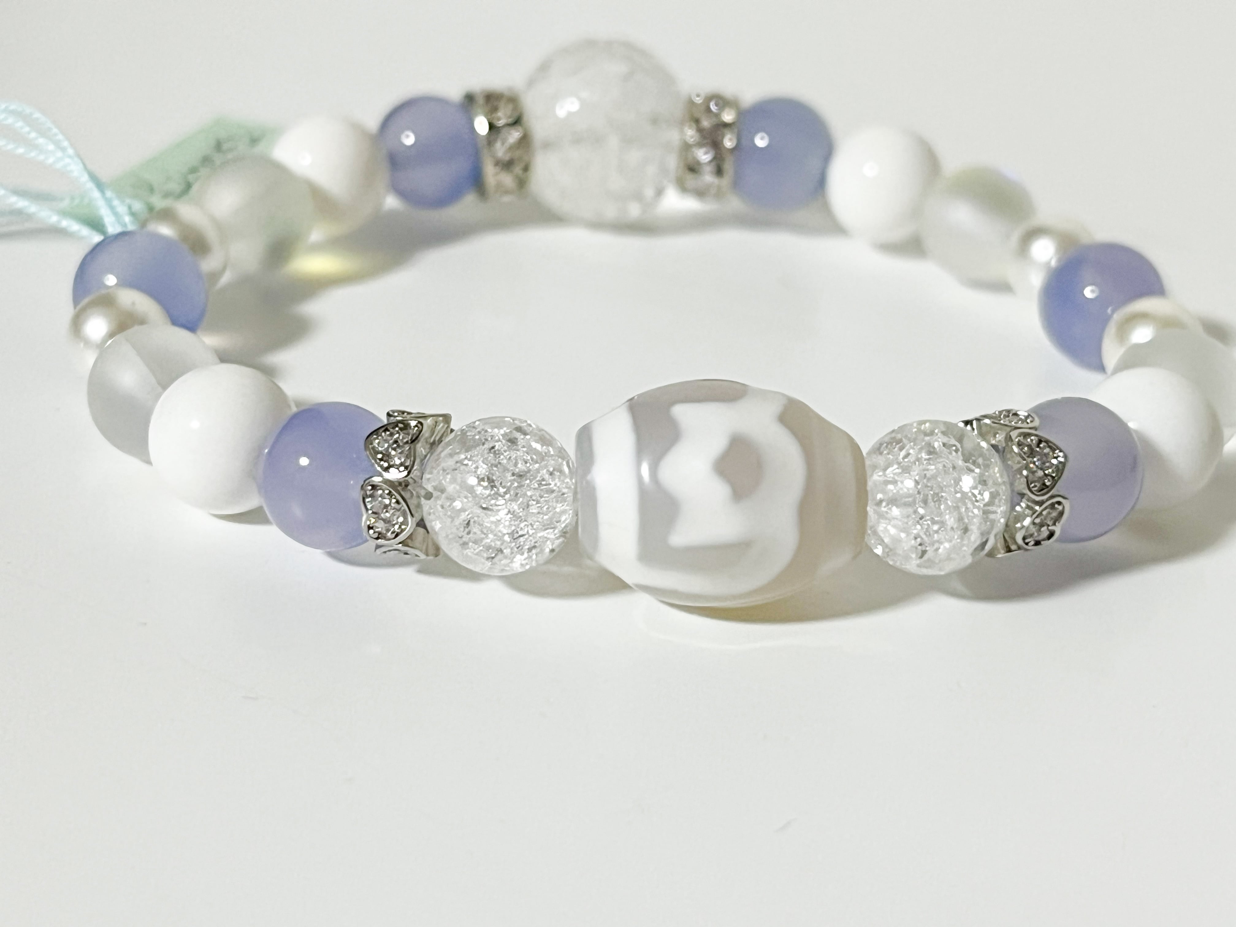 神秘的な白天珠と優雅な水蓮花天珠、さらに美しいブルーカルセドニーが絶妙に組み合わさった魅力的なブレスレットです。それぞれのストーンには深い意味と力が宿り、身に着けることで心身の調和を促進し、日常生活に役立つエネルギーをもたらしてくれます。