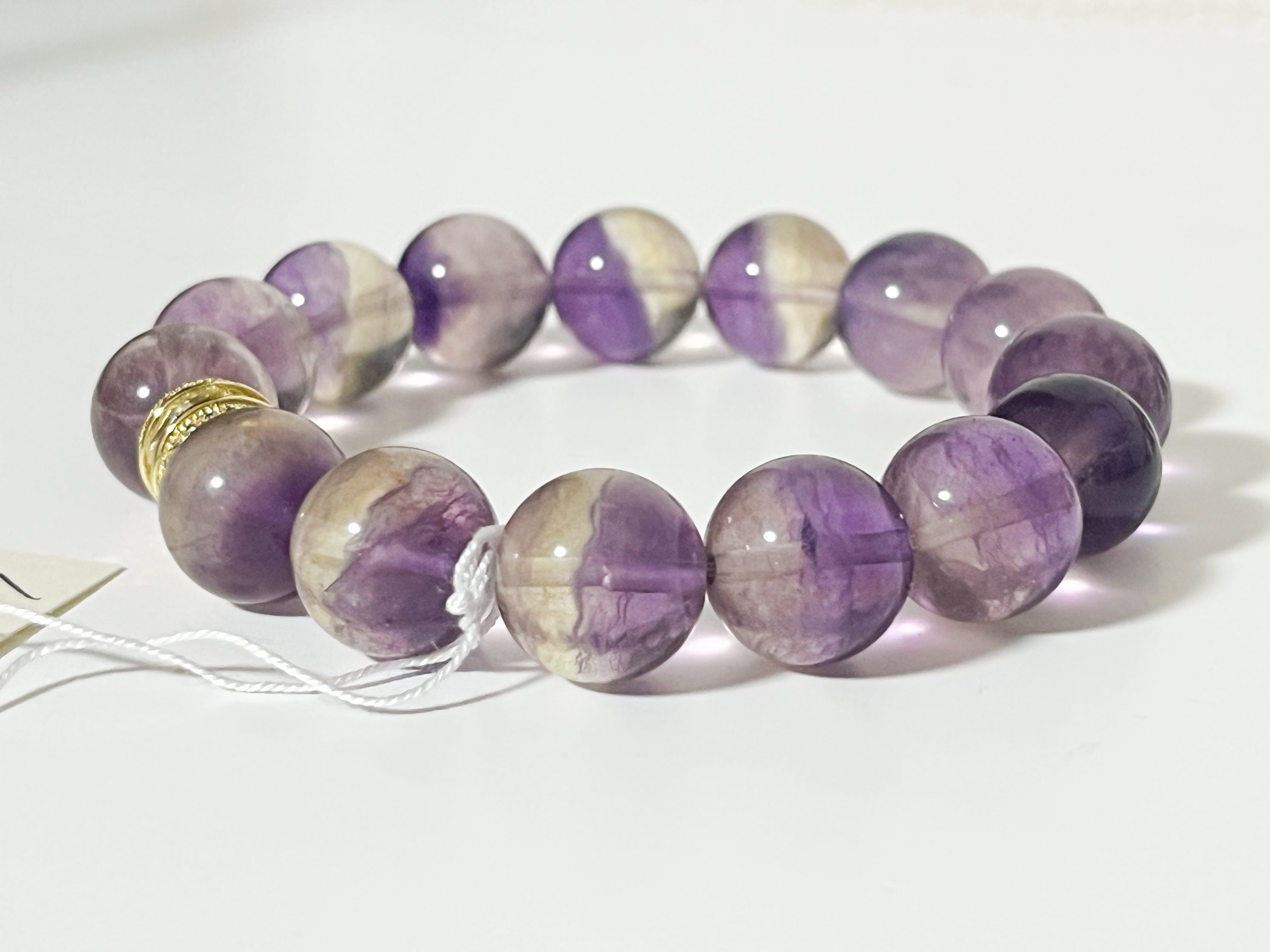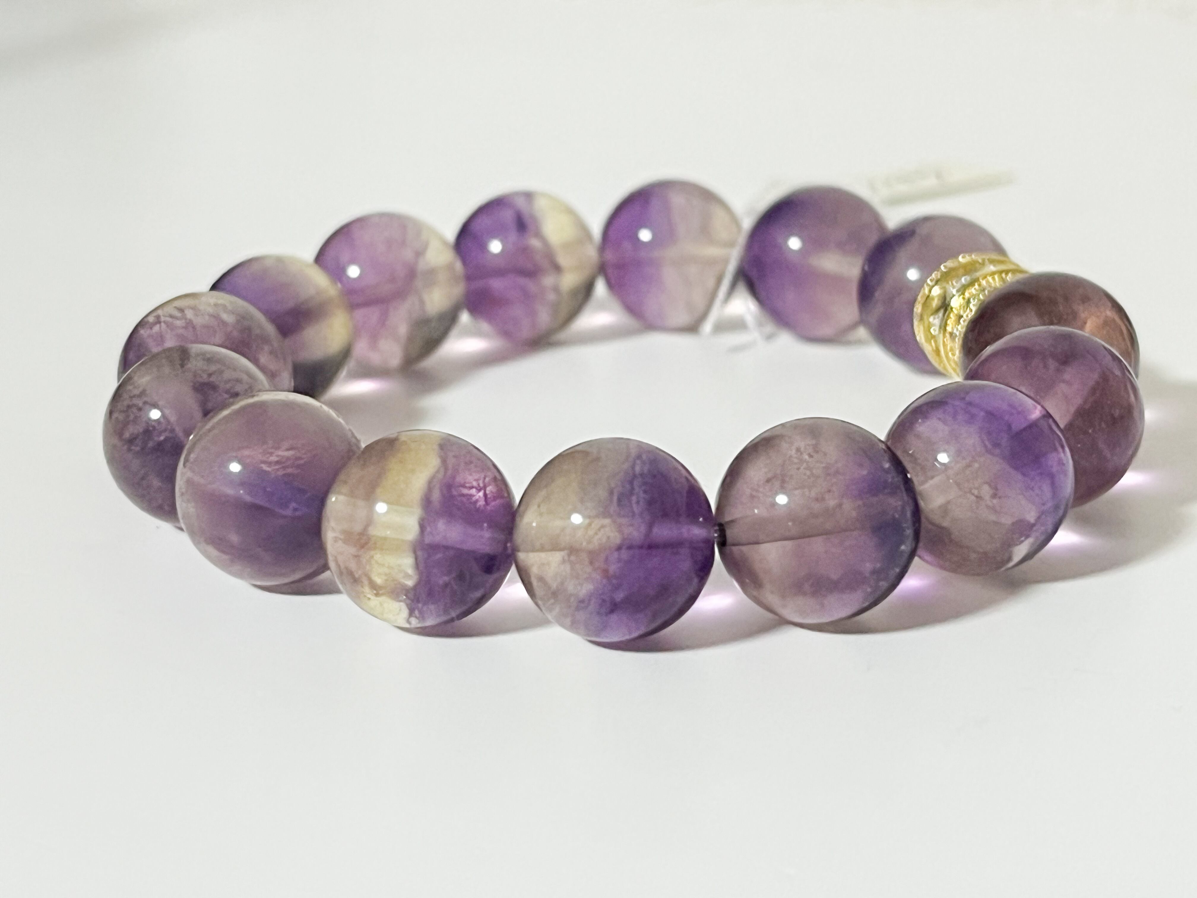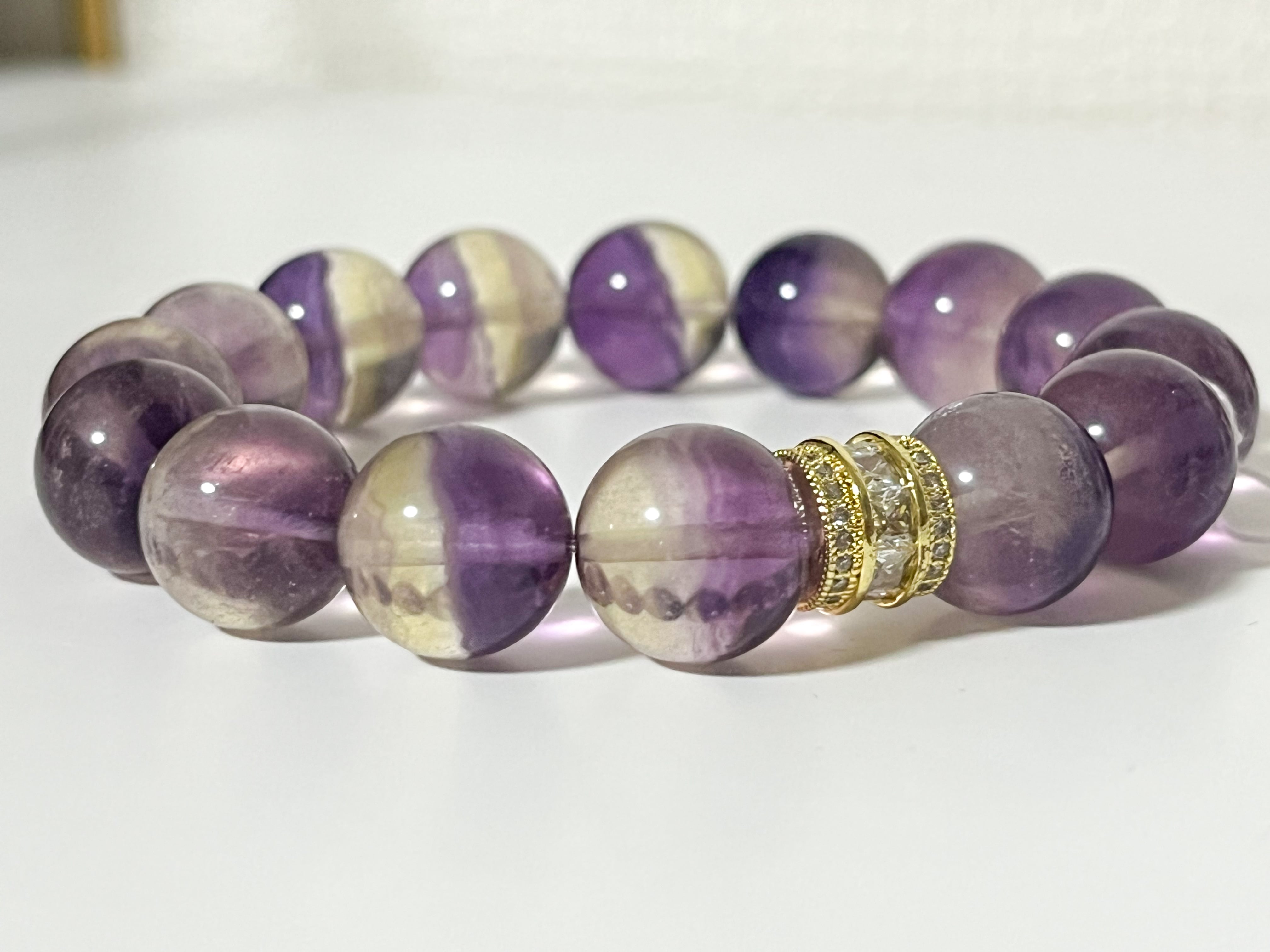 紫と明るい黄が織りなす高発色のバイカラー・フローライトが、目を引く美しいブレスレットです。直感力を高め、心を豊かにすることをサポートします。珍しいお石なので、身に着けることで周囲からの注目を集めること間違いなしです。