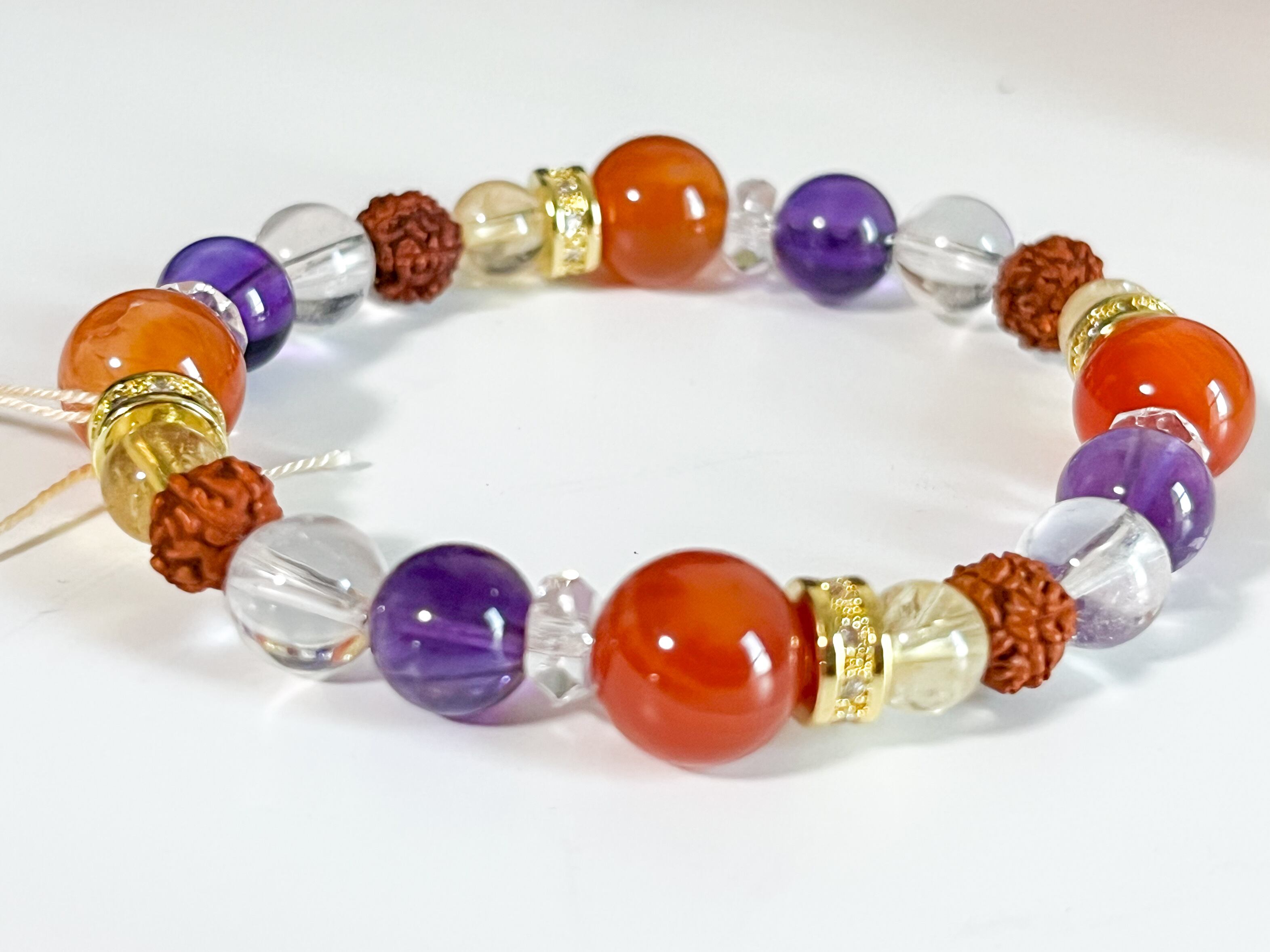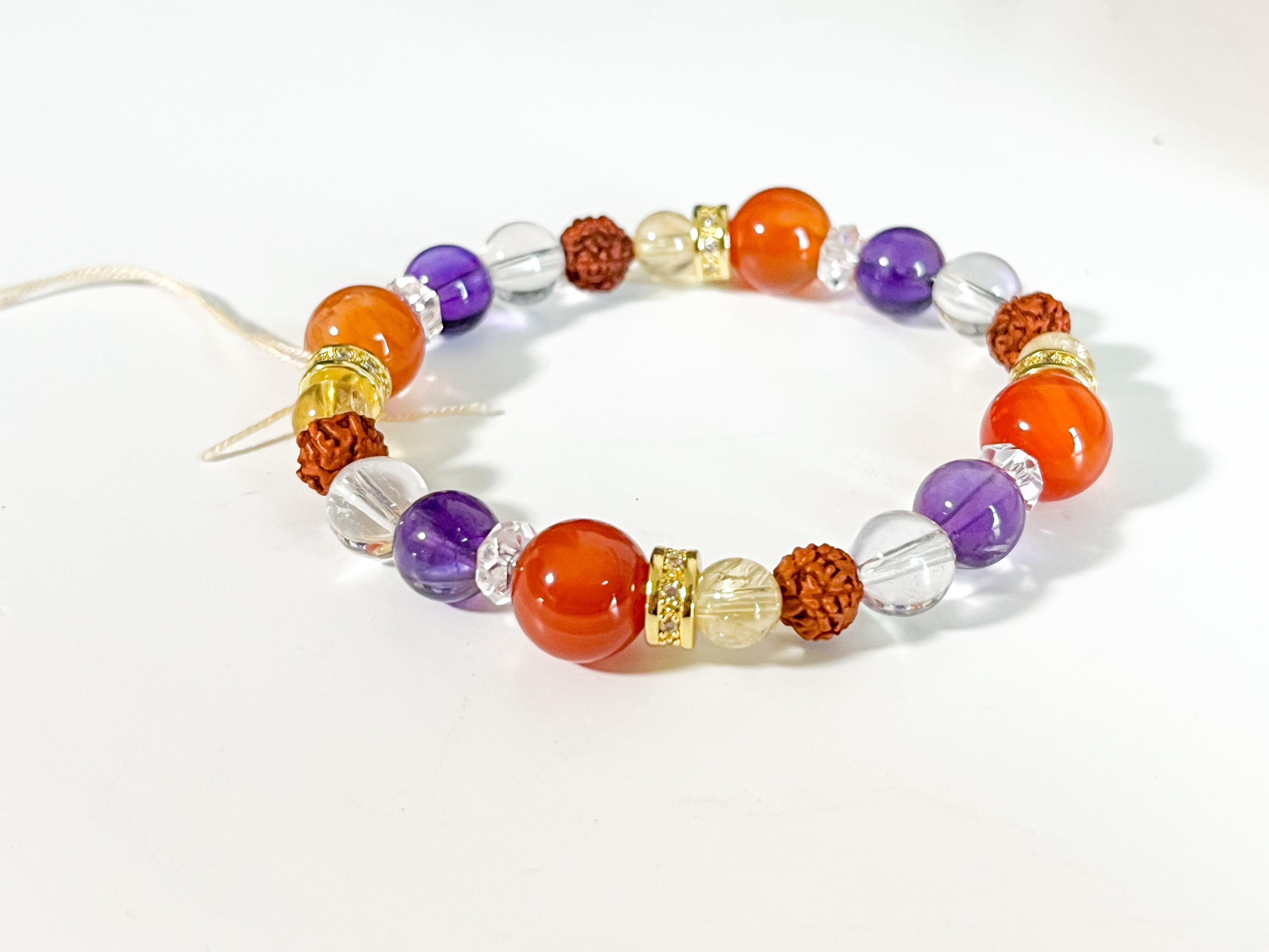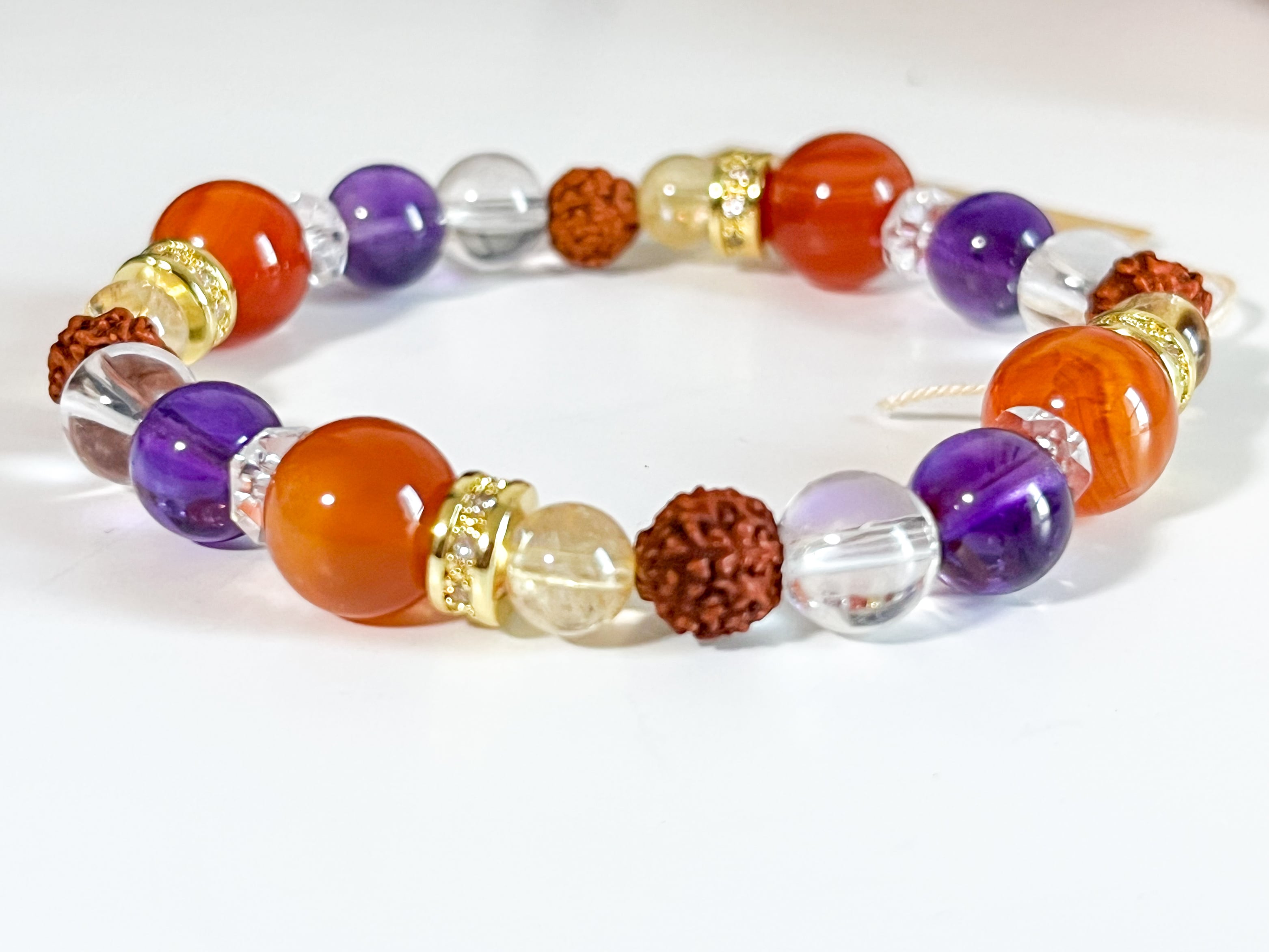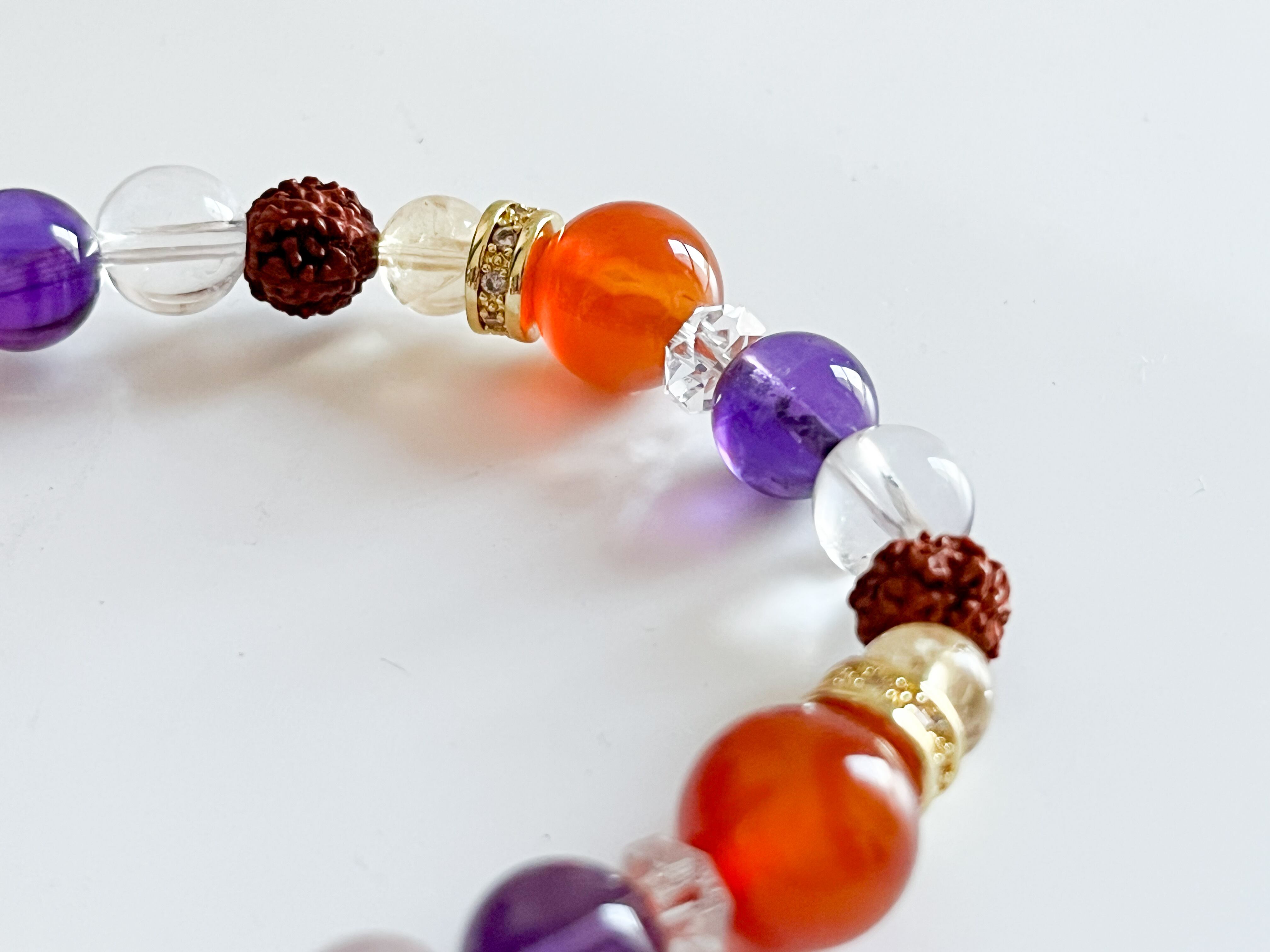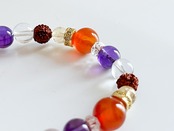 魅力的なカーネリアンとアメシストの組み合わせが美しい、秋の訪れを感じさせるブレスレットです。はっきりとしない色合いのブレスレットで日々のコーディネートに彩りを加えられます。