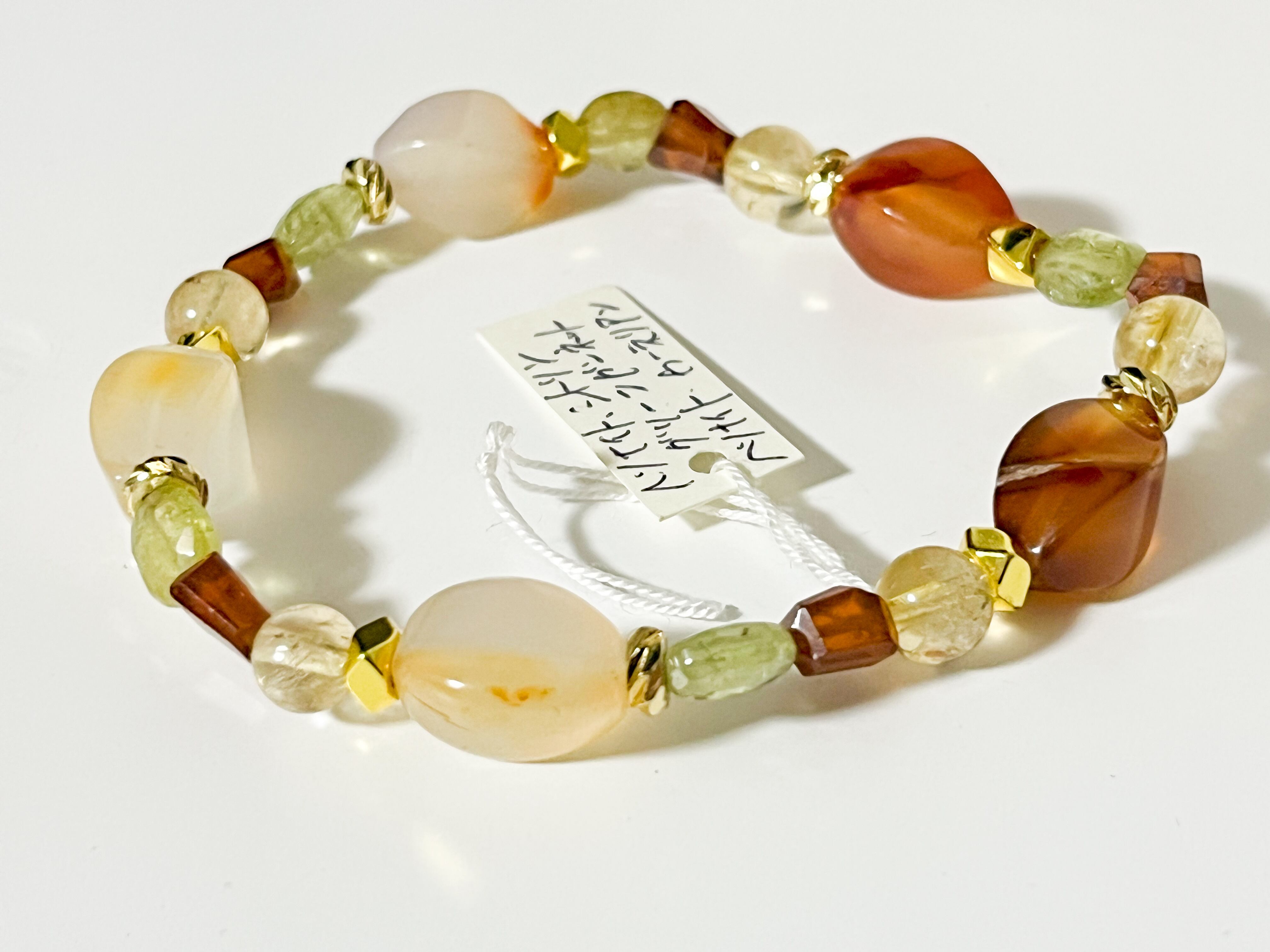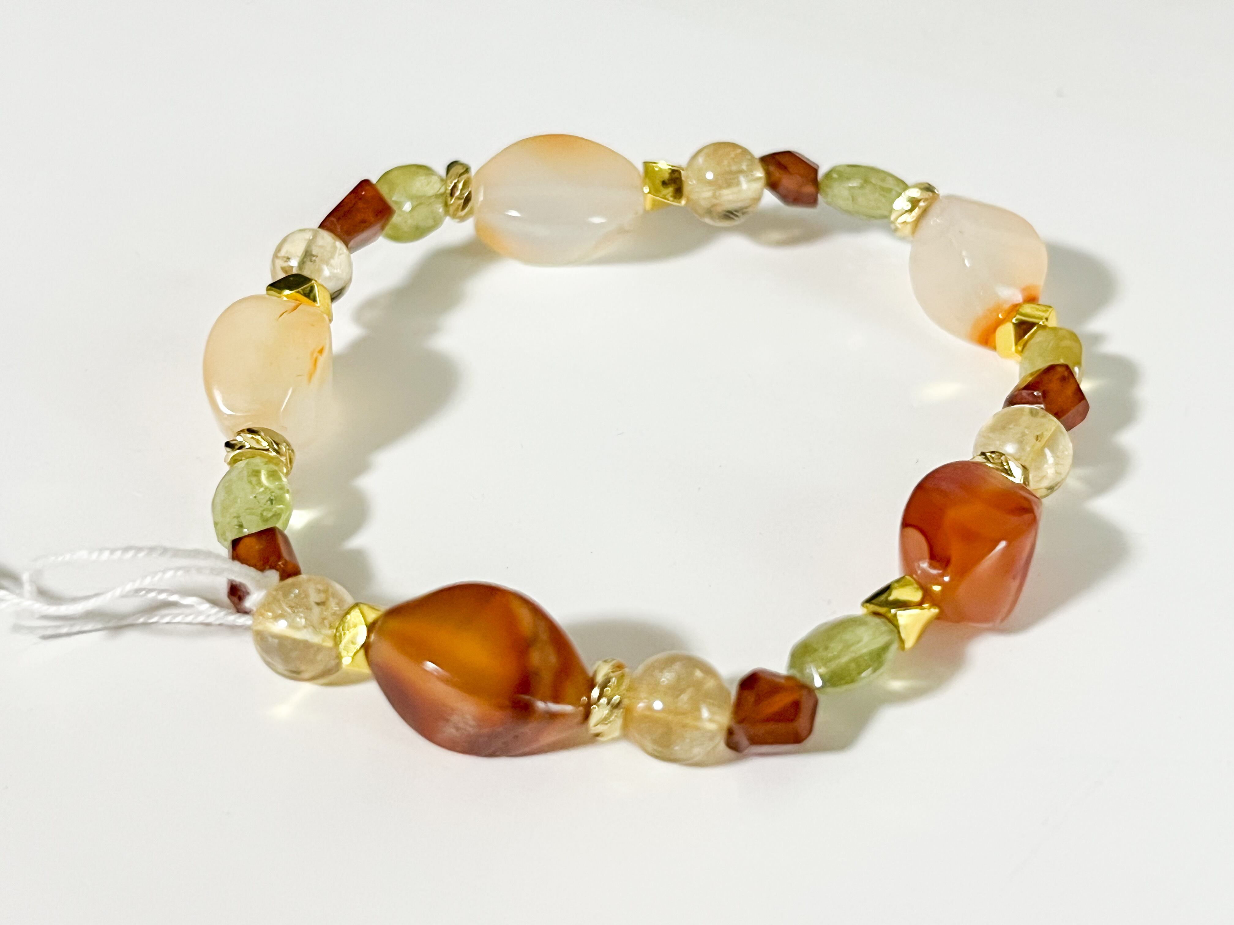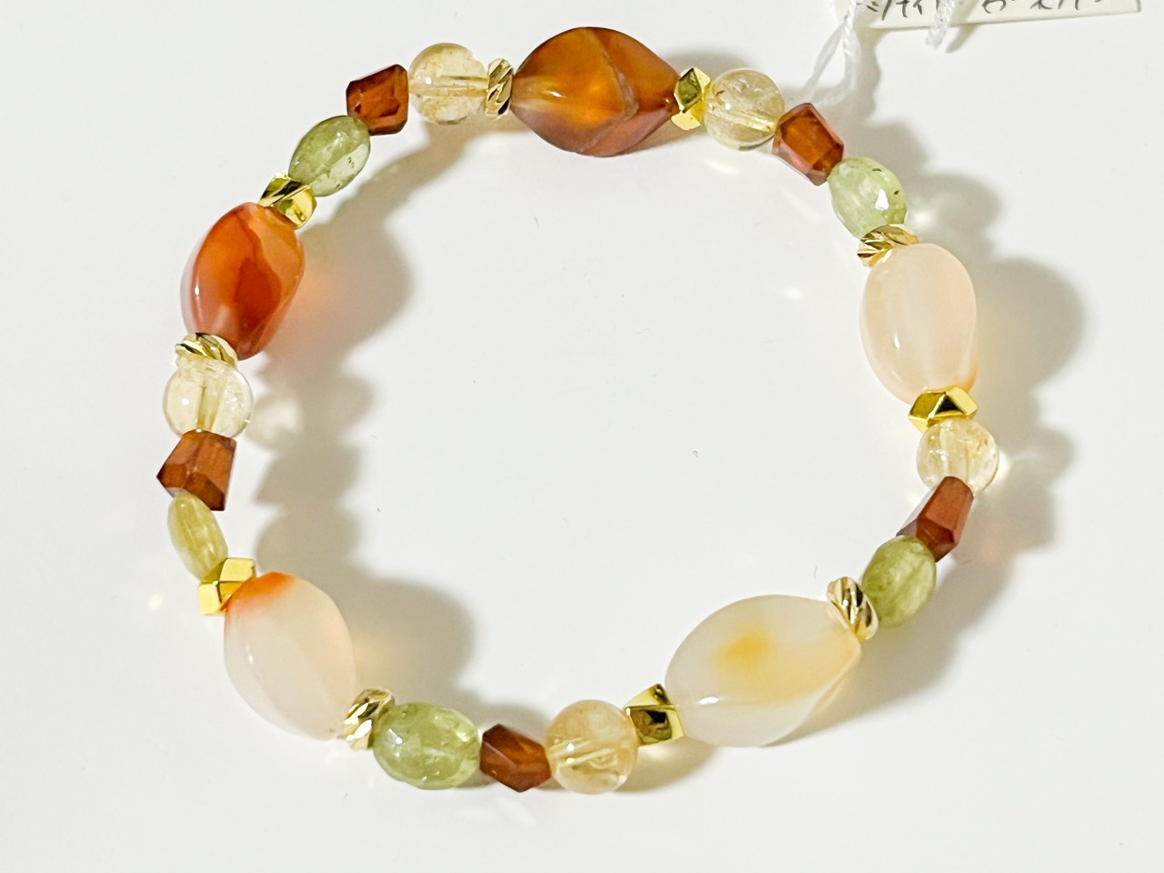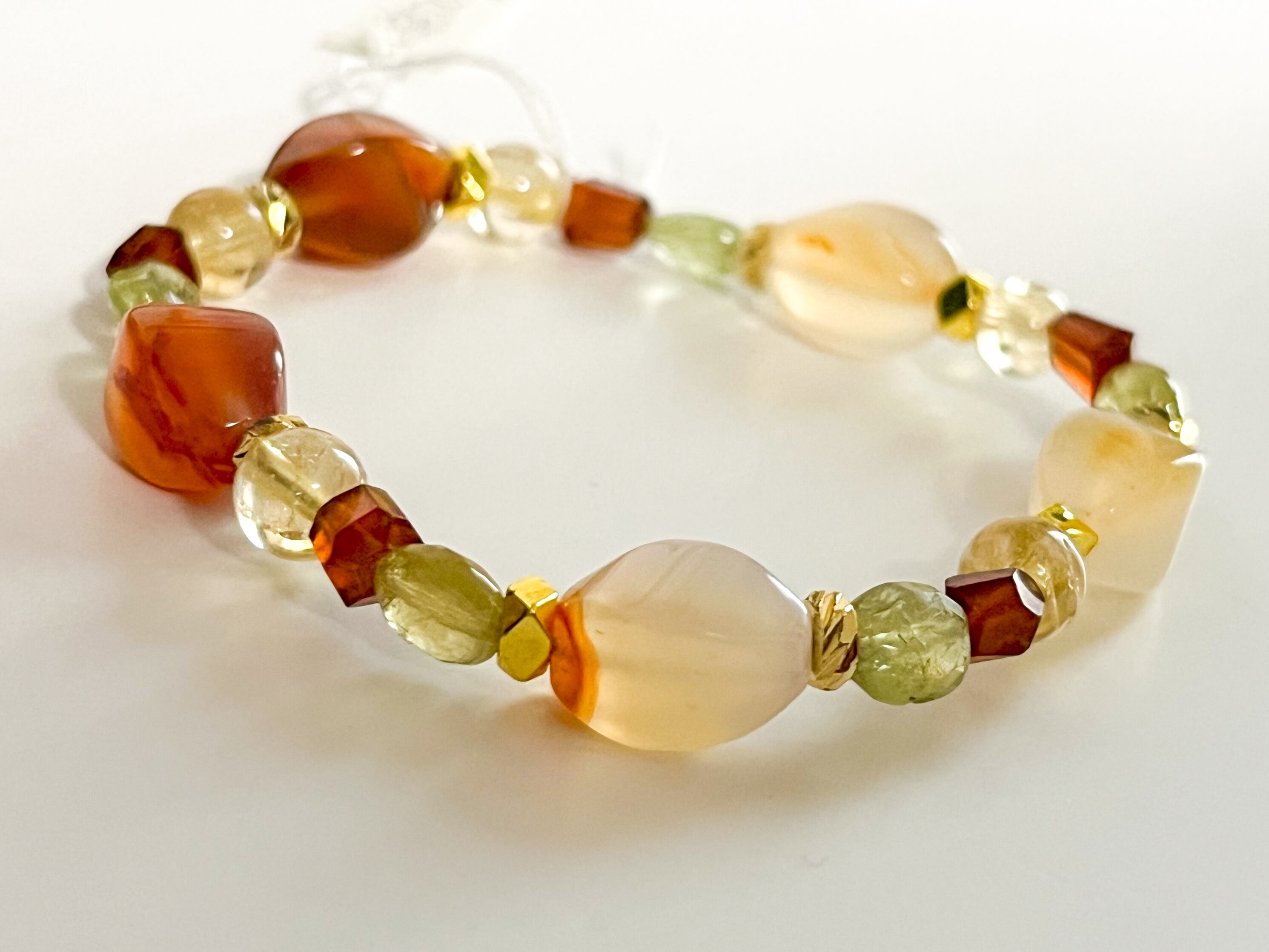 魅力的なカーネリアンとグリーンガーネット、シトリン、ヘソナイトが織りなす、色彩豊かなブレスレットです。これらのストーンが調和し、日常に華やかさをプラスします。