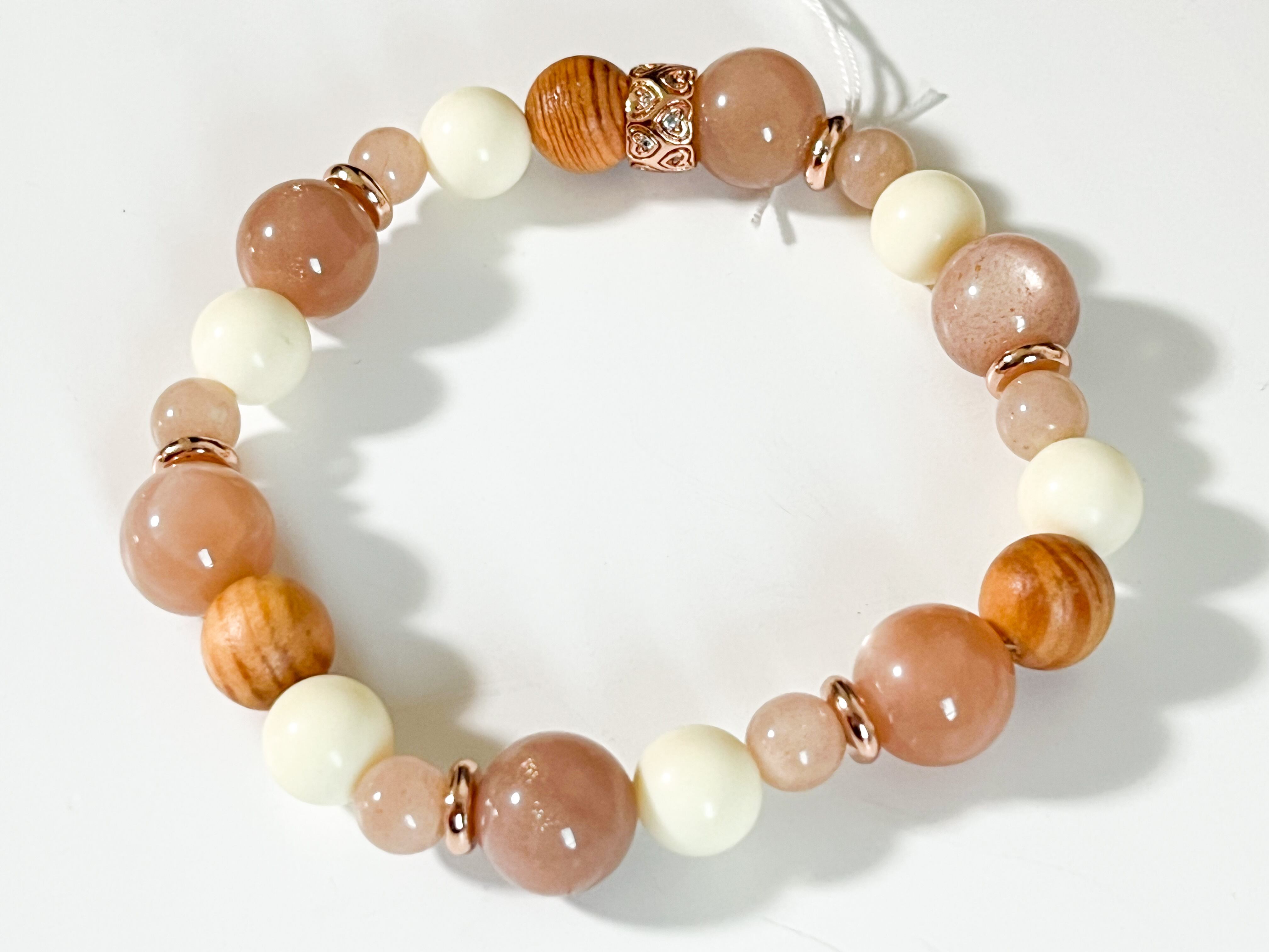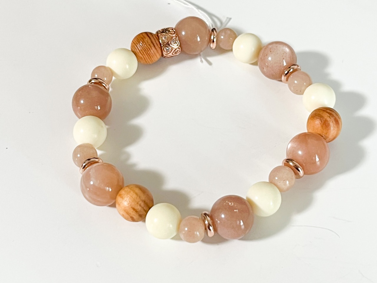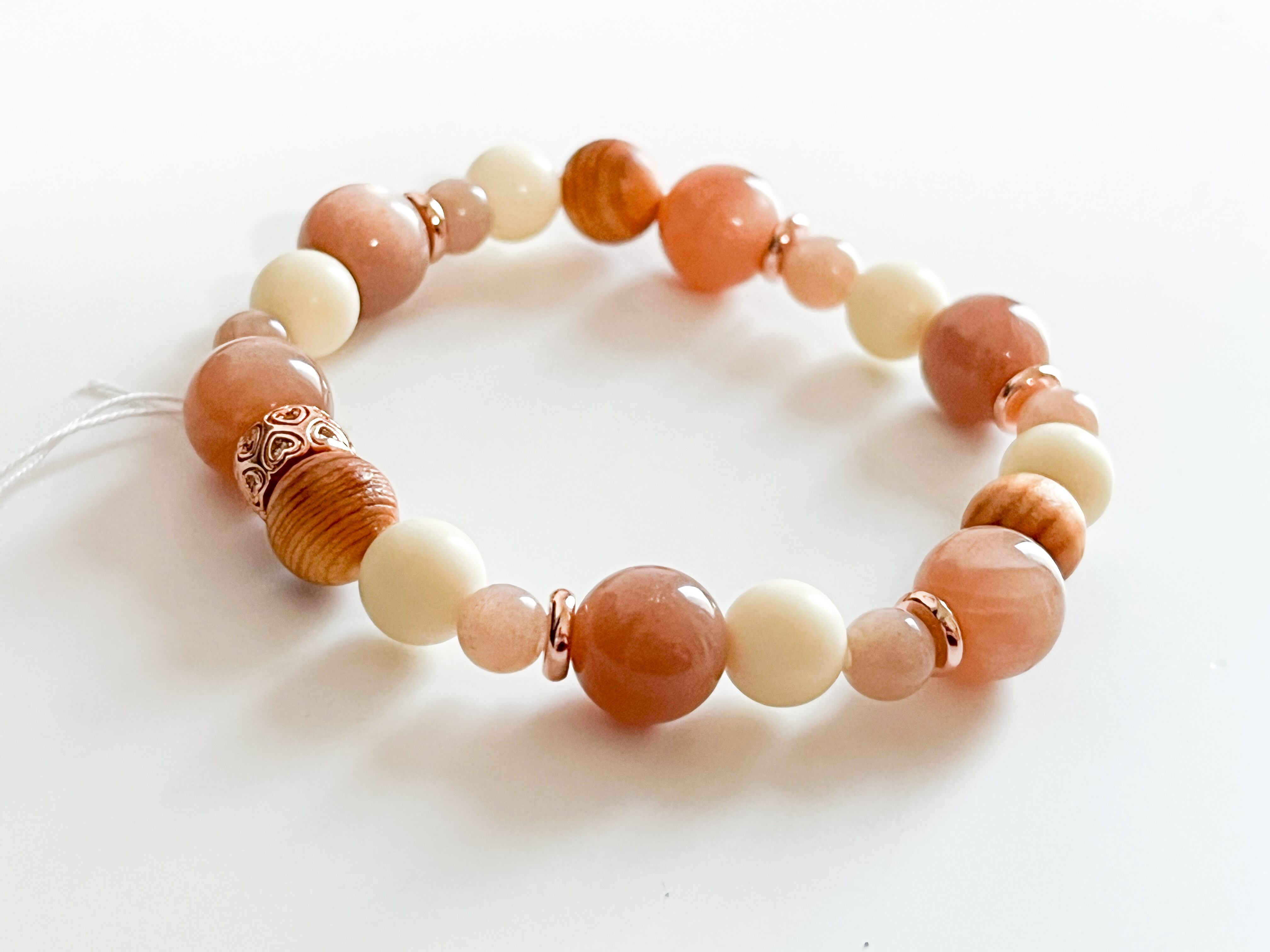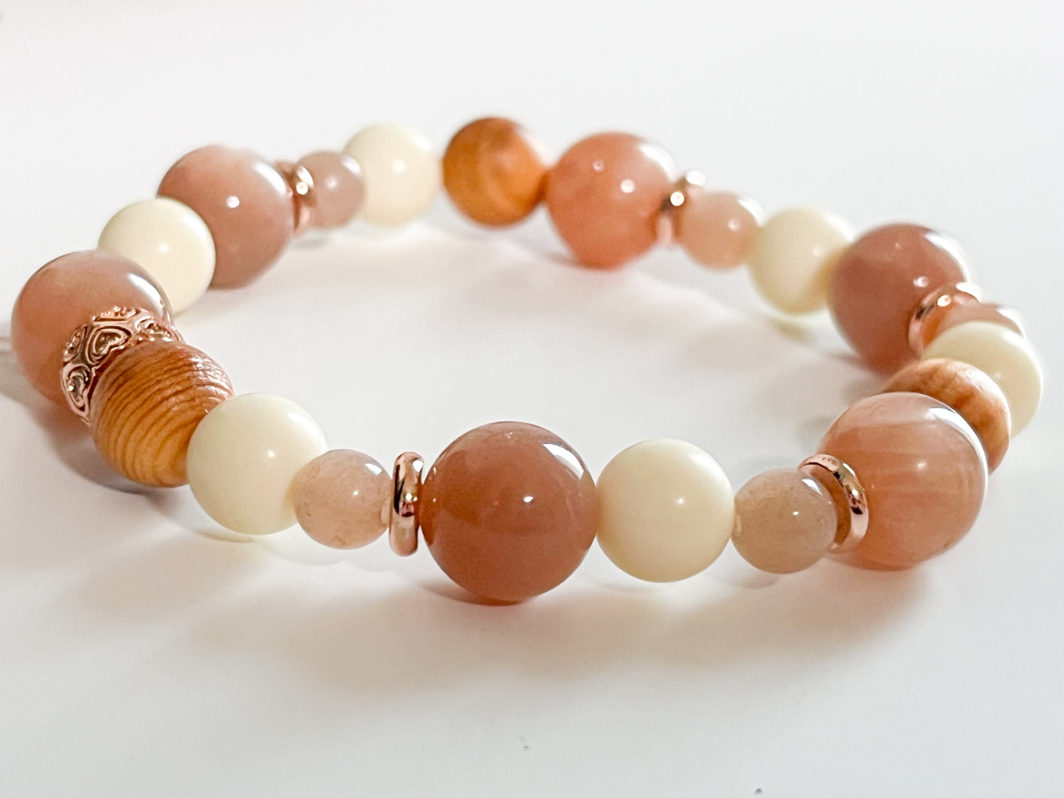 オレンジムーンストーンとヤシの実(象牙椰子)のブレスレットは、温かみのある優しいオレンジ色が特徴の美しいアイテムです。肌馴染みの良いお色で重ね付けにもおすすめです。また、日常のコーディネートに華やかさを加え、心を明るくすることでしょう。