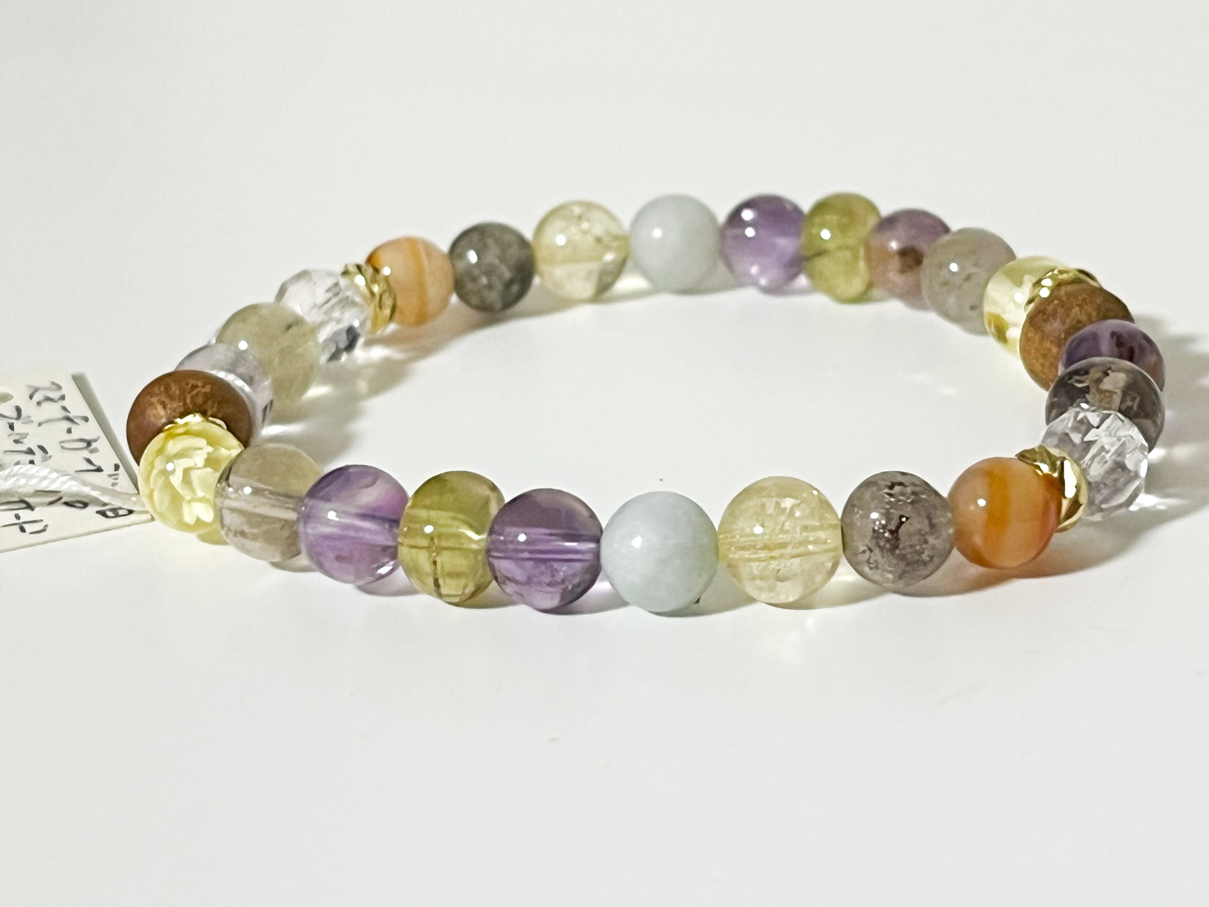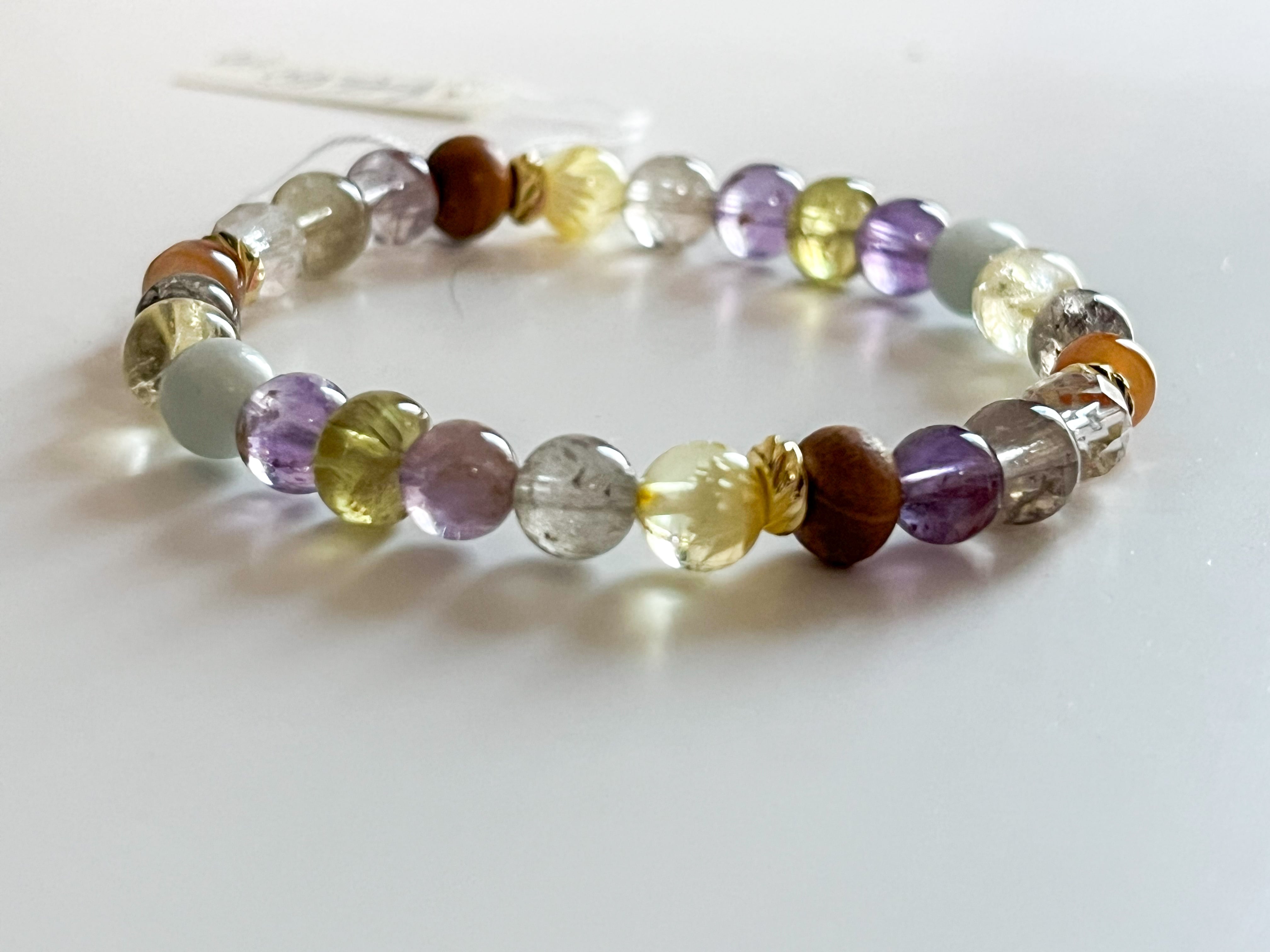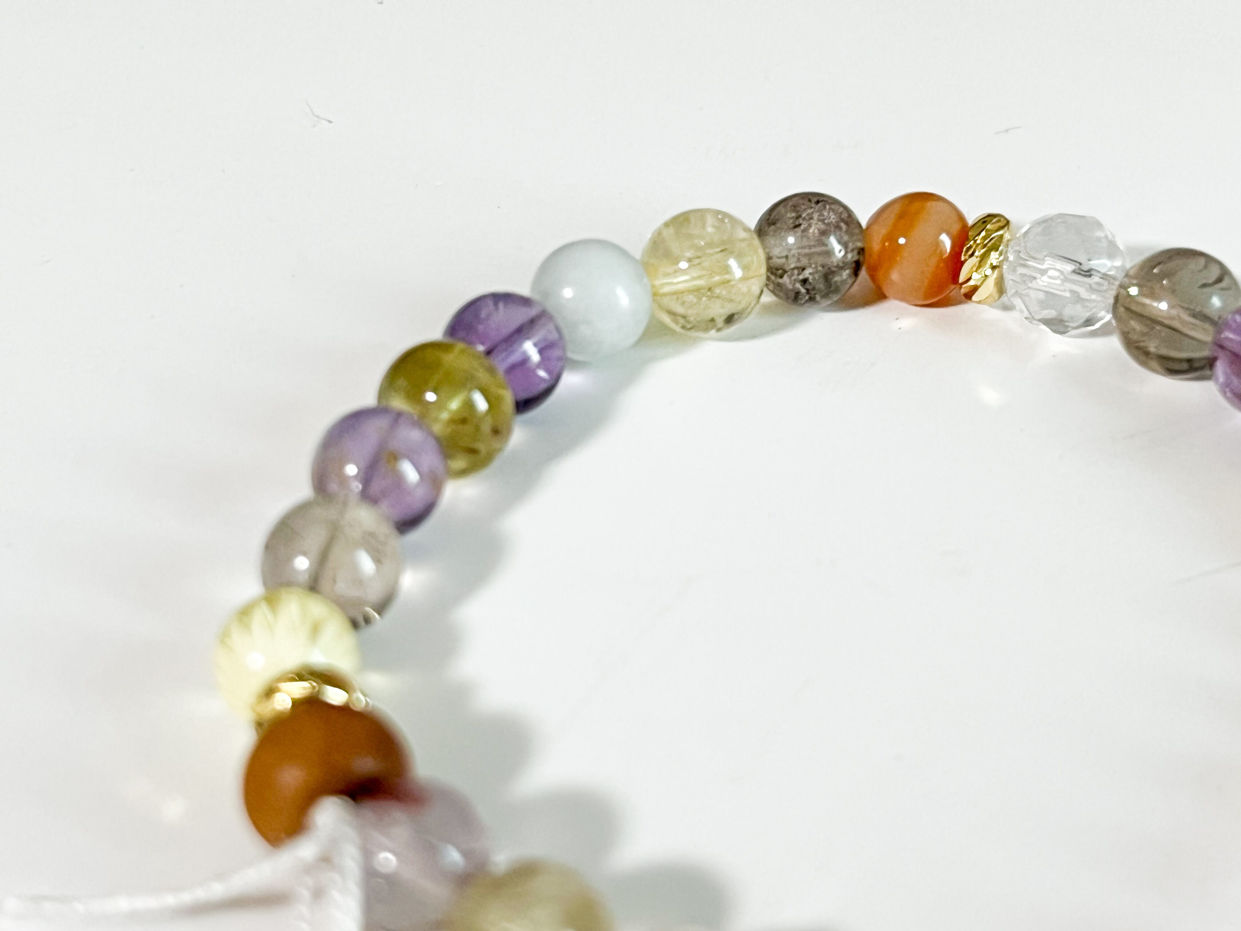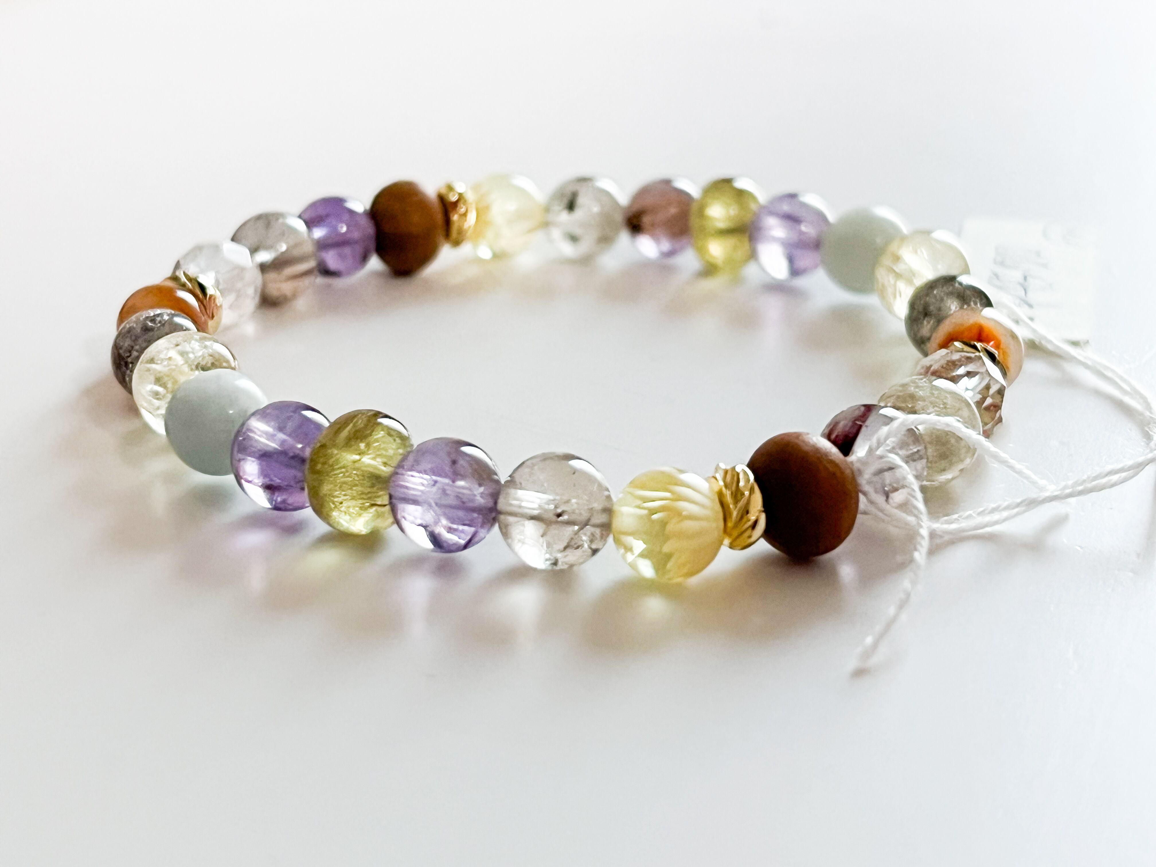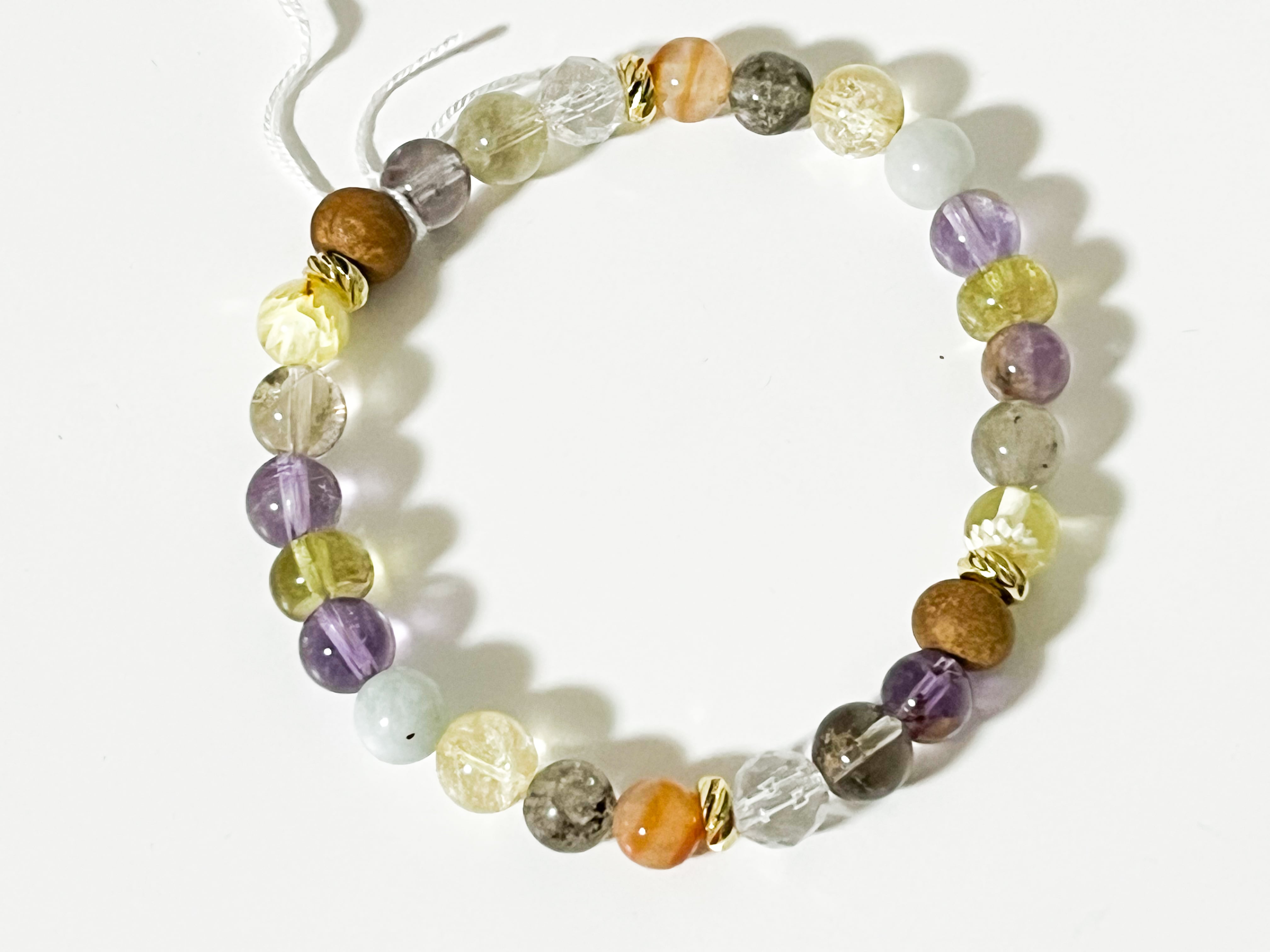 このブレスレットは、それぞれの石が放つエネルギーが心に安らぎをもたらし、内面的な成長をサポートするパワーストーンとして人気です。