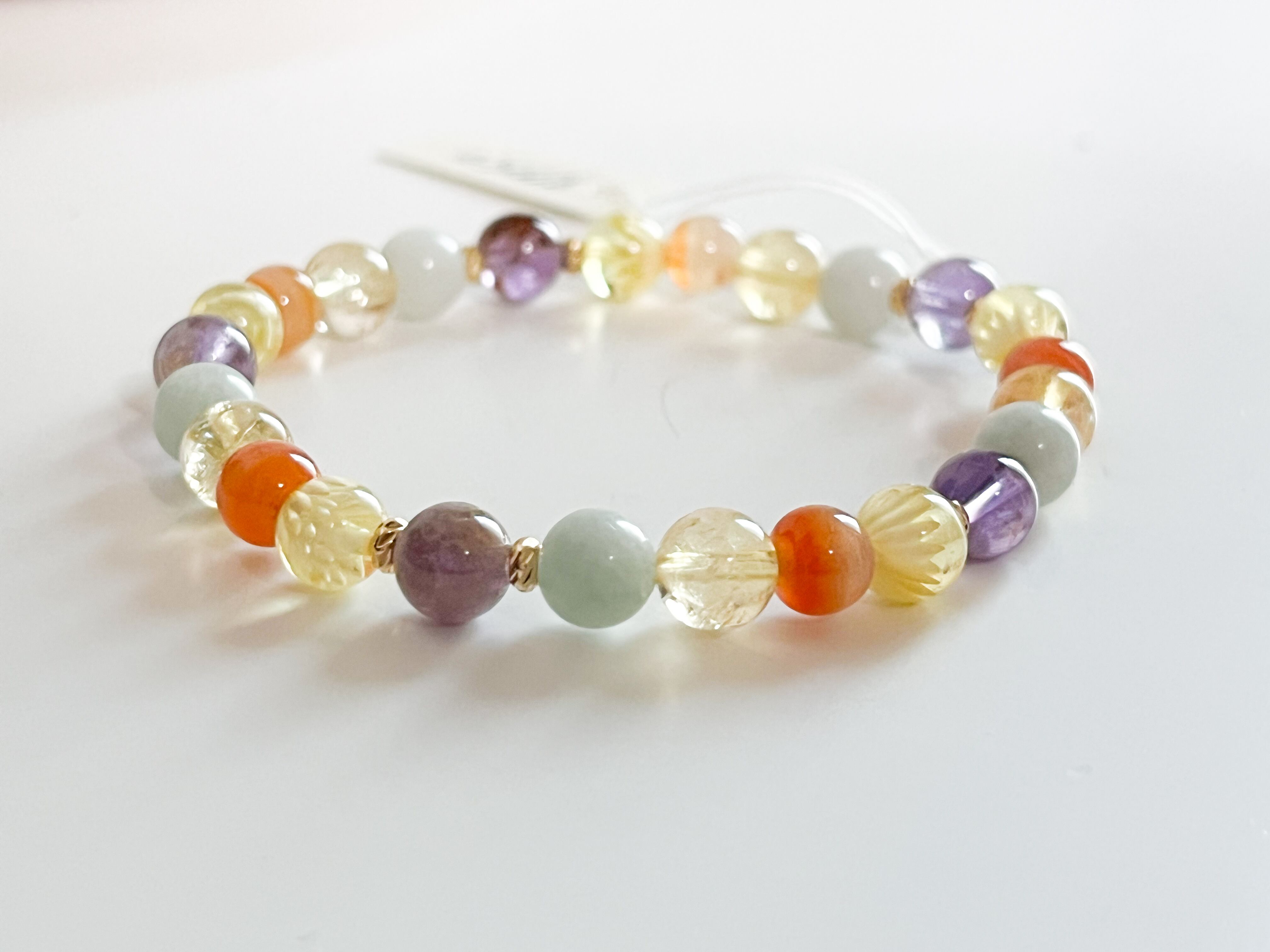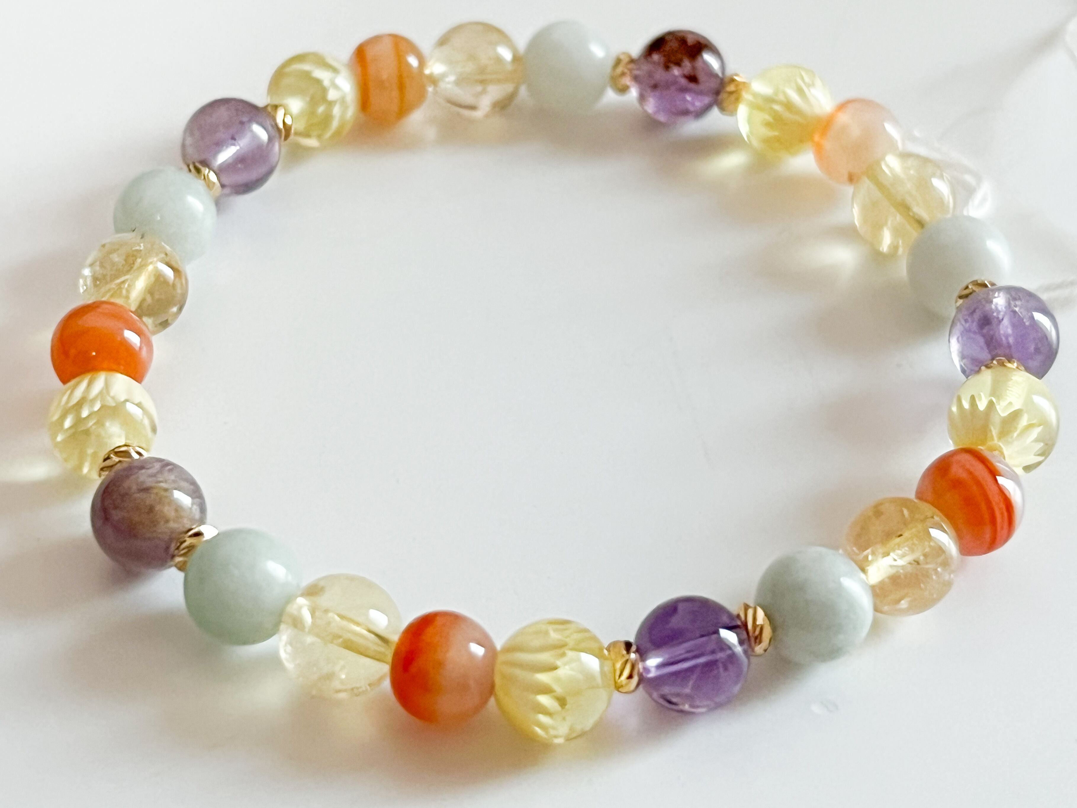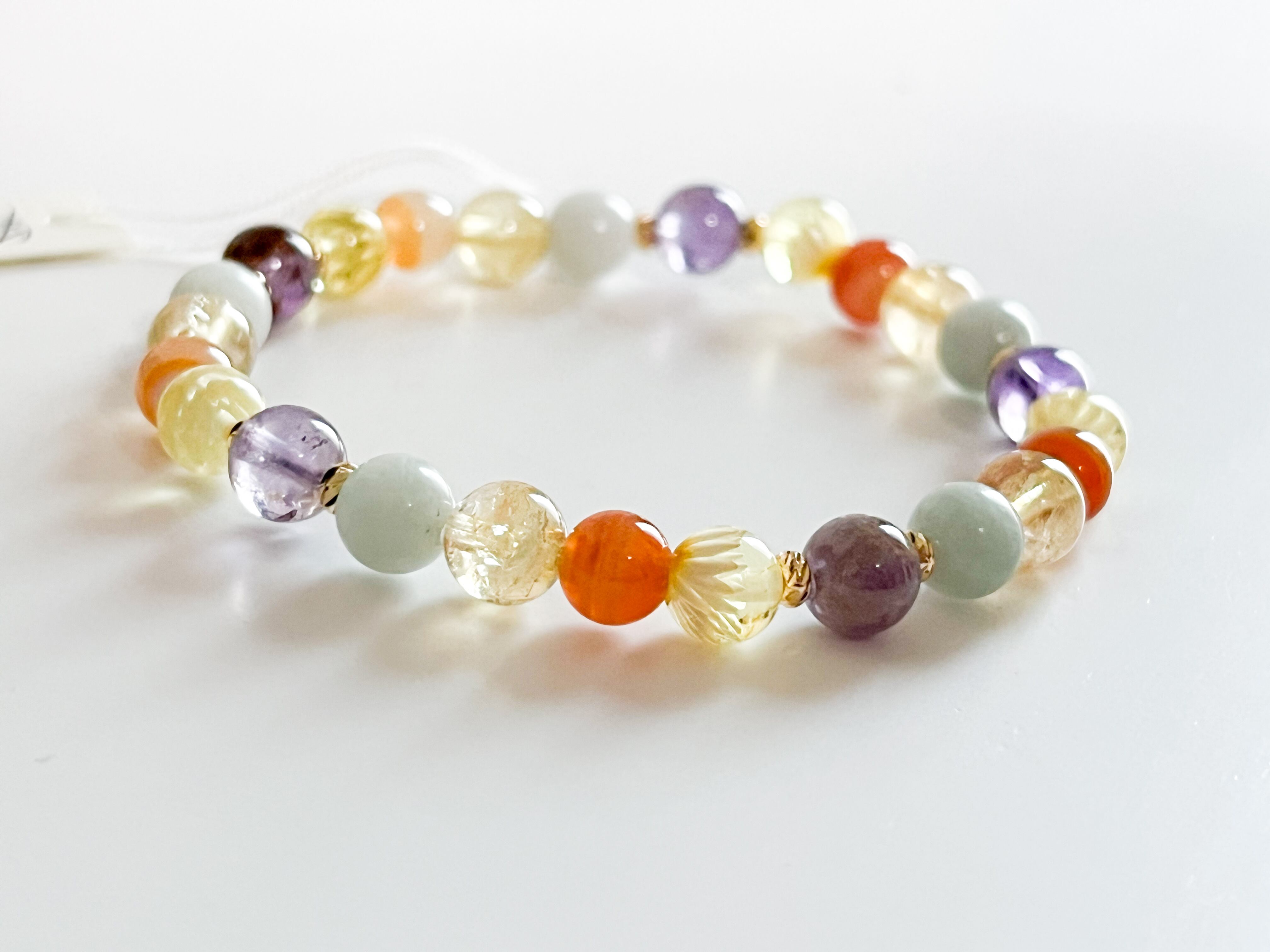 ガーデンアメシストの爽やかなパープル、シトリンの明るいイエロー、サードニクスの落ち着いたトーン、そしてミャンマー翡翠が優しく調和し、手元を華やかに彩ります。