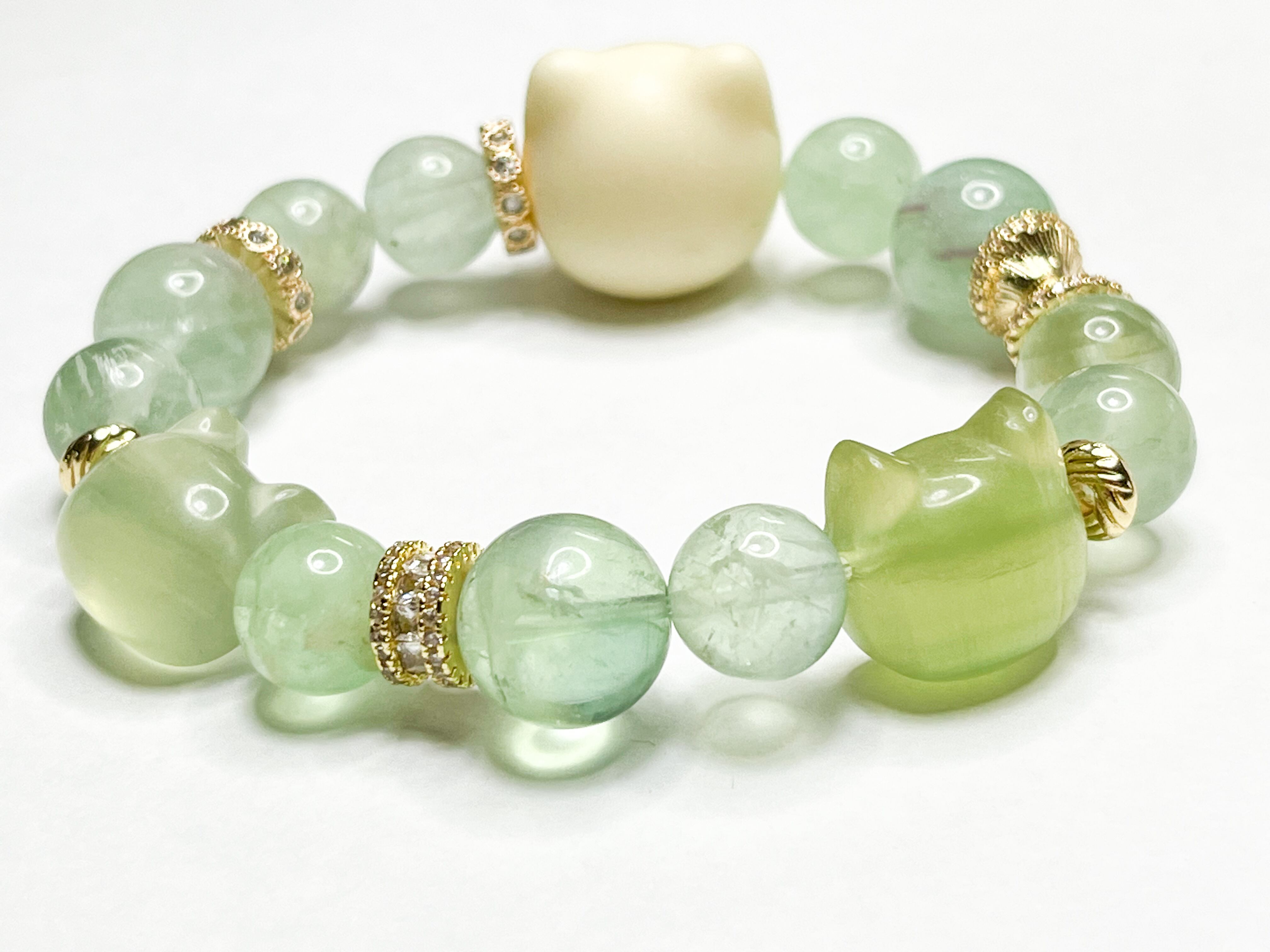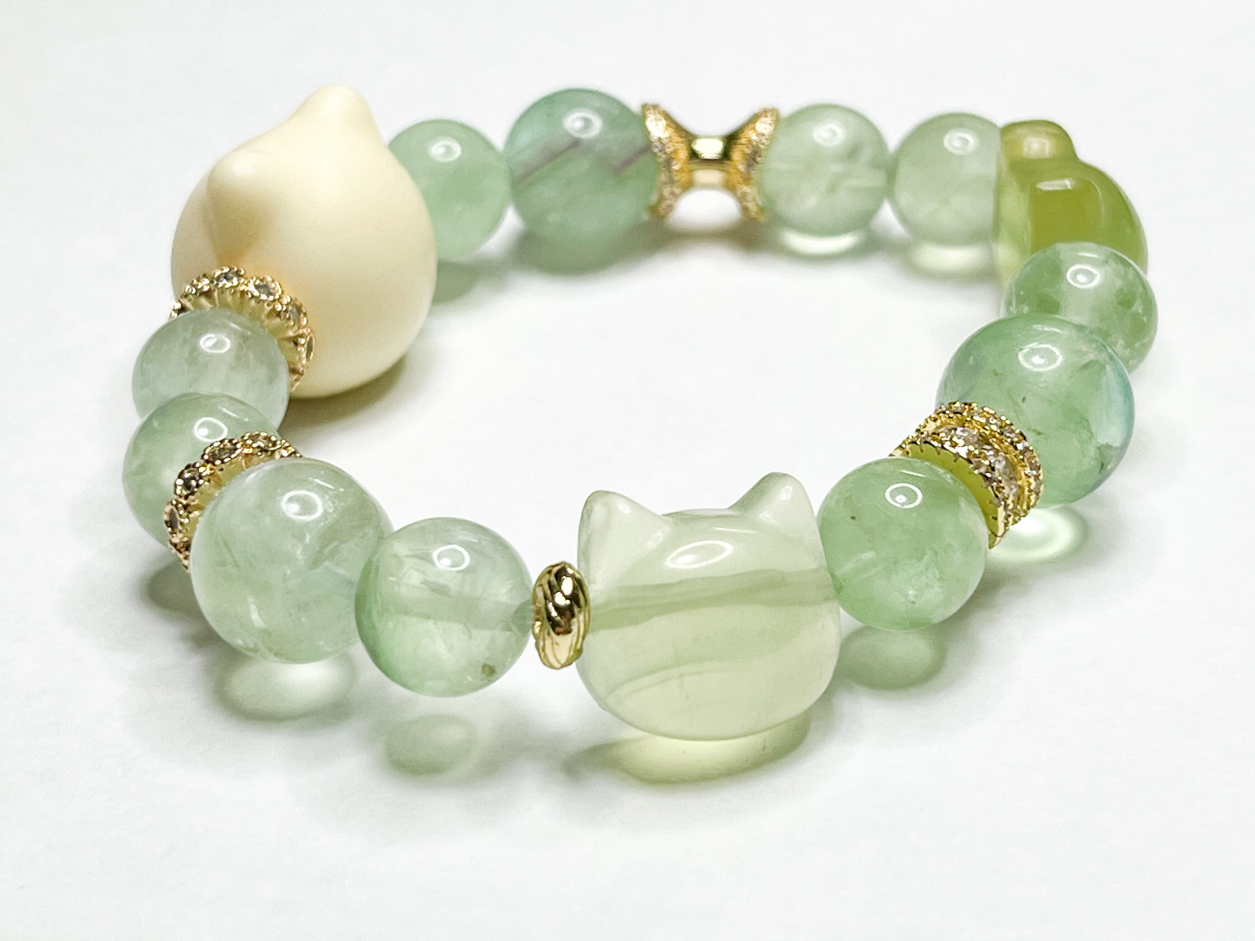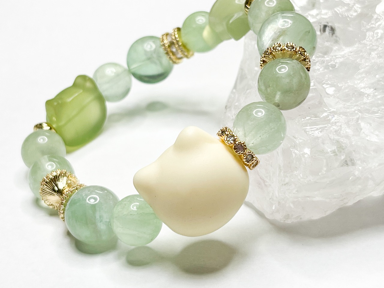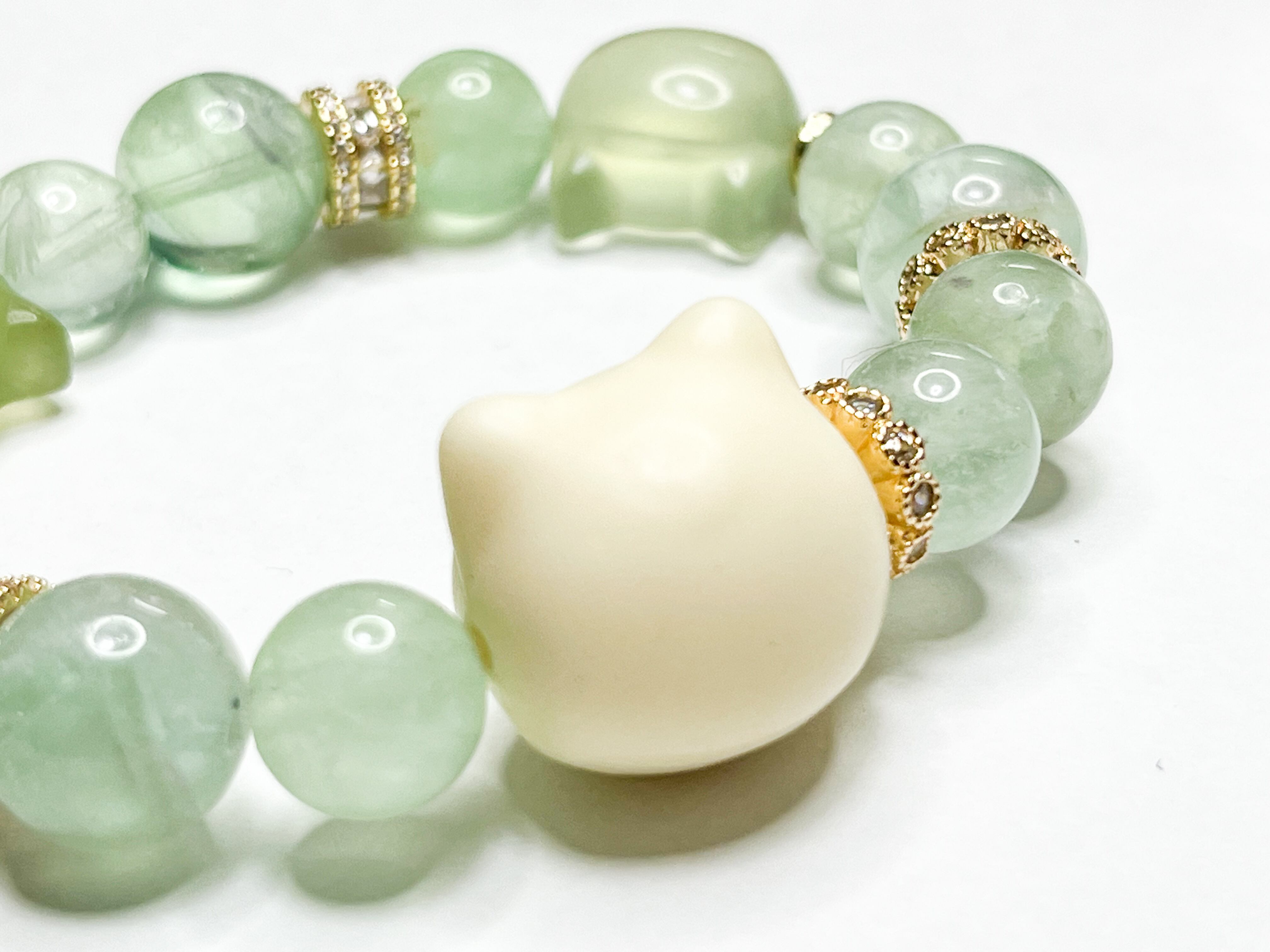 可愛らしいエンジェルフェザーフローライトとフローライトの猫、そして象牙椰子の猫が組み合わさったブレスレットは、癒しのエネルギーを持つ特別なアイテムです。