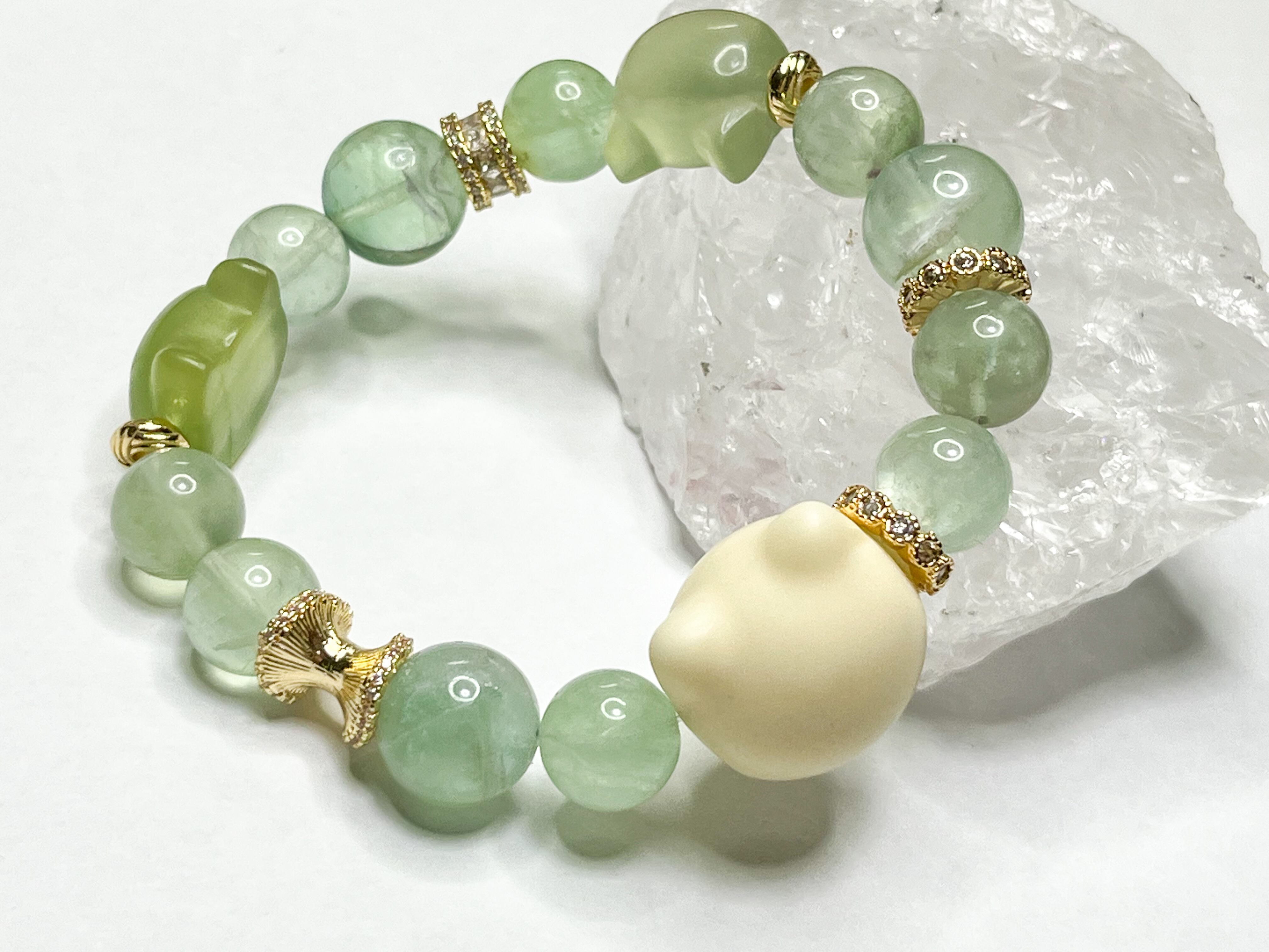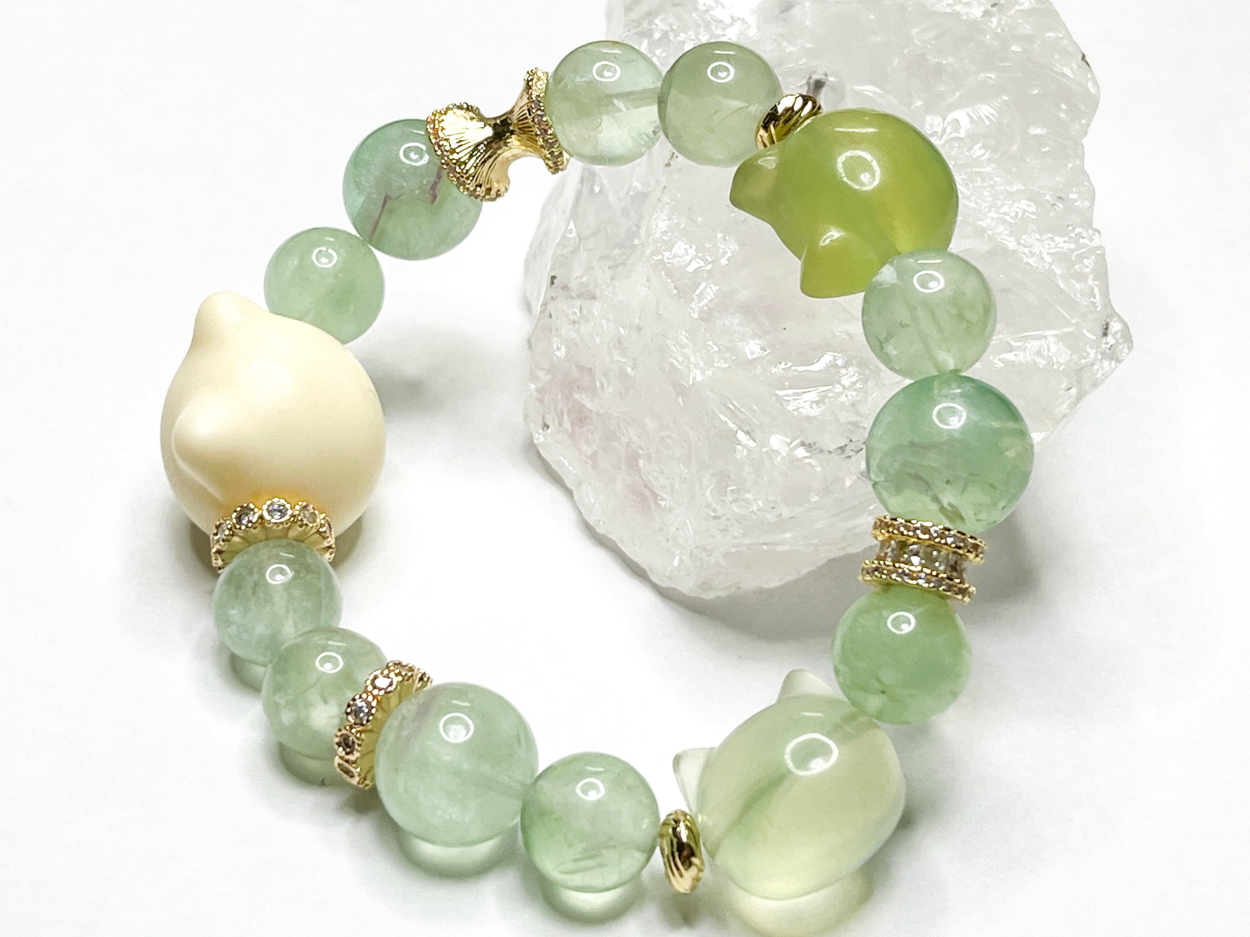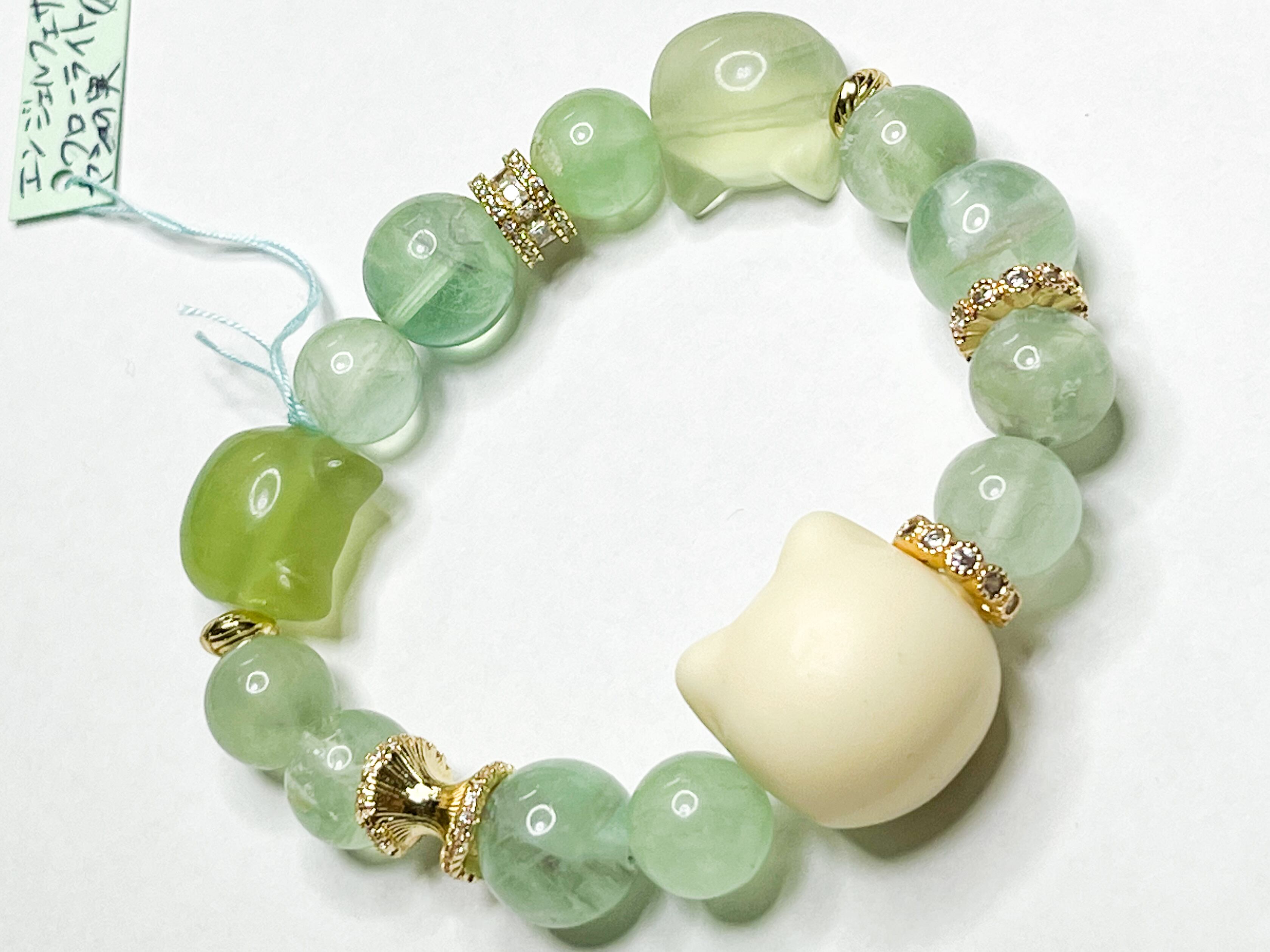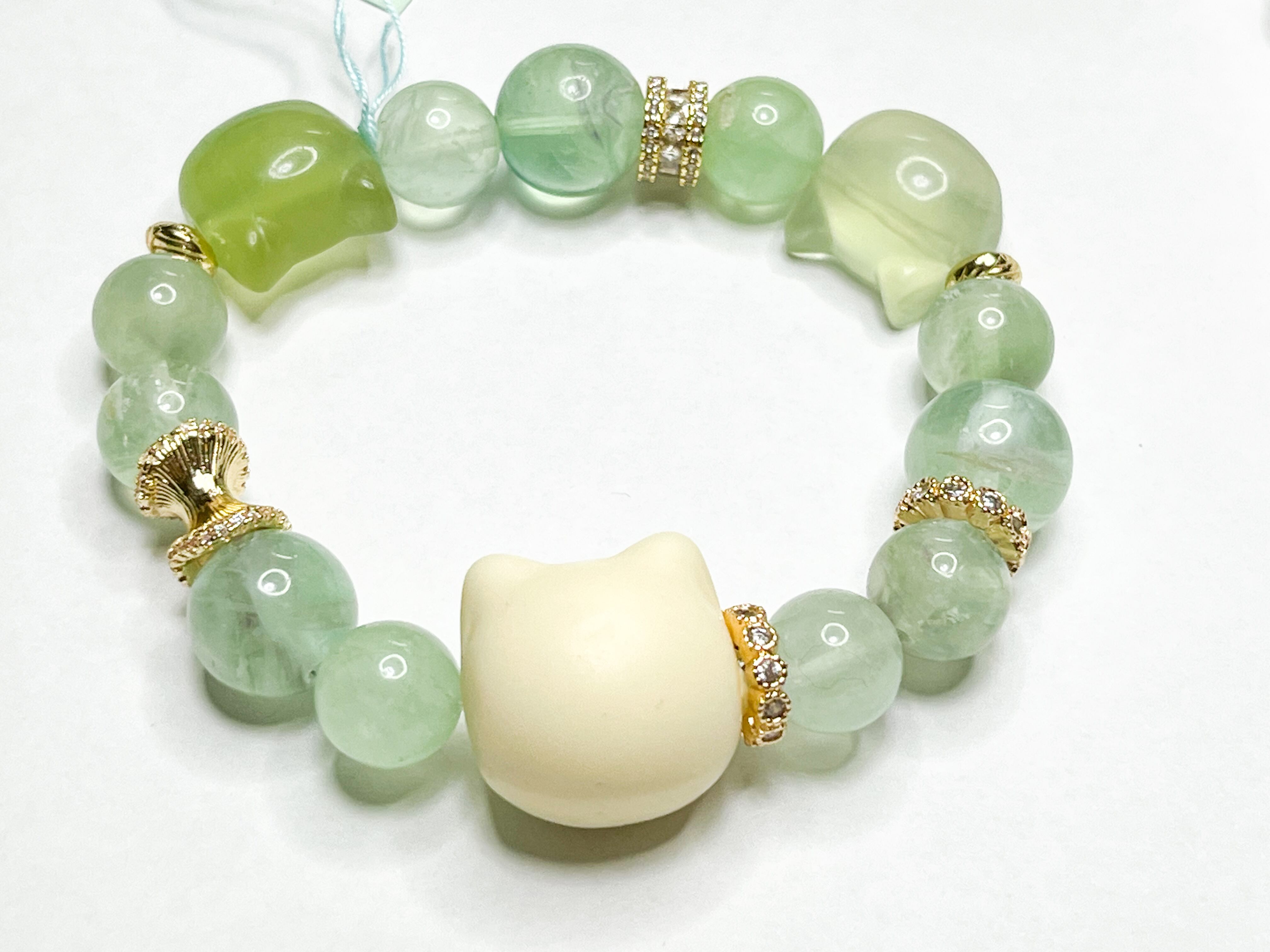 可愛らしいエンジェルフェザーフローライトとフローライトの猫、そして象牙椰子の猫が組み合わさったブレスレットは、癒しのエネルギーを持つ特別なアイテムです。