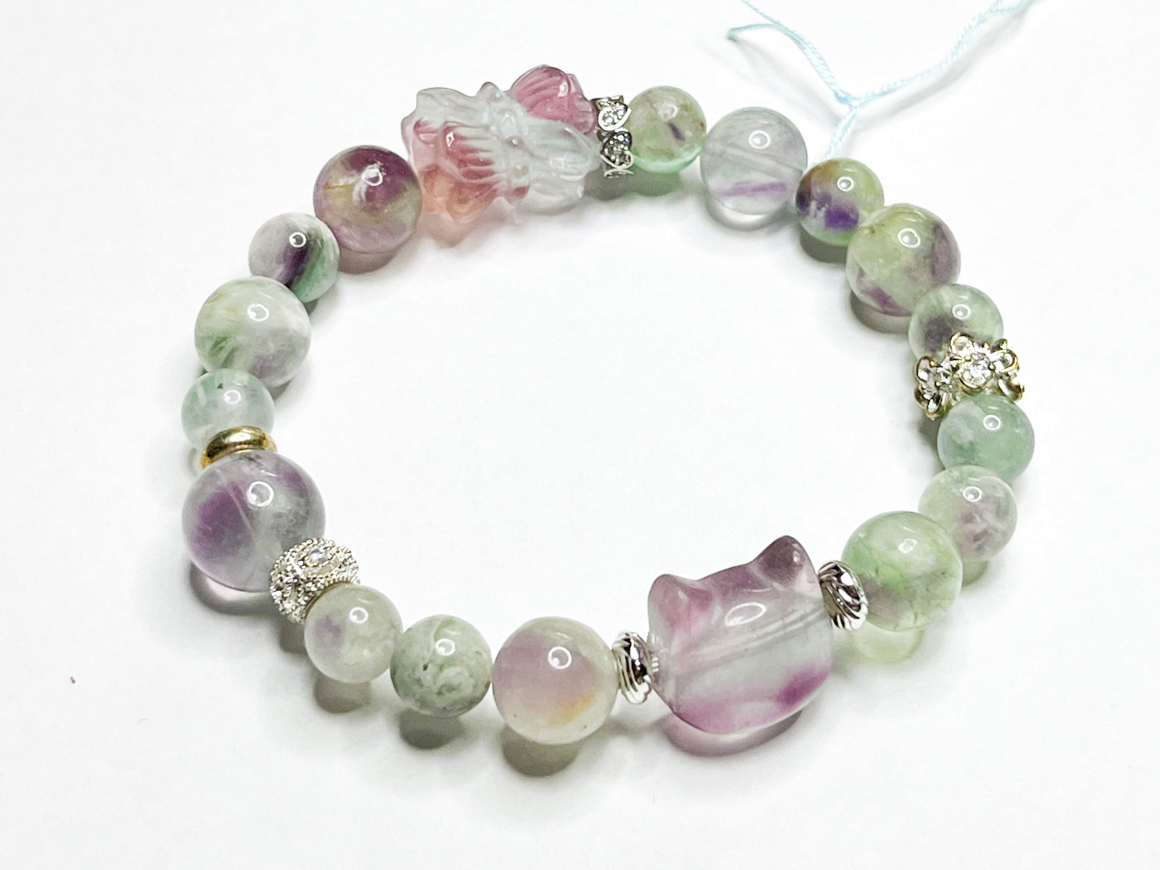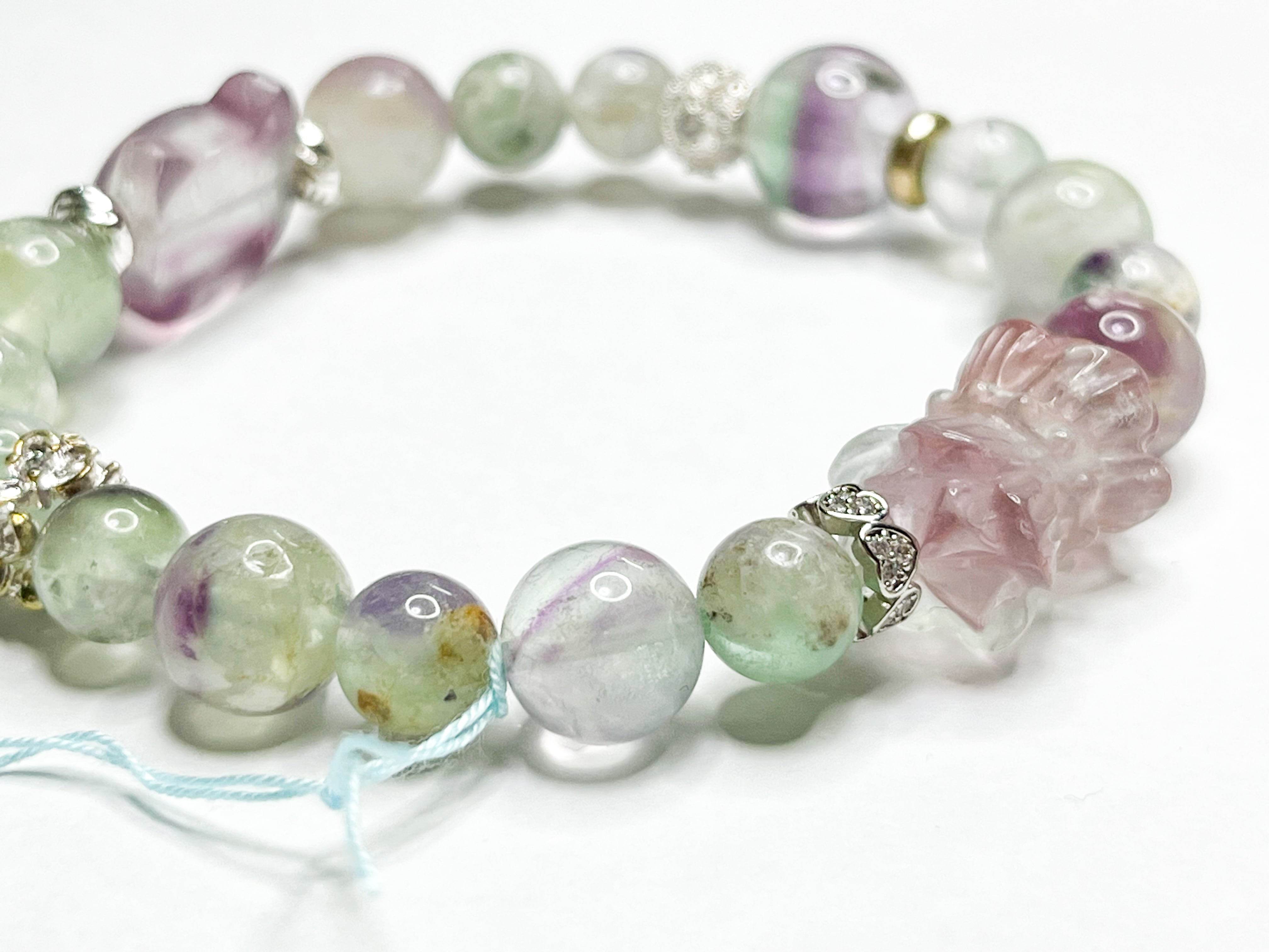 このブレスレットを身につけることで、日々の生活に心の安らぎとエネルギーの循環がもたらされ、あなたの毎日をもっと素敵なものに演出してくれるでしょう。エンジェルフェザーフローライトとフローライトの美しい輝きが、あなたに癒しと喜びを届けます。