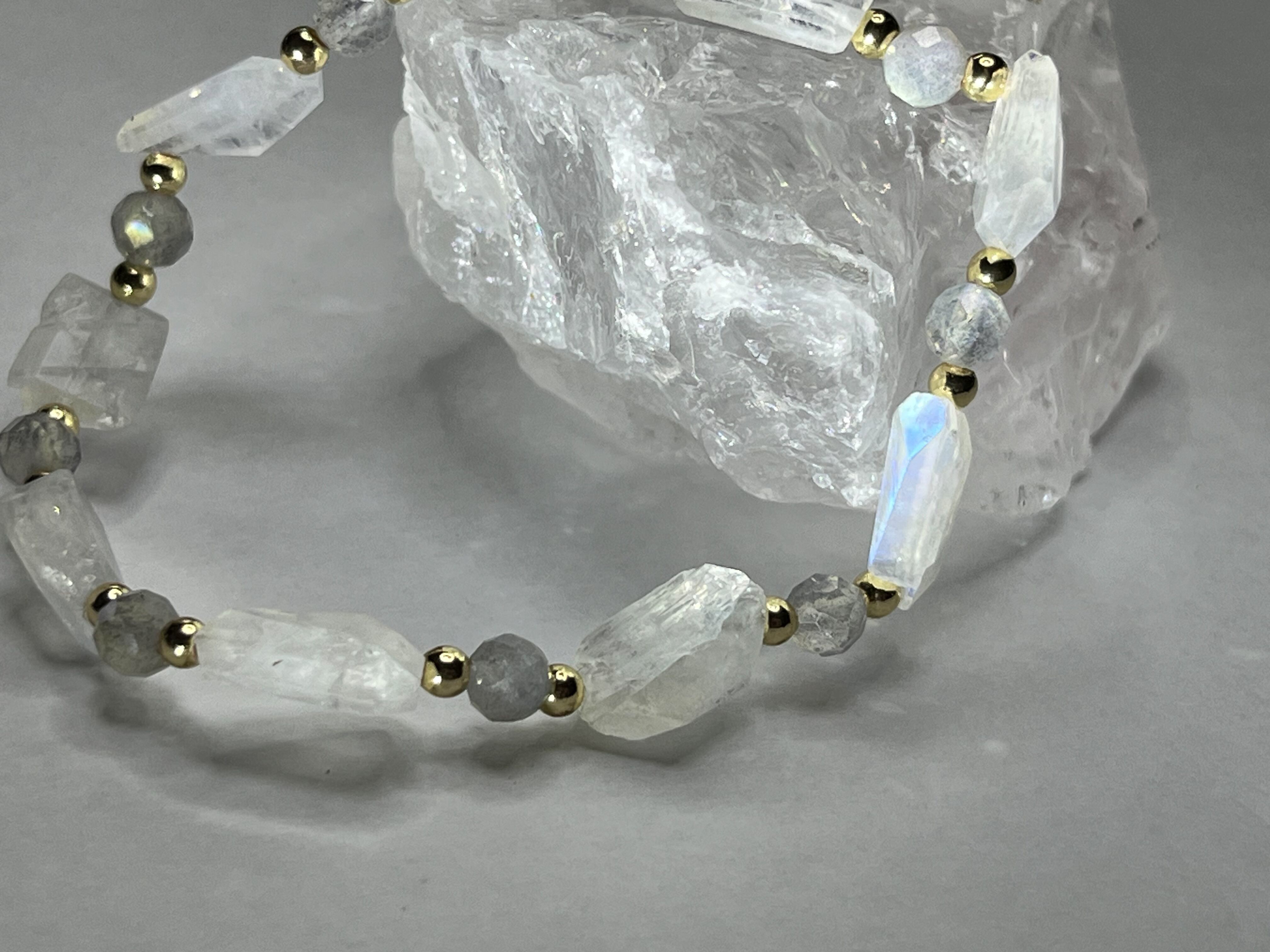 ラブラドライトとブルームーンストーンの美しい輝きが、あなたに幸せな気持ちを届けます。