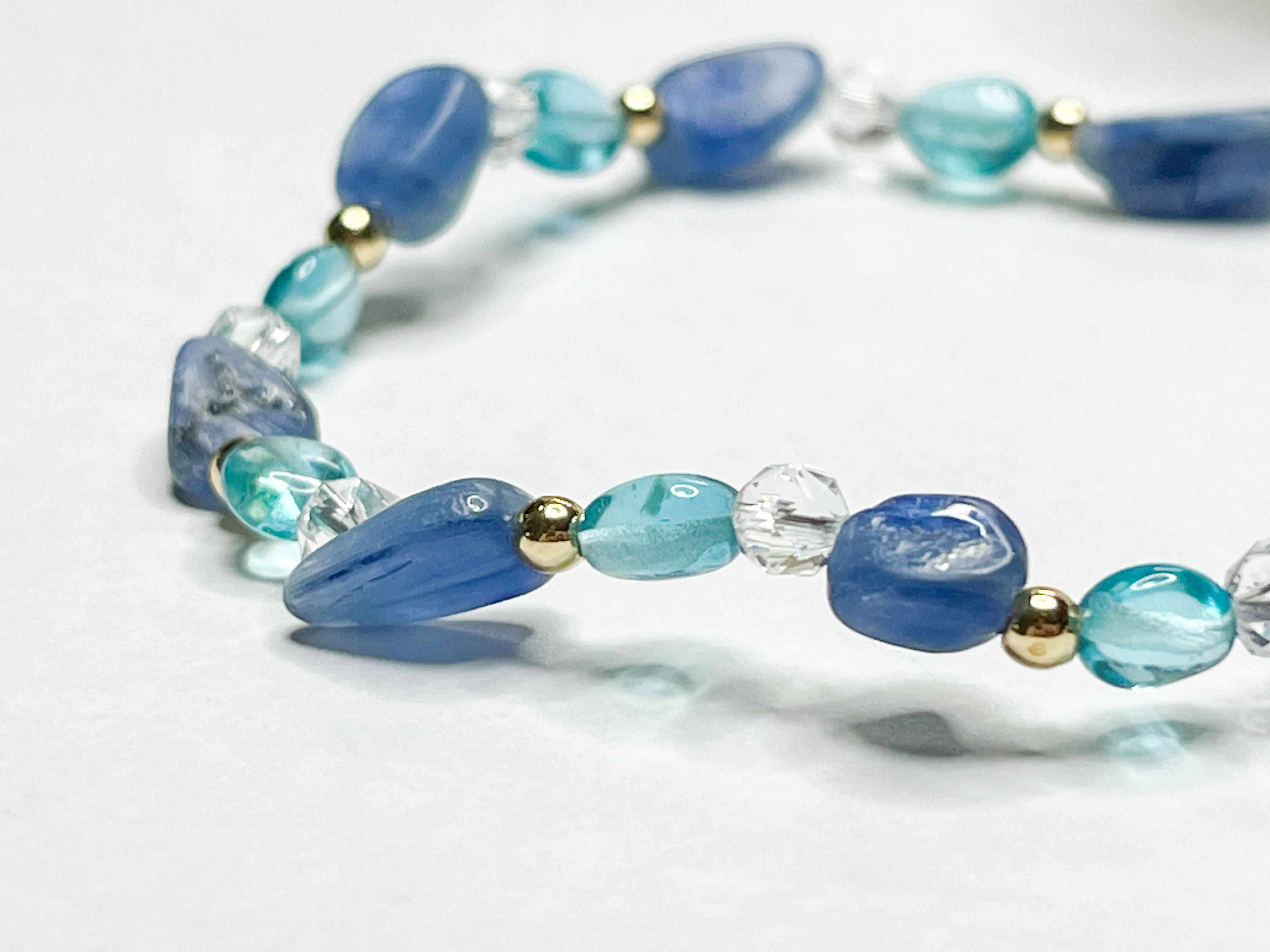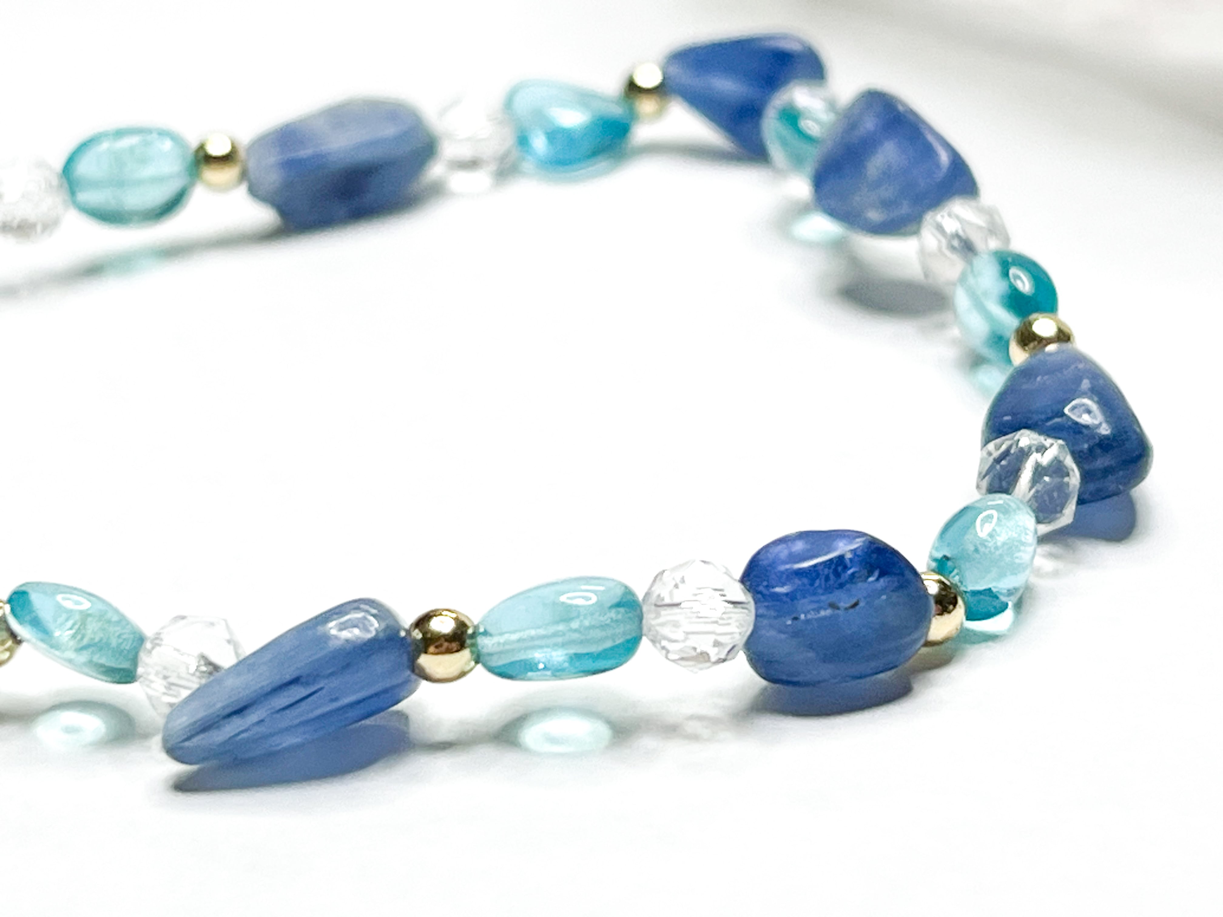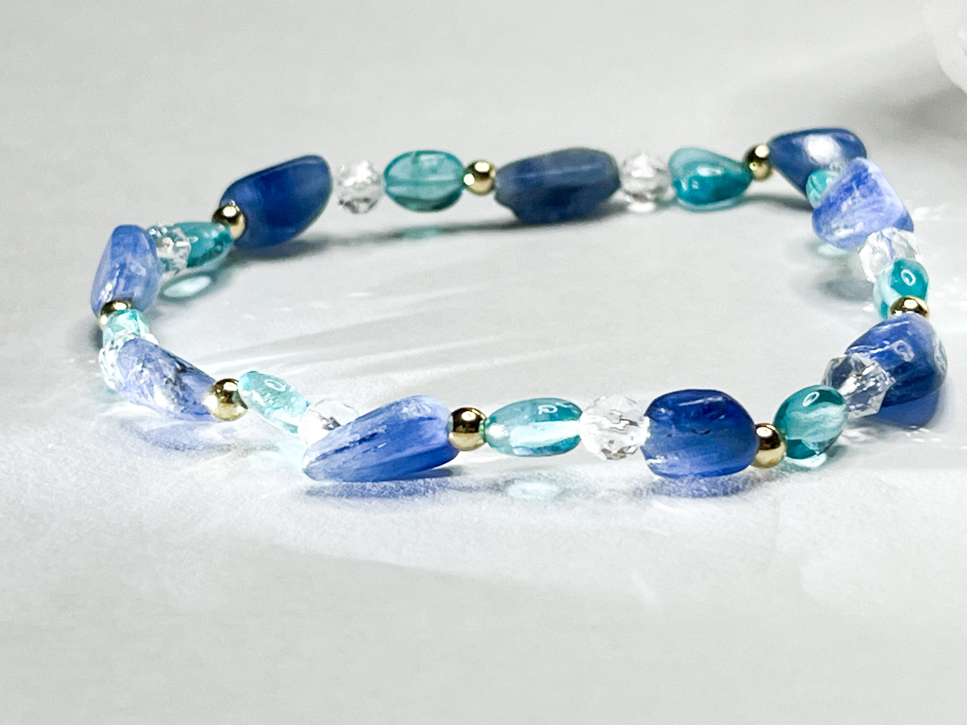 カイヤナイトとアパタイトのブレスレットは、あなたの手首に素敵な輝きを添える特別なアイテムです。濃い青色が印象的なカイヤナイトは、持つ人に精神的な平和と直感力をもたらします。