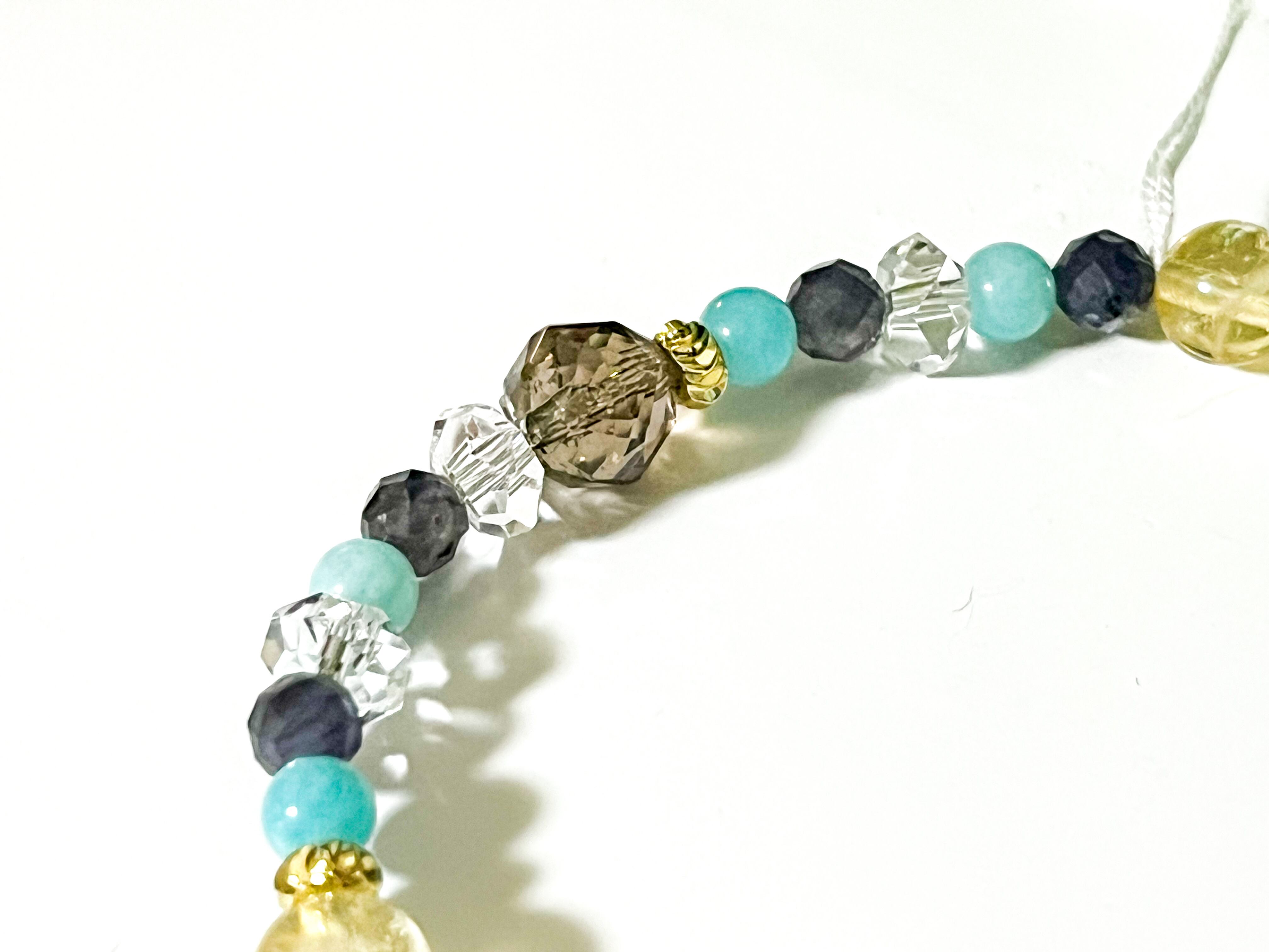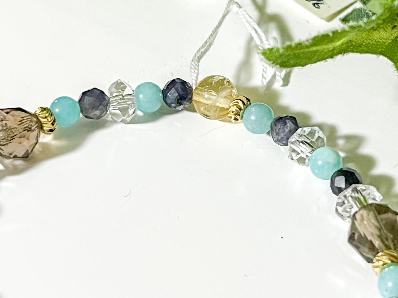 また、アイオライトは、道を定めるサポートをし、内なる直感を高める力があります。シトリンやスモーキークォーツ、水晶を組み合わせることで、心の調和が生まれ、バランスの取れた日常を実現します。