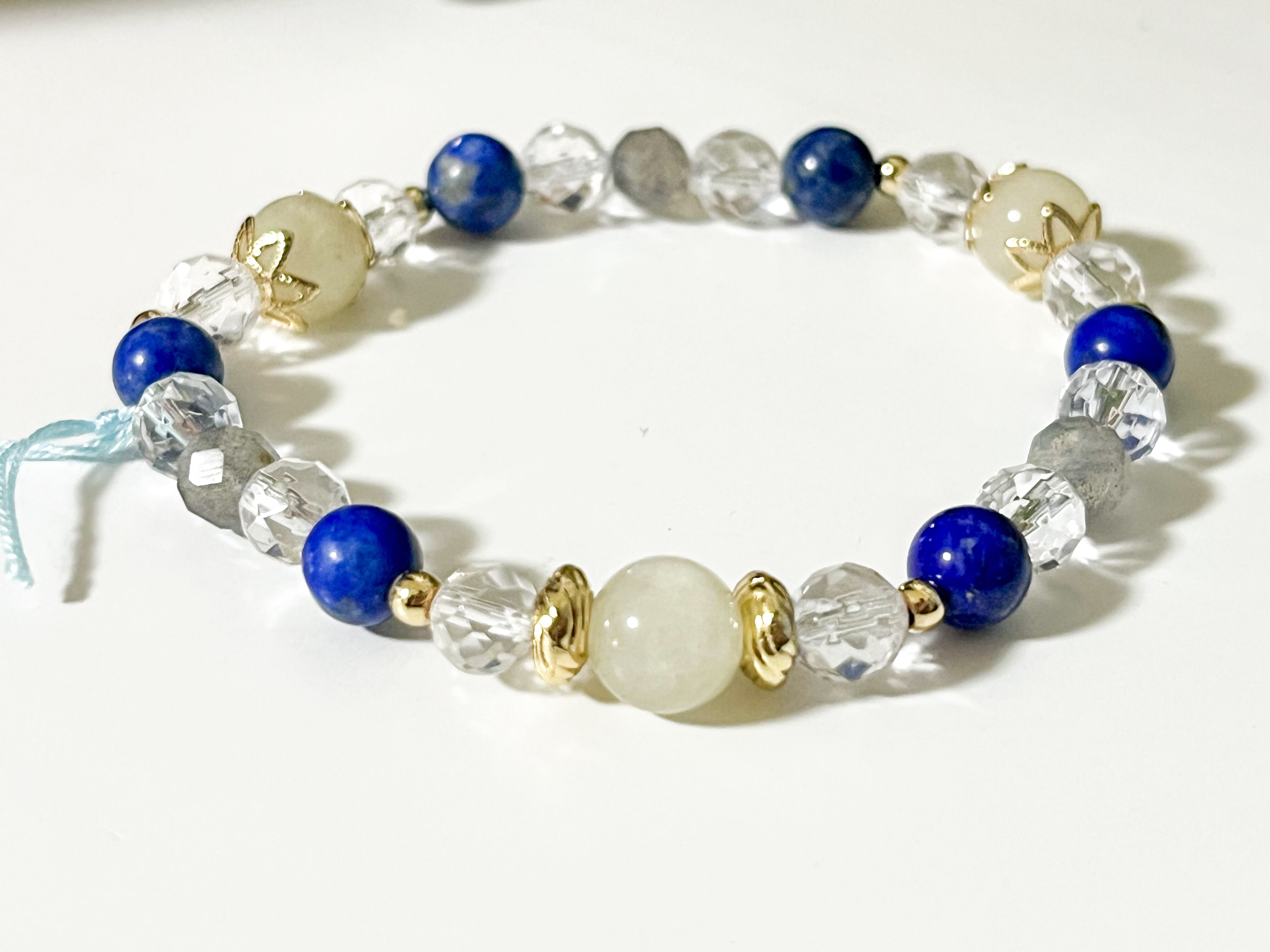 ラピスラズリは、真実と自己表現を促進し、内なる力を呼び覚ます役割を果たします。また、ラブラドライトと水晶が組み合わさることで、心の調和が実現し、癒しのエネルギーが高まります。これにより、あなたの日常に心地よいバランスをもたらします。