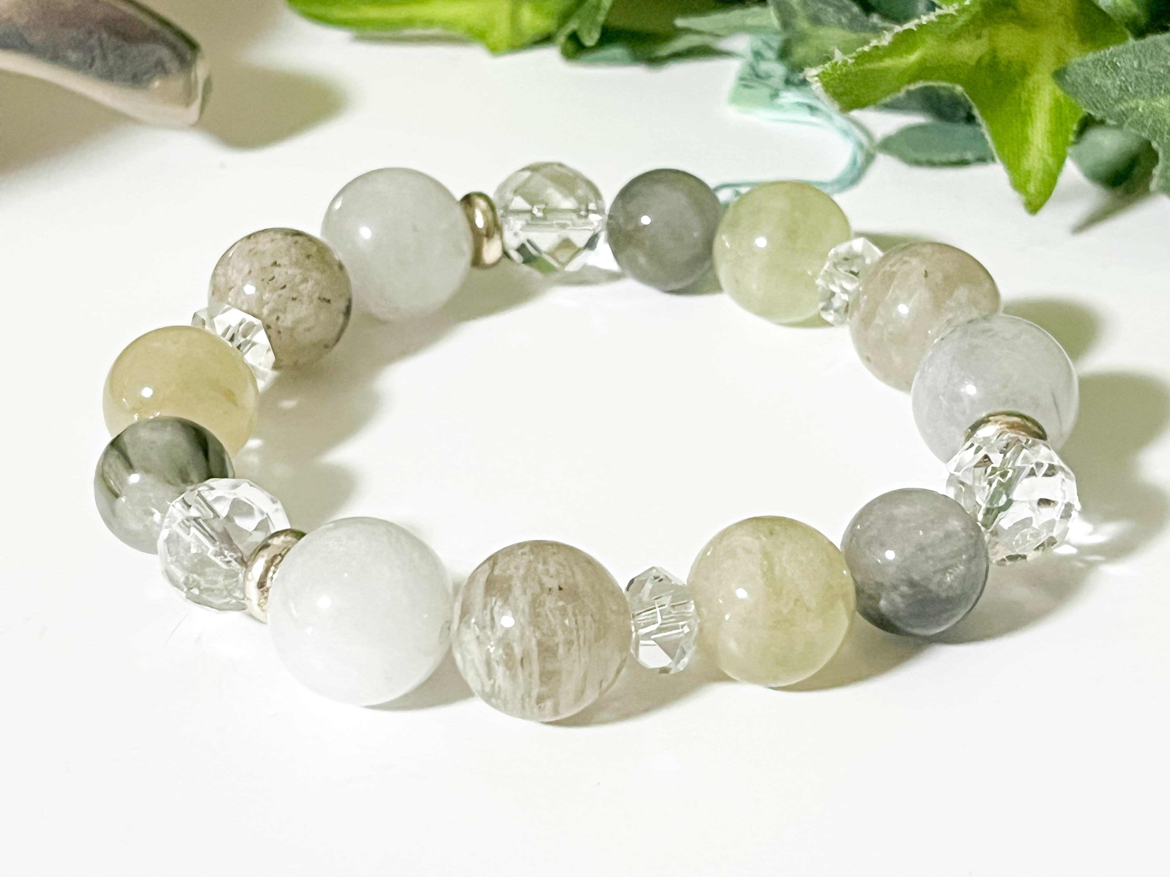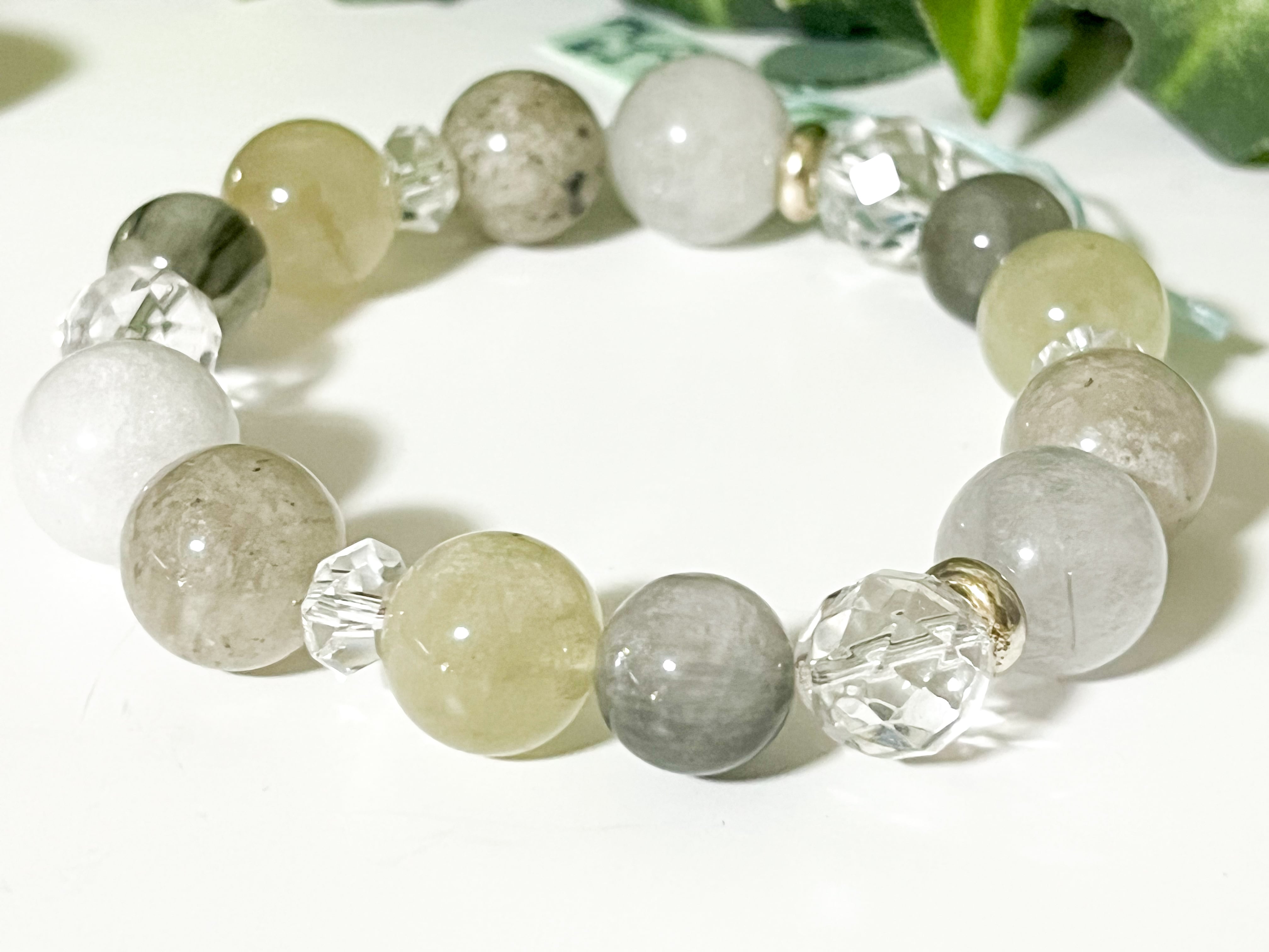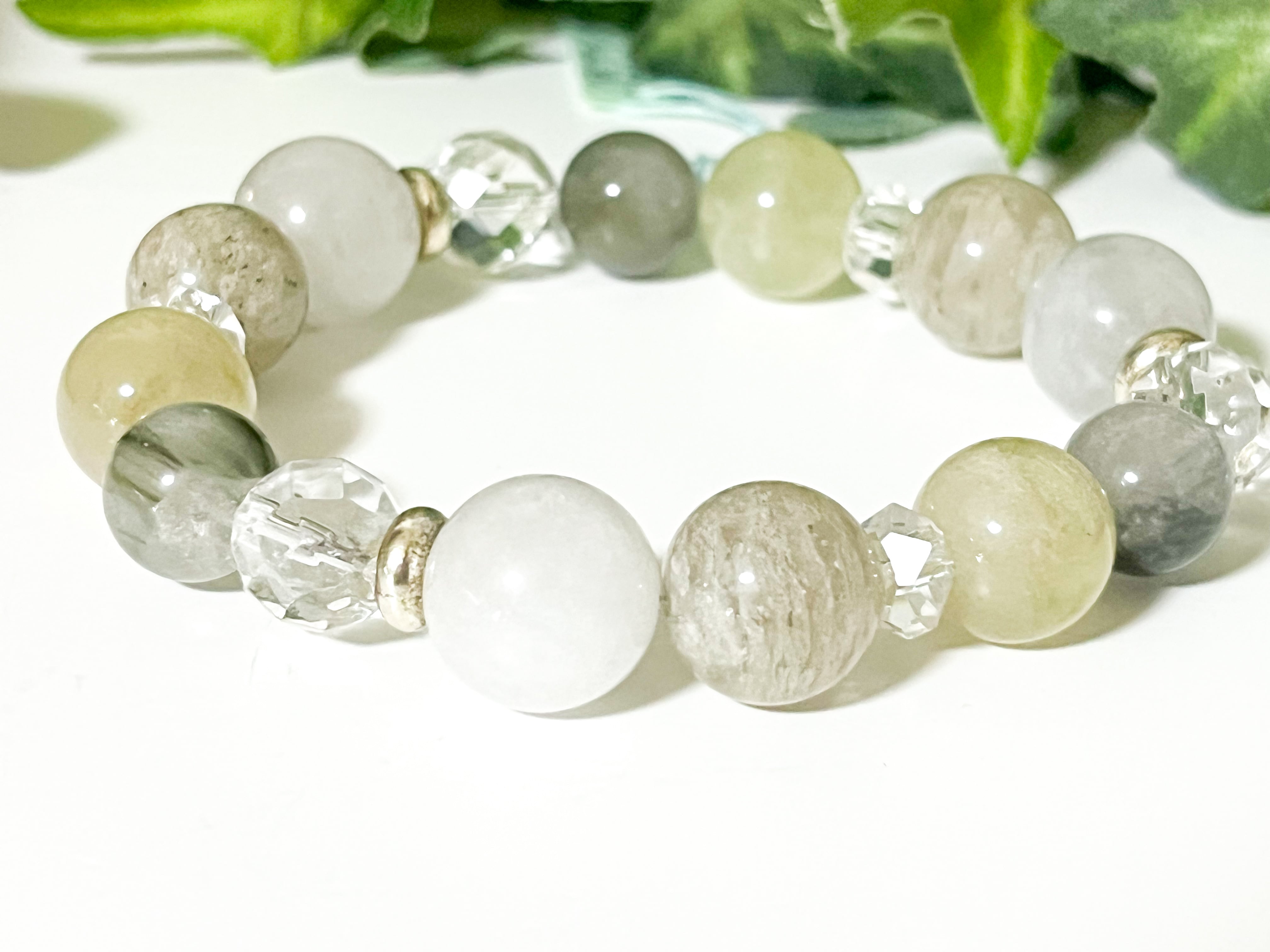 ホワイトルチルとリビアングラスのブレスレットは、あなたの手元に神秘的な輝きを宿す特別なアイテムです。
