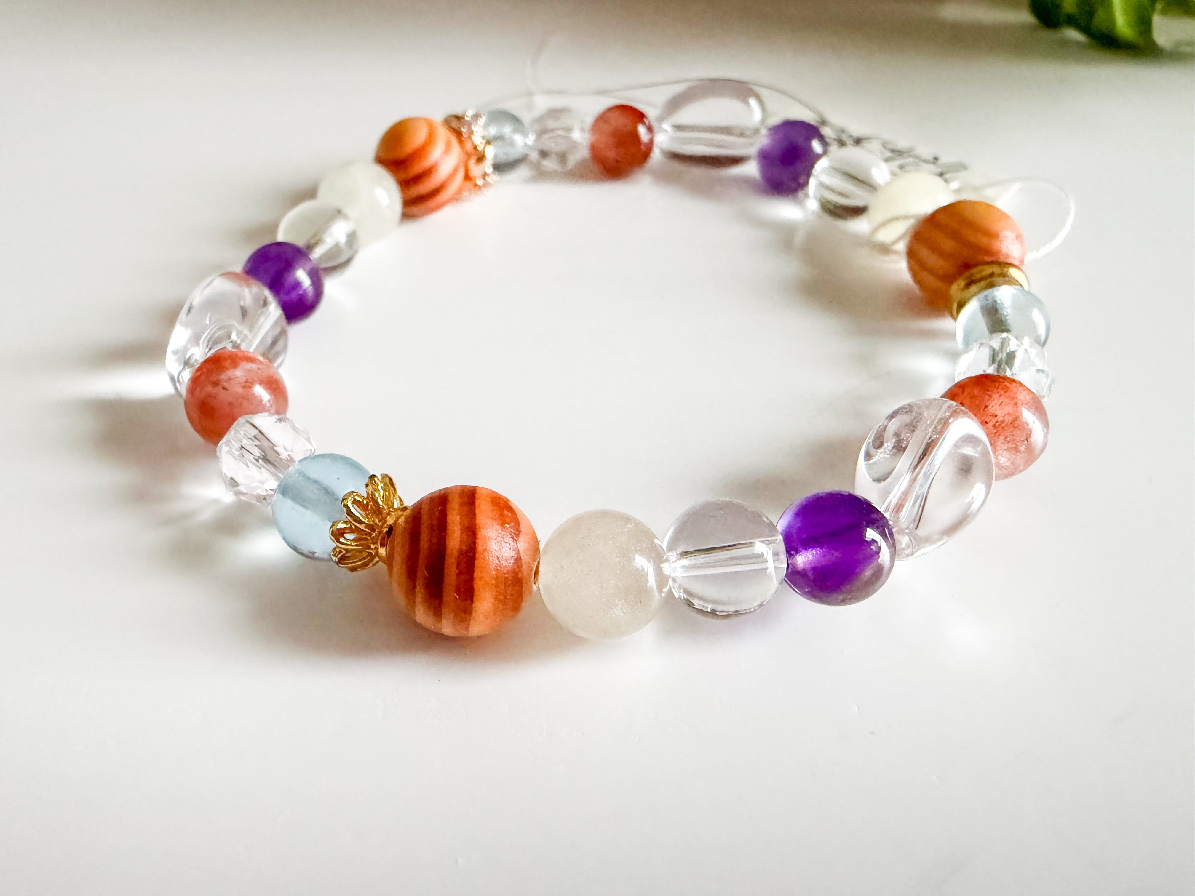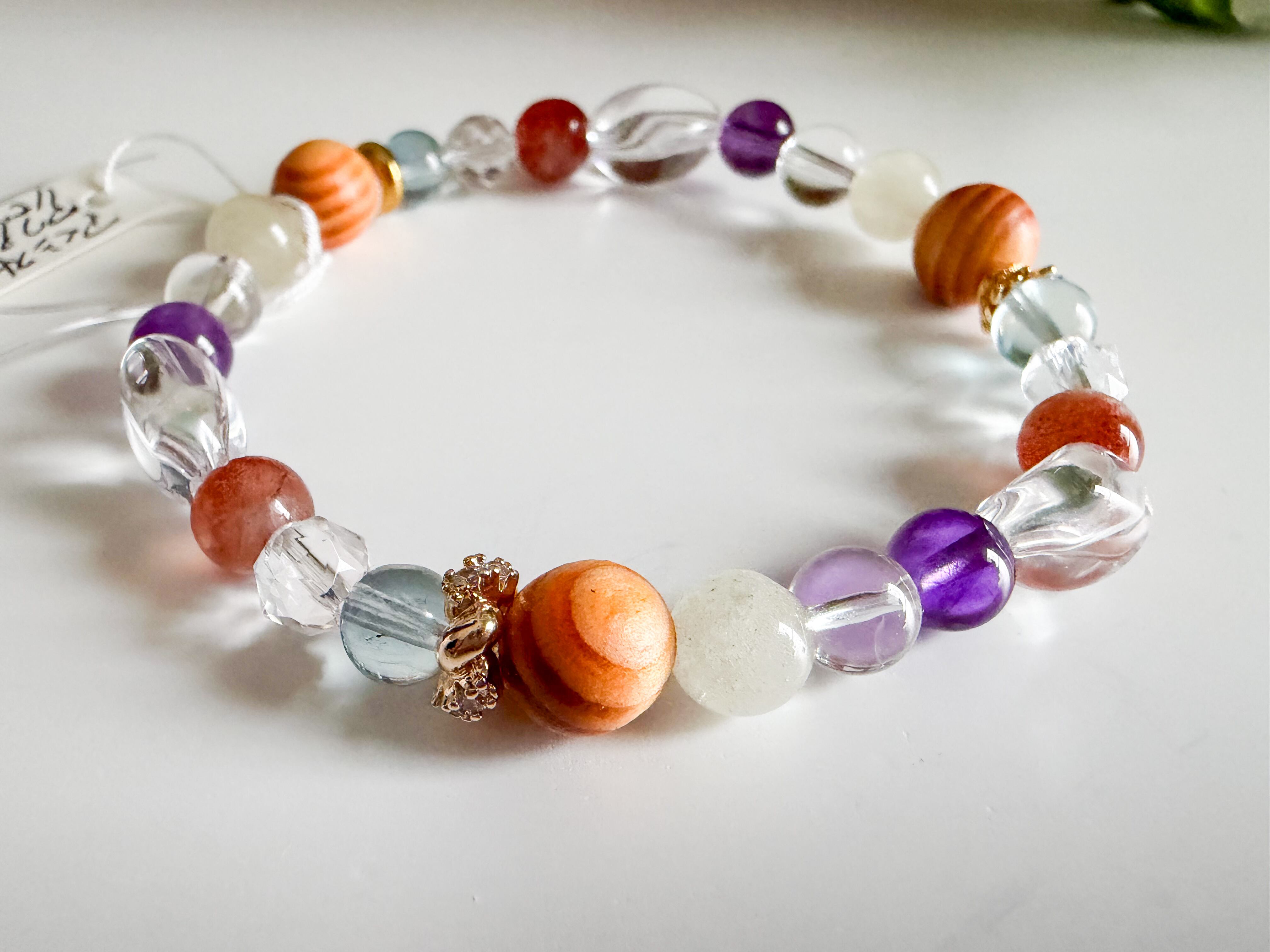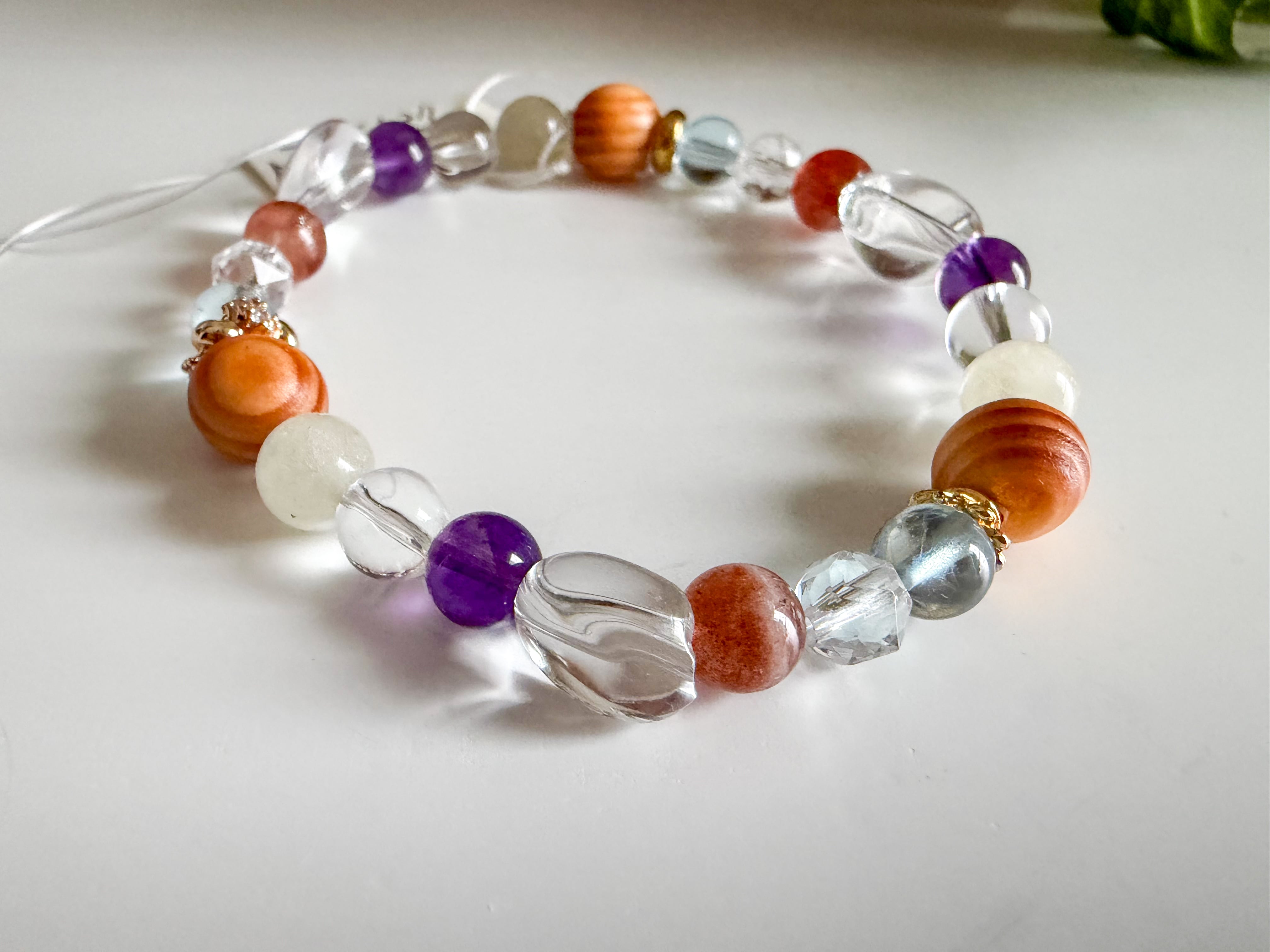 サンストーンとリビアングラス、アクアマリンのブレスレットは、太陽のような温かさと深い海のような穏やかさを併せ持つ、美しいアイテムです。このブレスレットには、サンストーン、リビアングラス、アメシスト、アクアマリン、龍血樹の個性豊かな石々が使用されており、手元を華やかに彩ります。