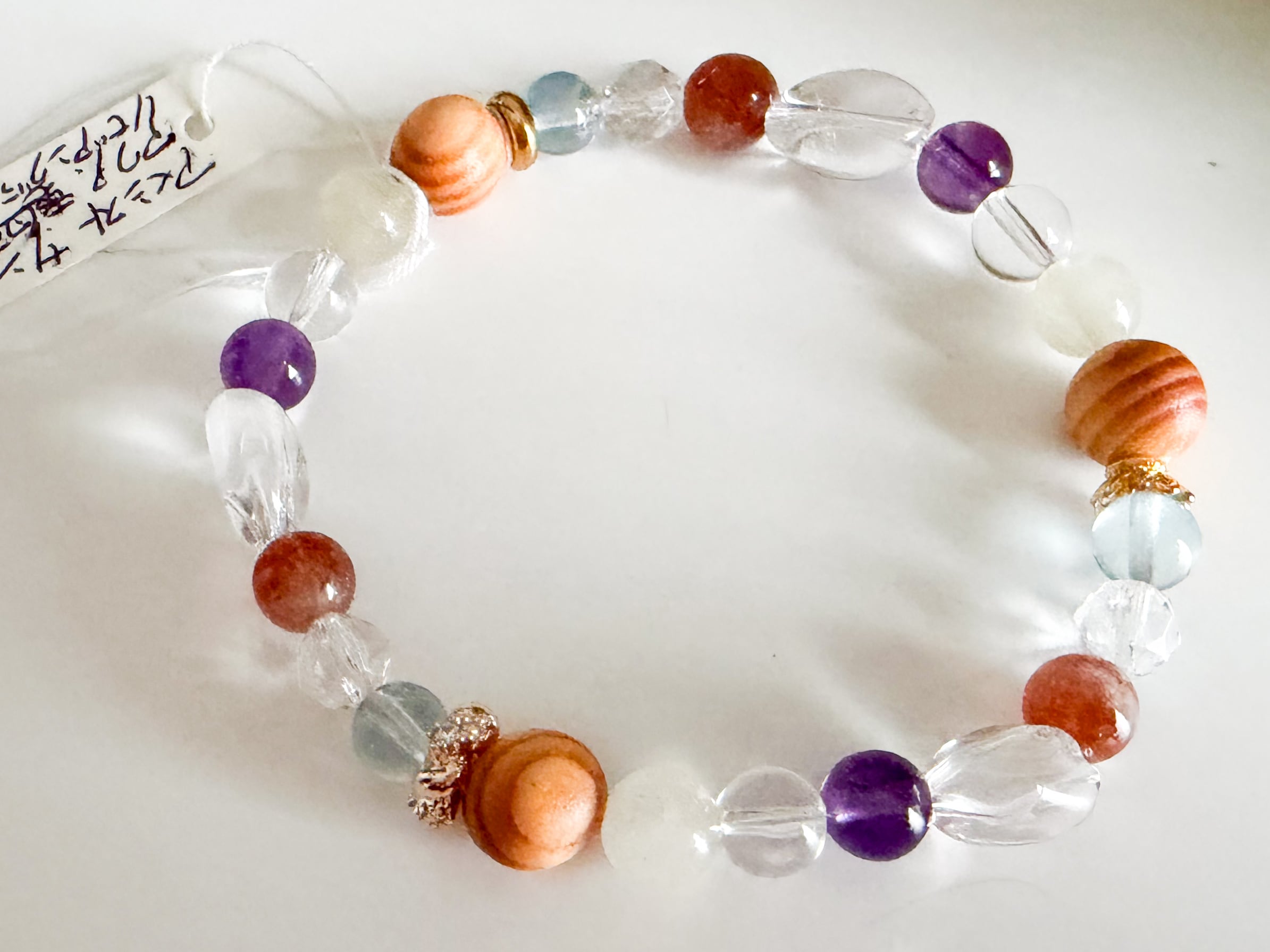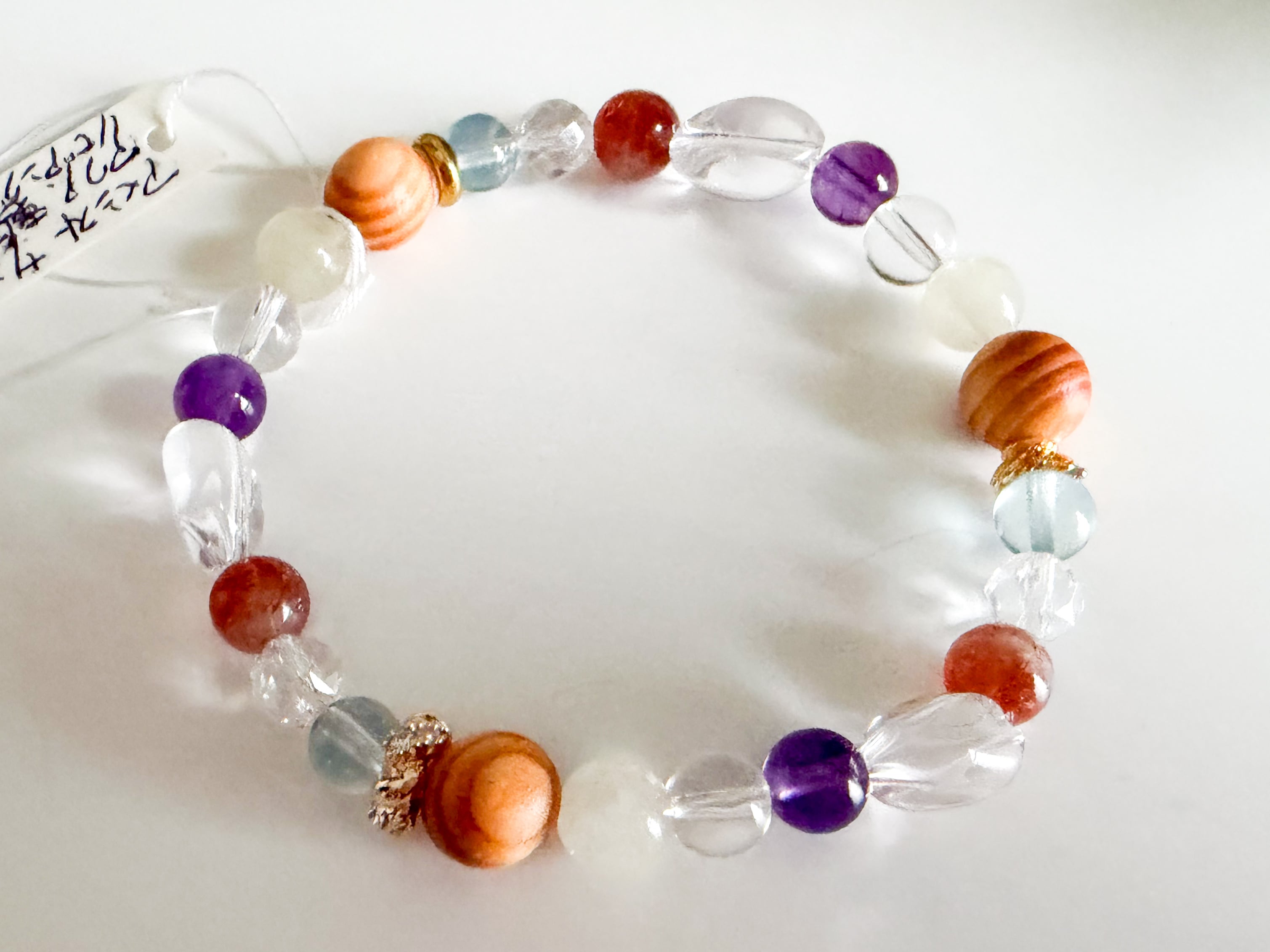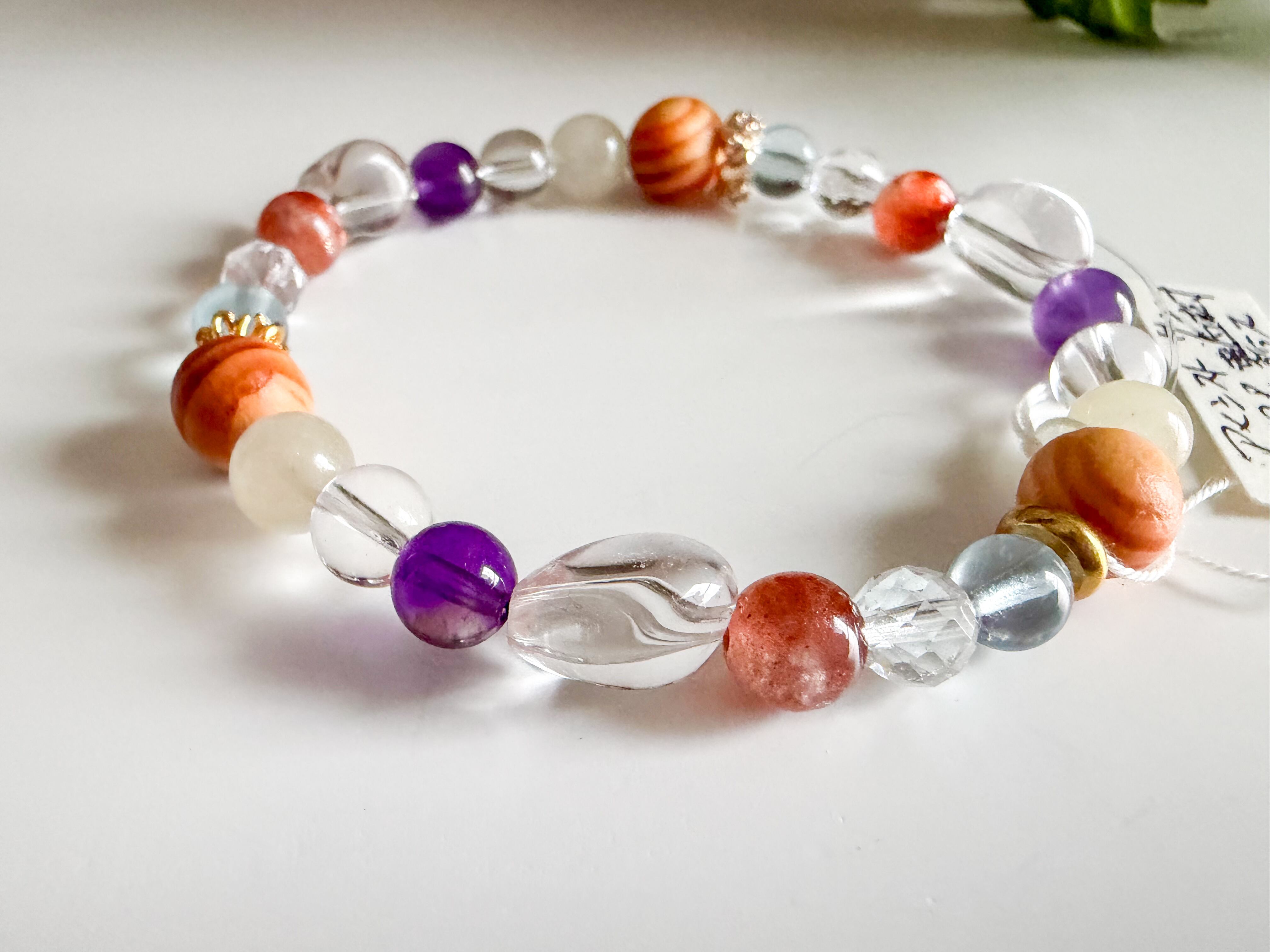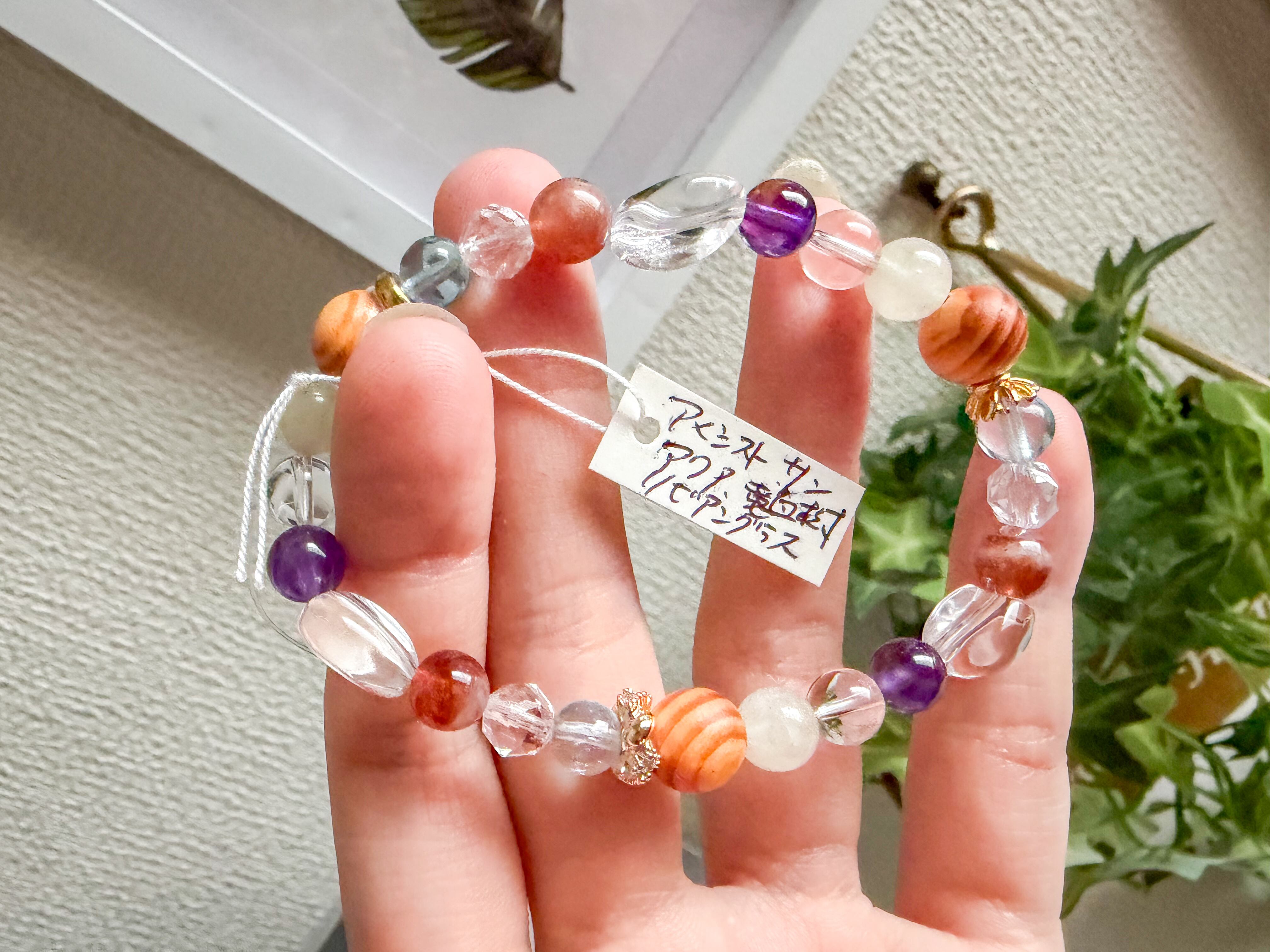 サンストーンとリビアングラス、アクアマリンのブレスレットは、太陽のような温かさと深い海のような穏やかさを併せ持つ、美しいアイテムです。このブレスレットには、サンストーン、リビアングラス、アメシスト、アクアマリン、龍血樹の個性豊かな石々が使用されており、手元を華やかに彩ります。