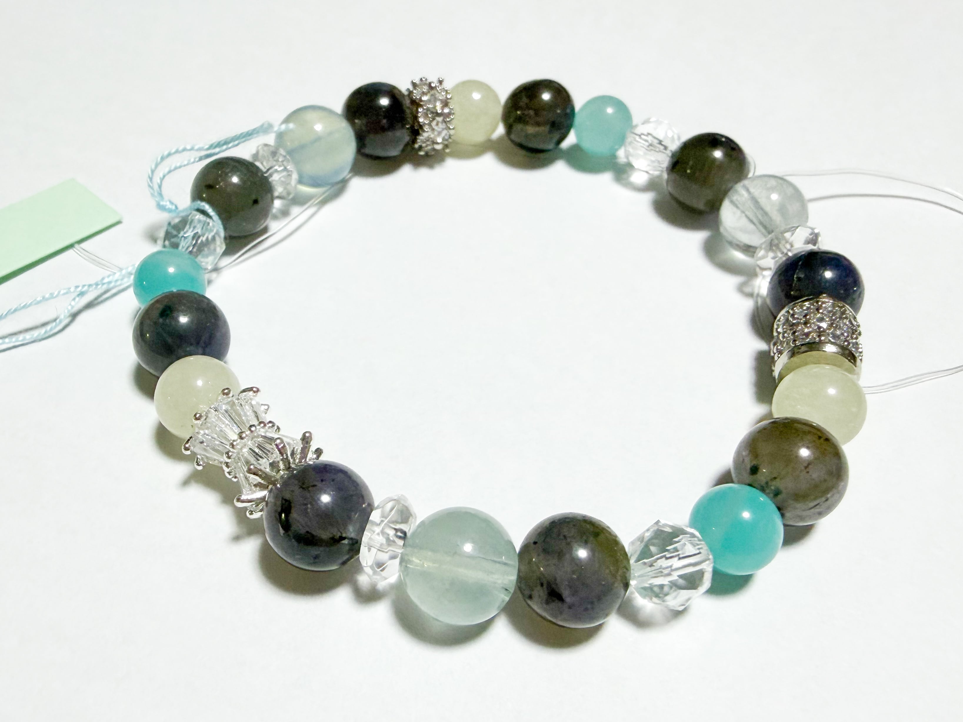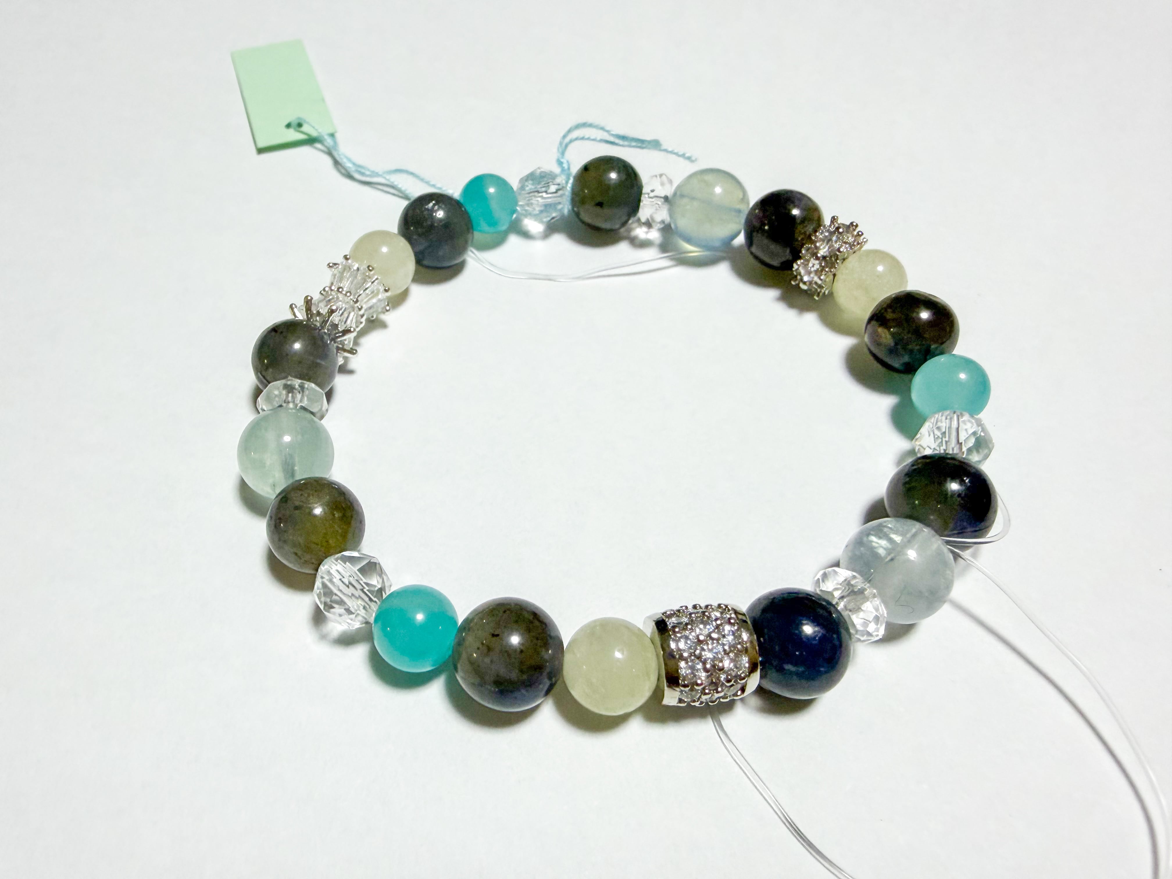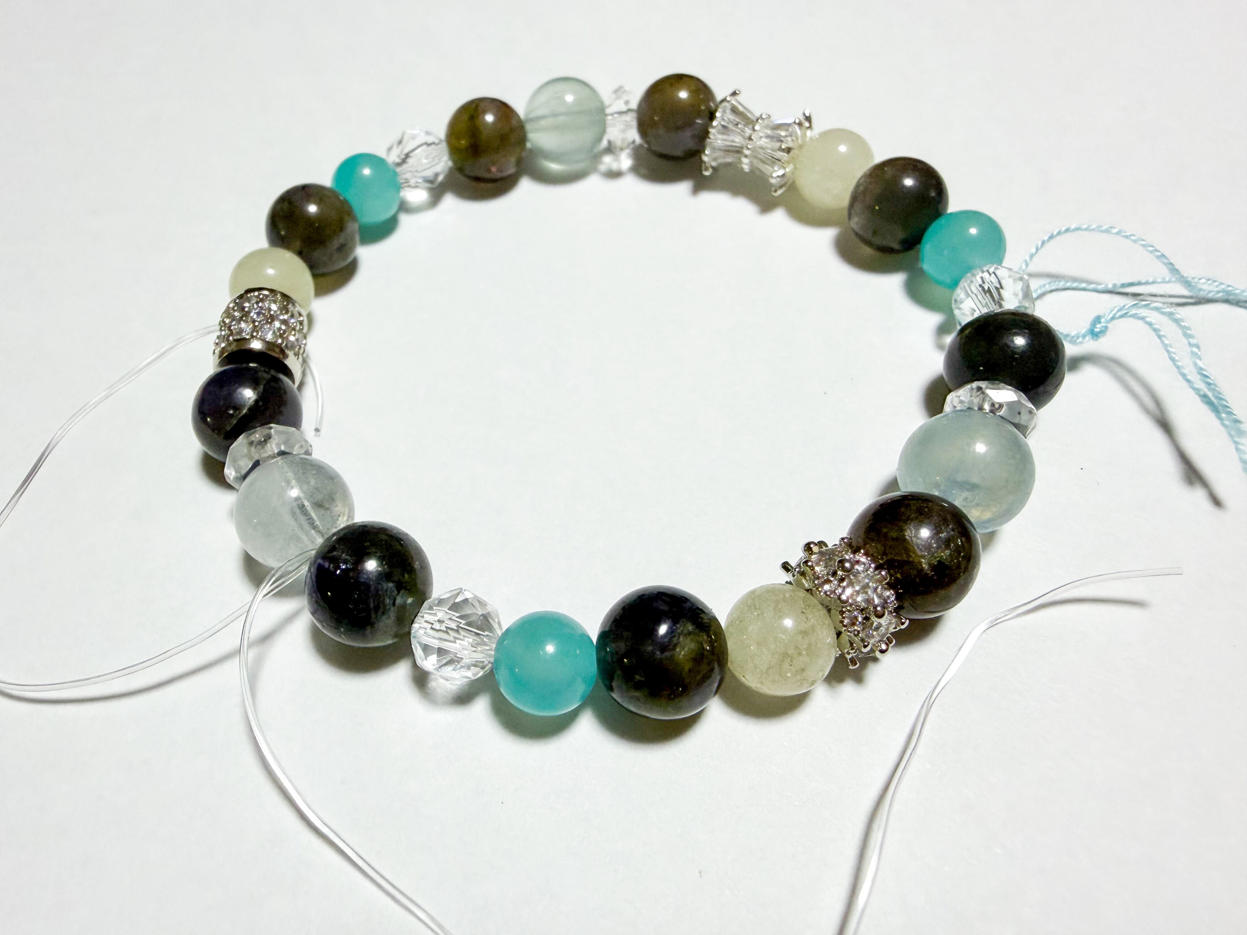 リビアングラスとアクアマリン、アイオライトのブレスレットは、自然の美しさを取り入れた特別なアイテムです。このブレスレットには、リビアングラス、アクアマリン、アイオライト、アマゾナイト、水晶といった洗練された石々が使用され、それぞれが持つ個性が手元を華やかに演出します。美しいブルーが癒されるブレスレットです。
