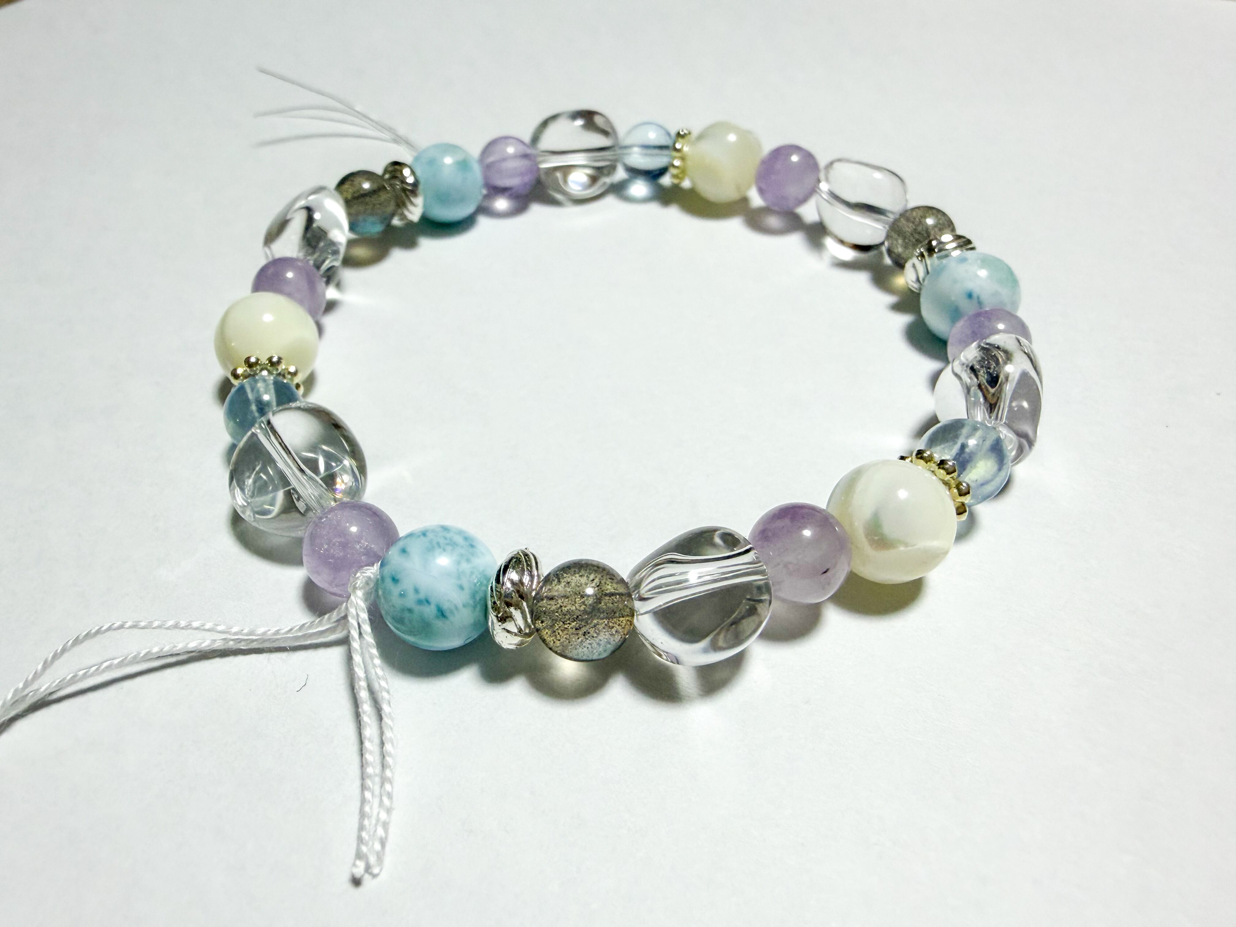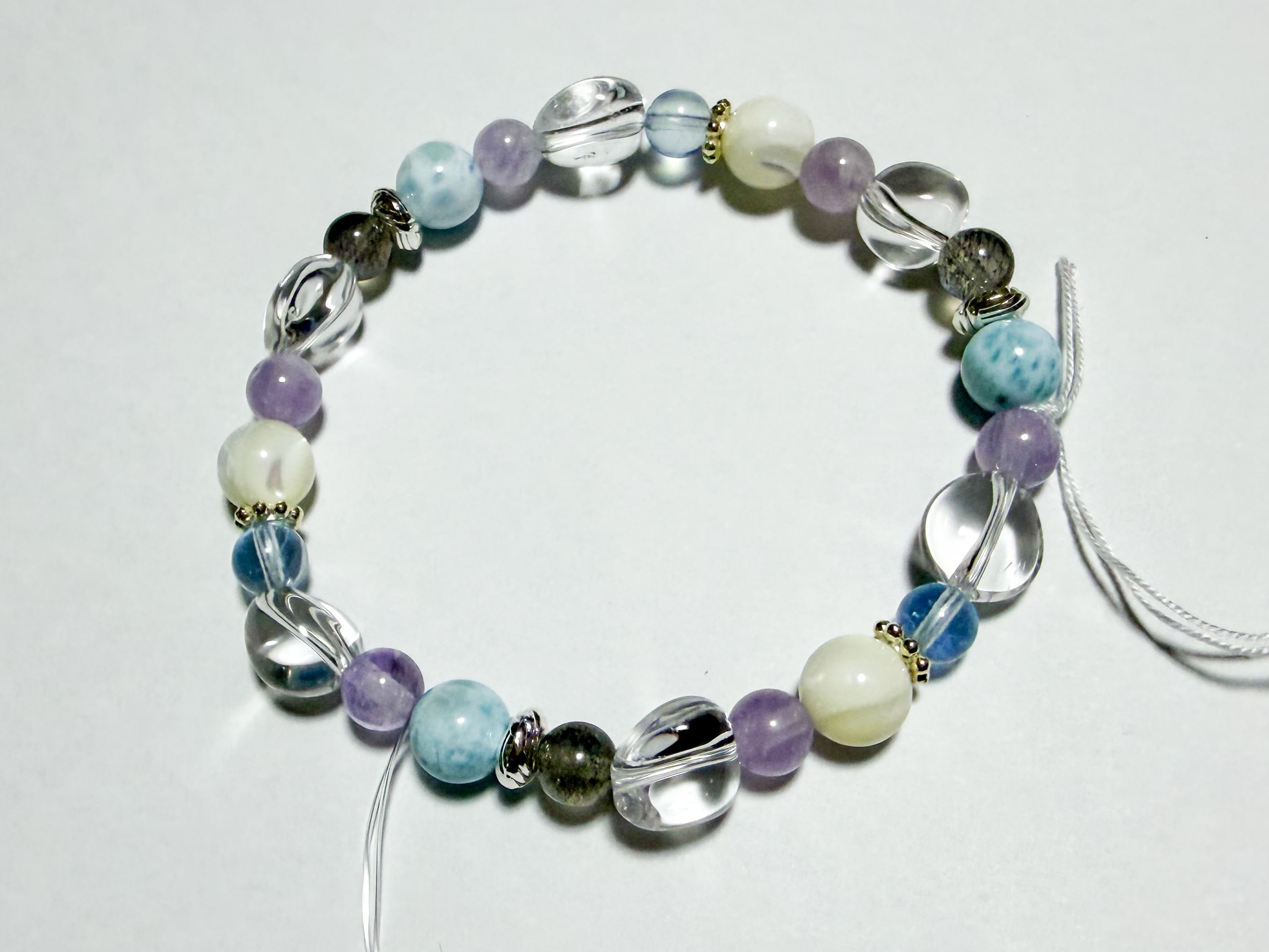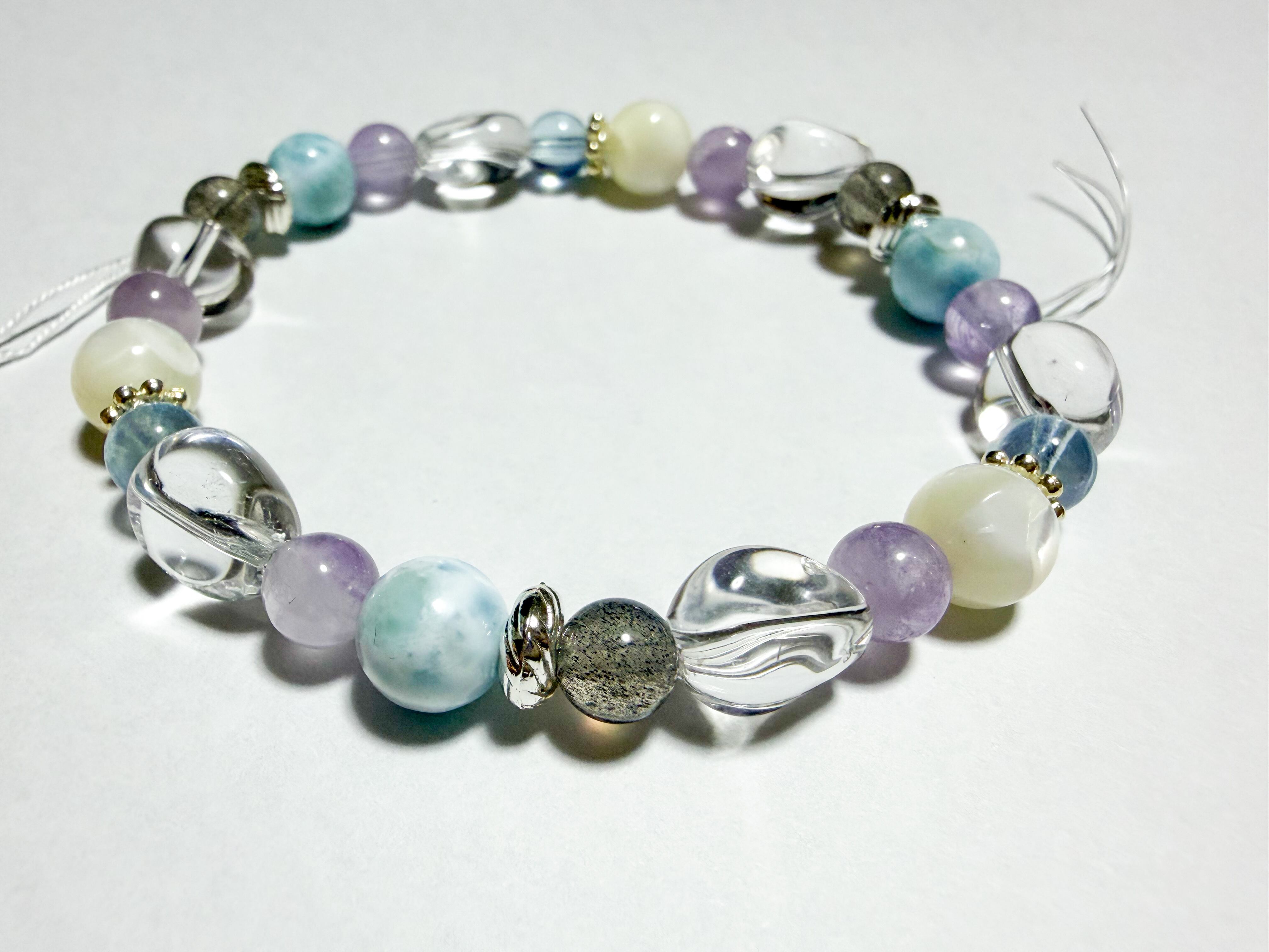 ラリマーとアクアマリン、マザーオブパール、ラベンダーアメジスト、ラブラドライト、水晶のブレスレットは、海や空の美しさを象徴する特別なアイテムです。