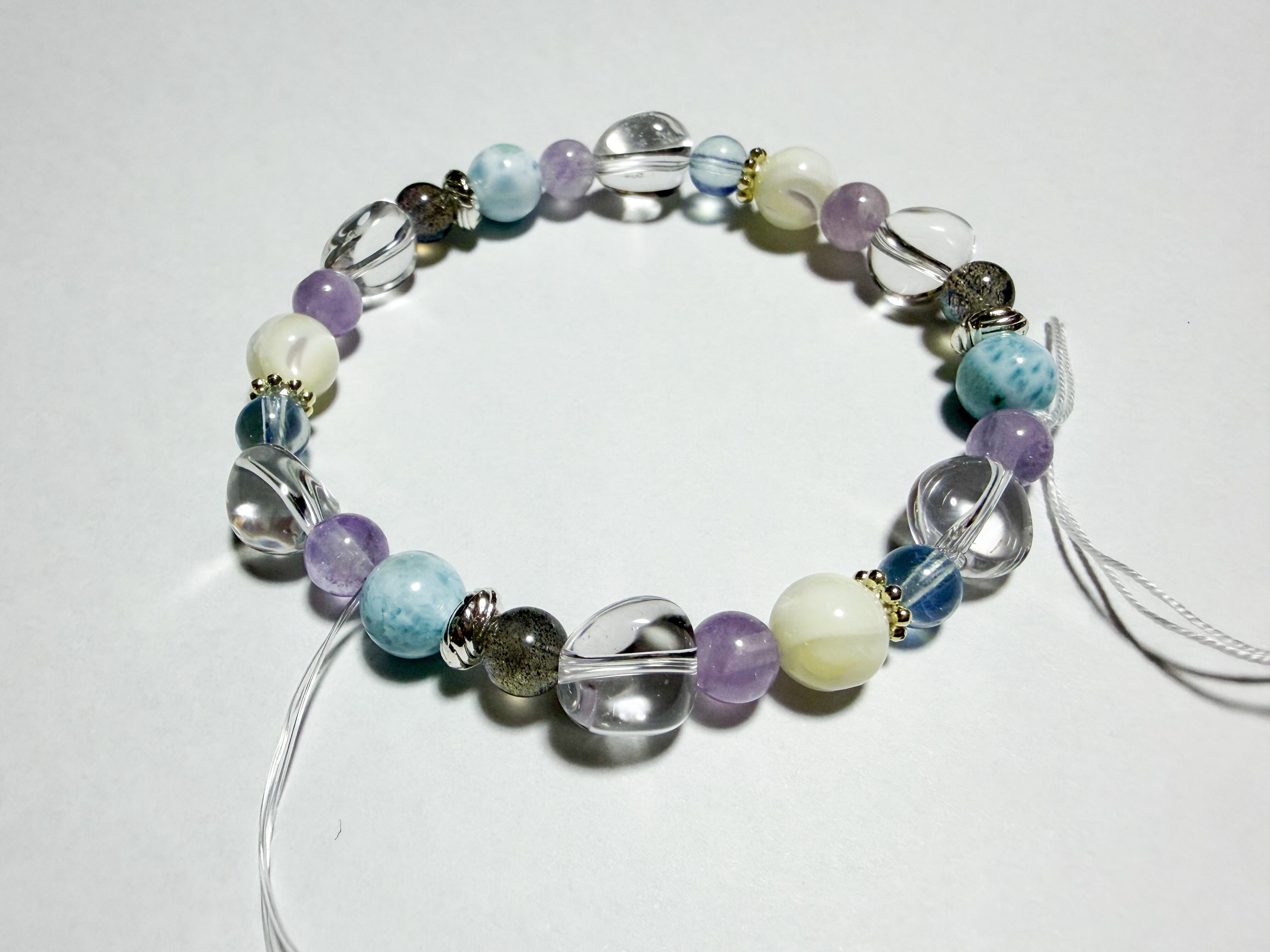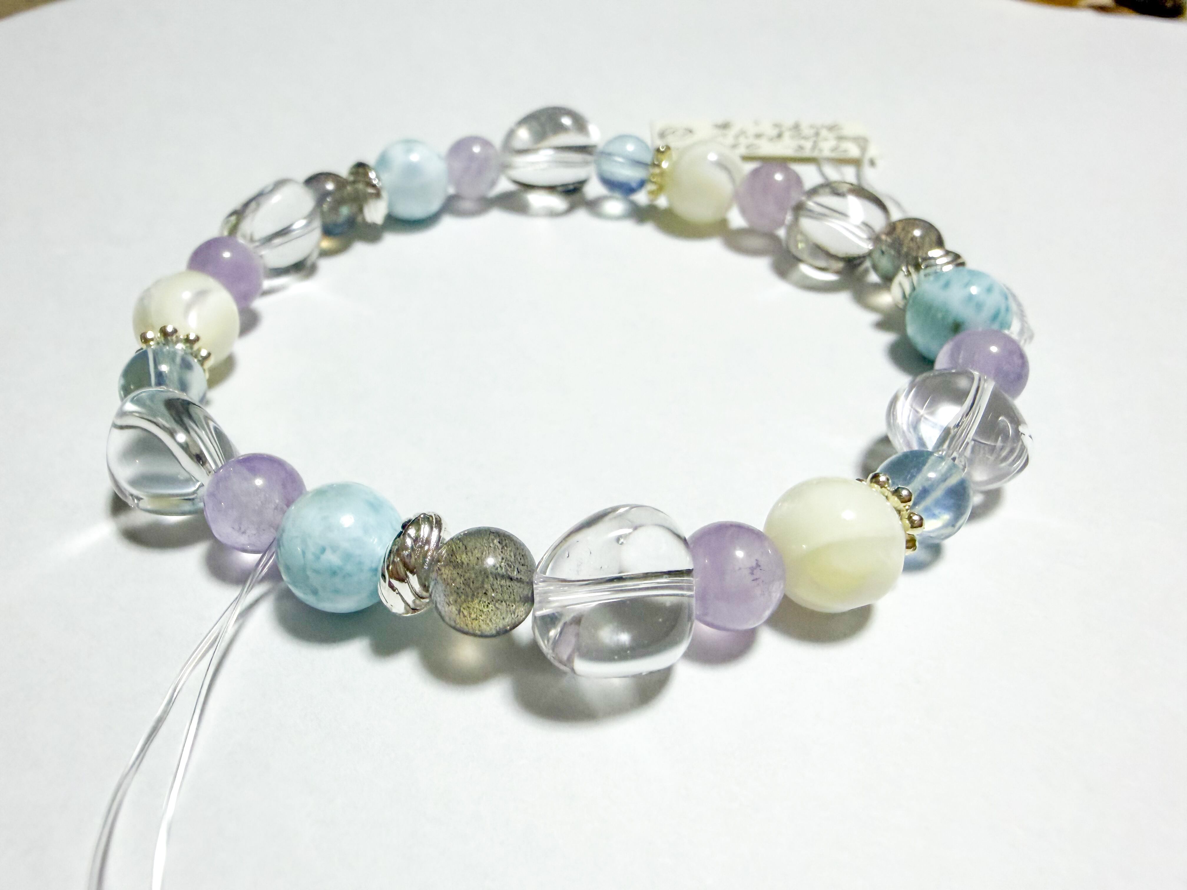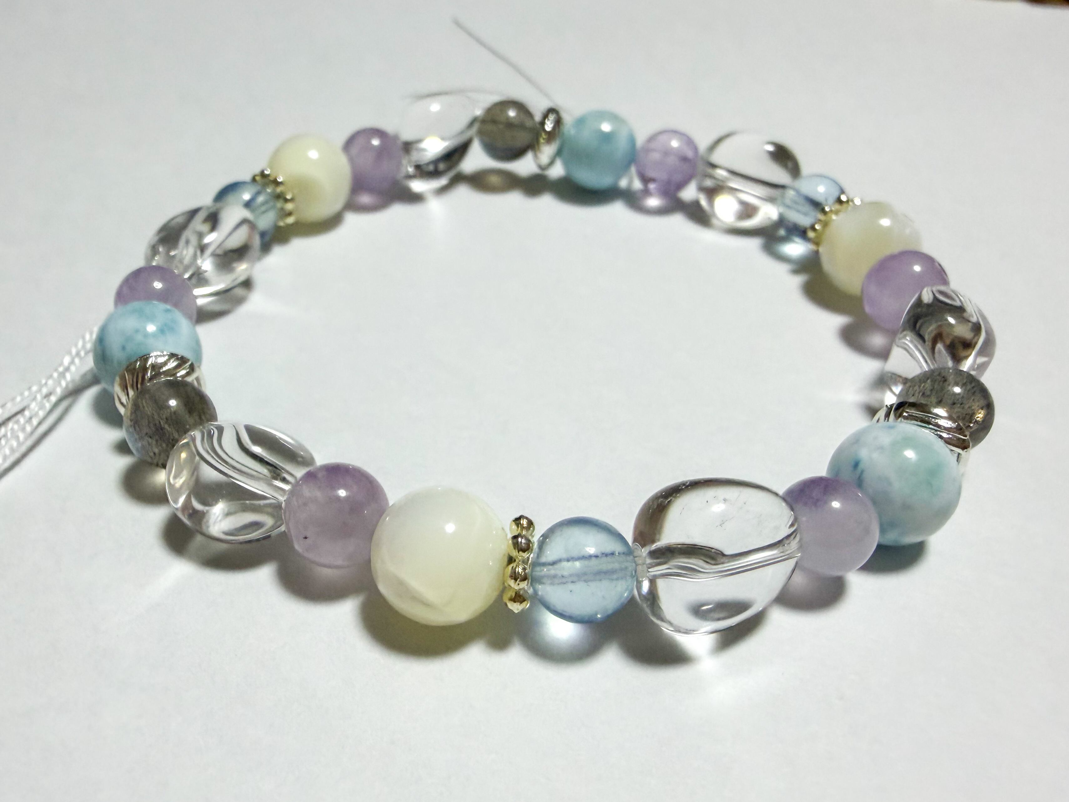 ラリマーとアクアマリン、マザーオブパール、ラベンダーアメジスト、ラブラドライト、水晶のブレスレットは、海や空の美しさを象徴する特別なアイテムです。