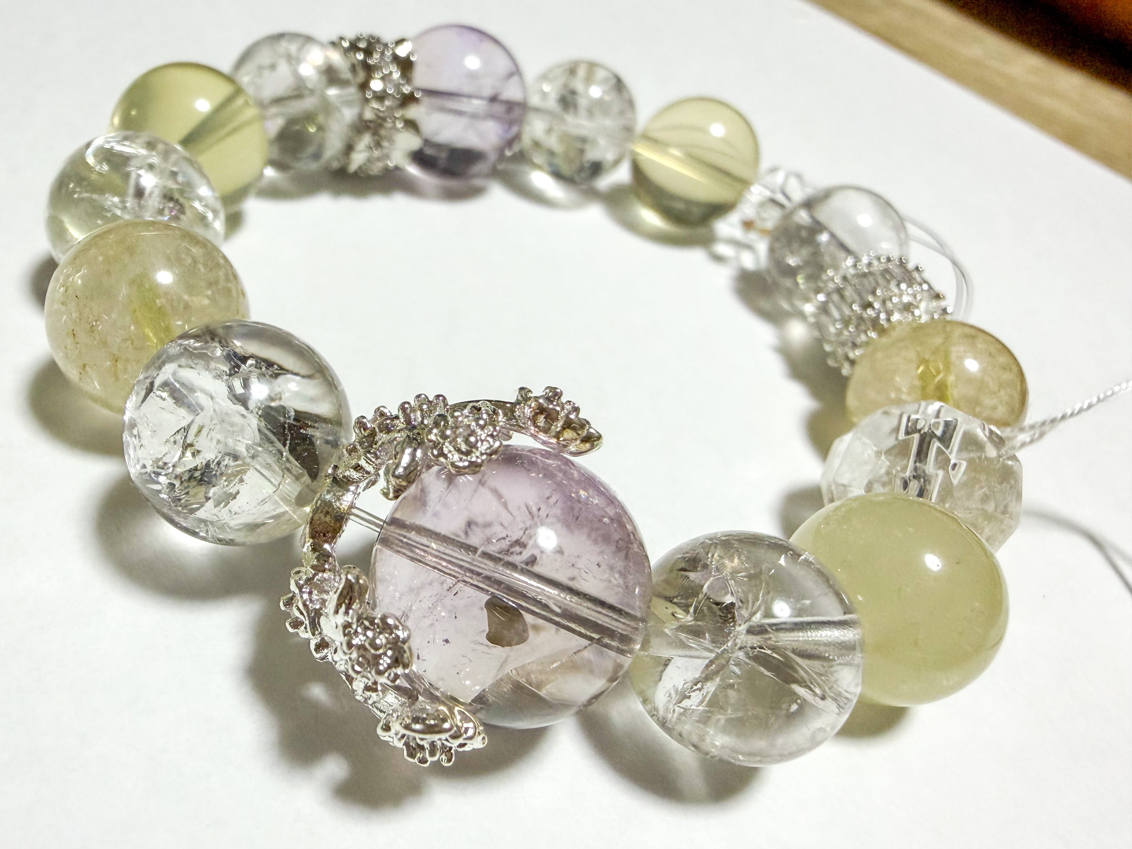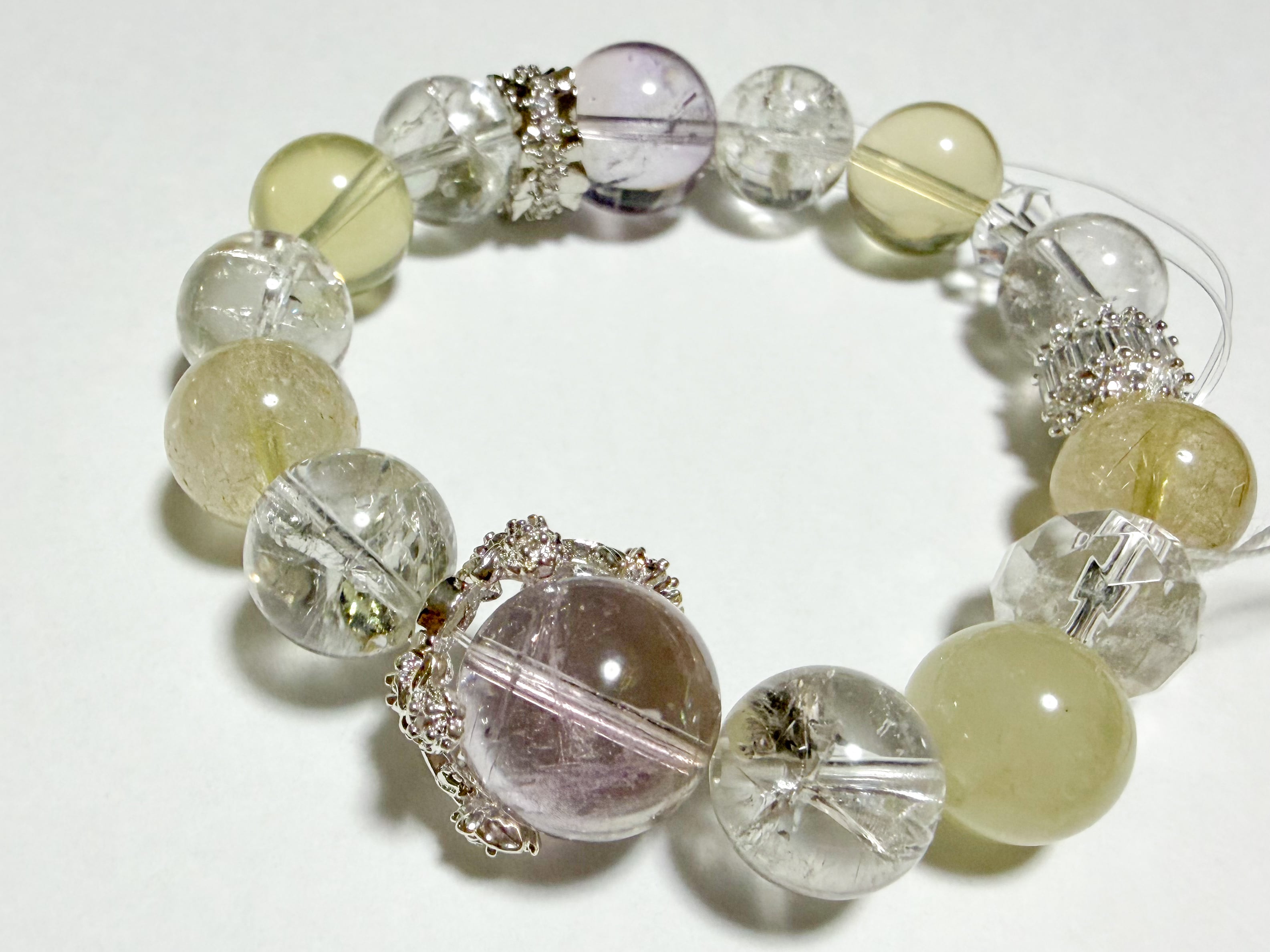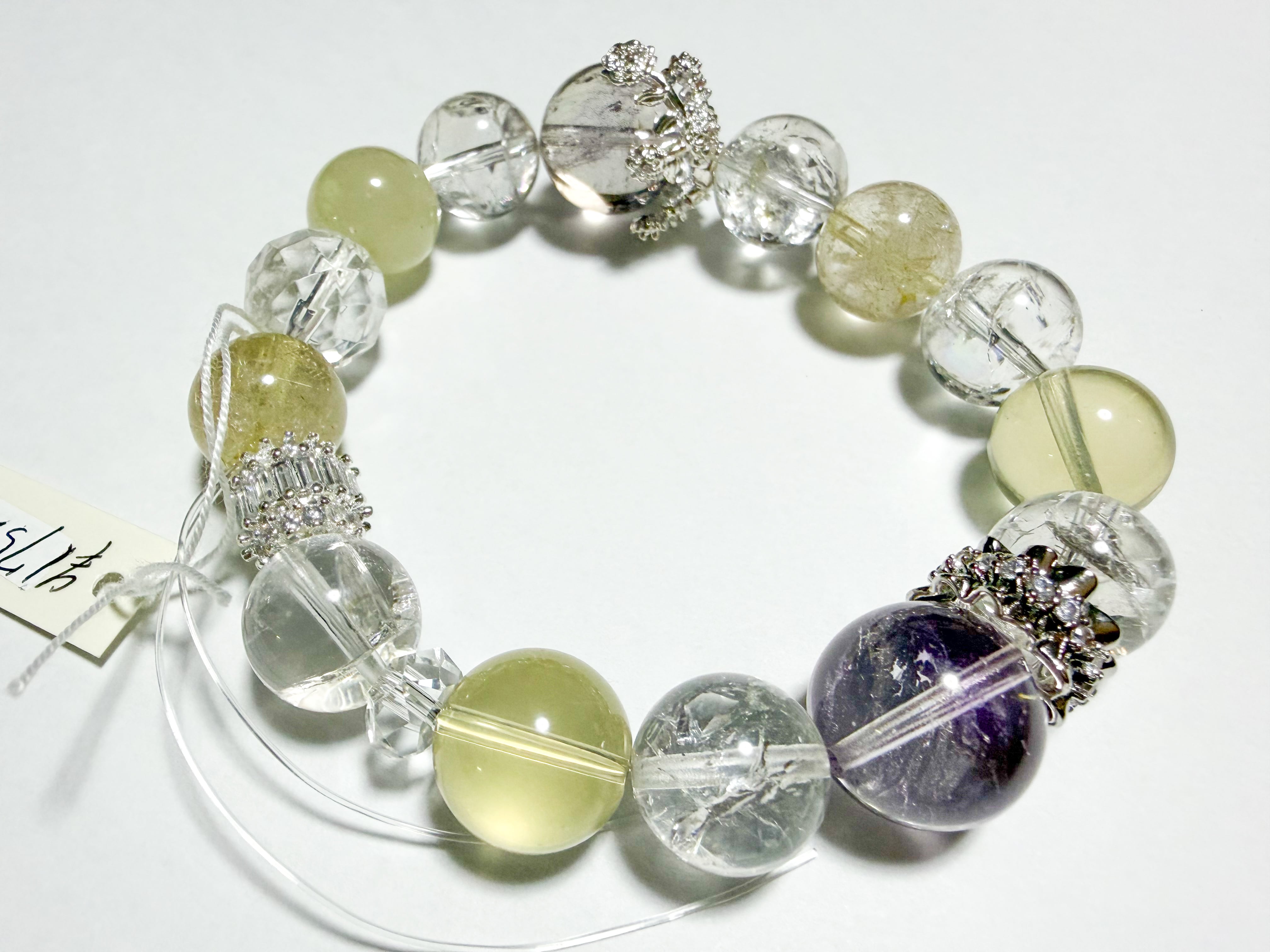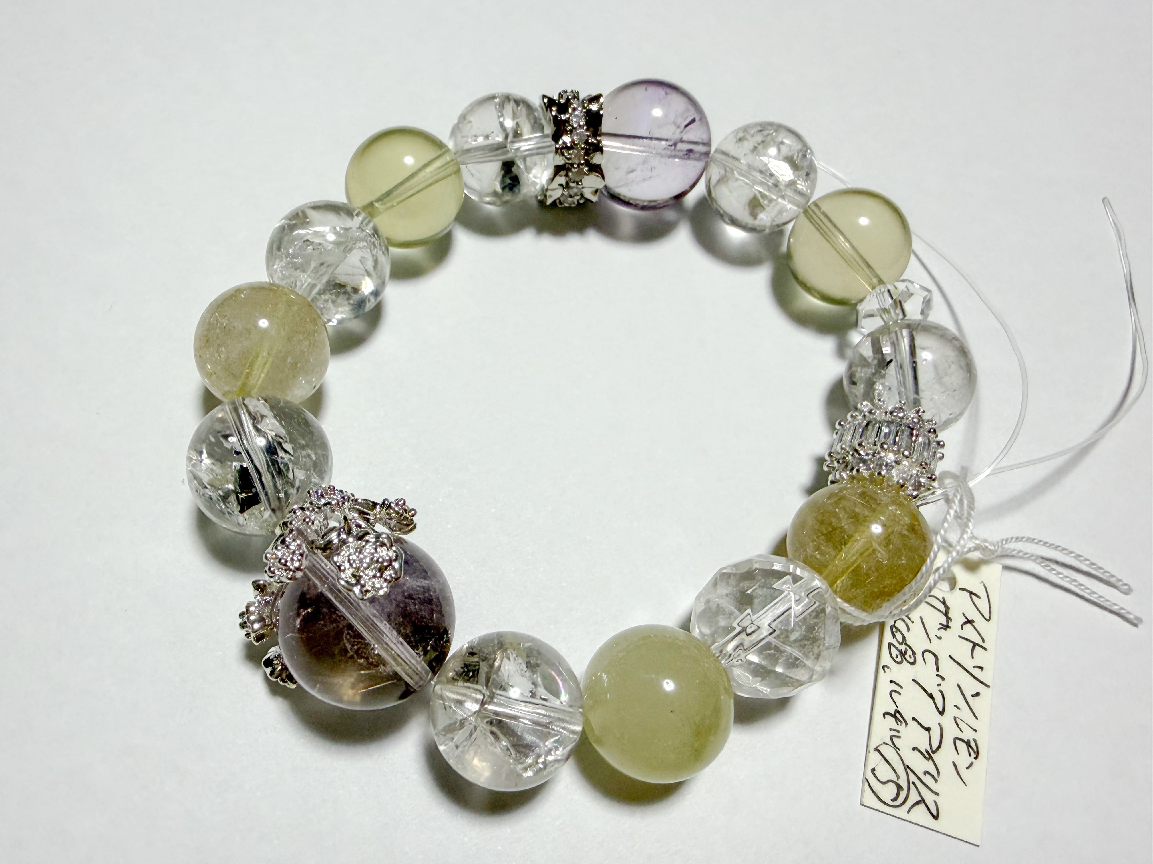 アメトリンとリビアングラスのブレスレットは、自然の美とパワーを融合させた特別なアイテムです。このブレスレットには、アメトリン、ルチル、リビアングラス、ザンビア産アイリスクォーツが使用されており、各ストーンの輝きがあなたの手元を魅力的に飾ります。