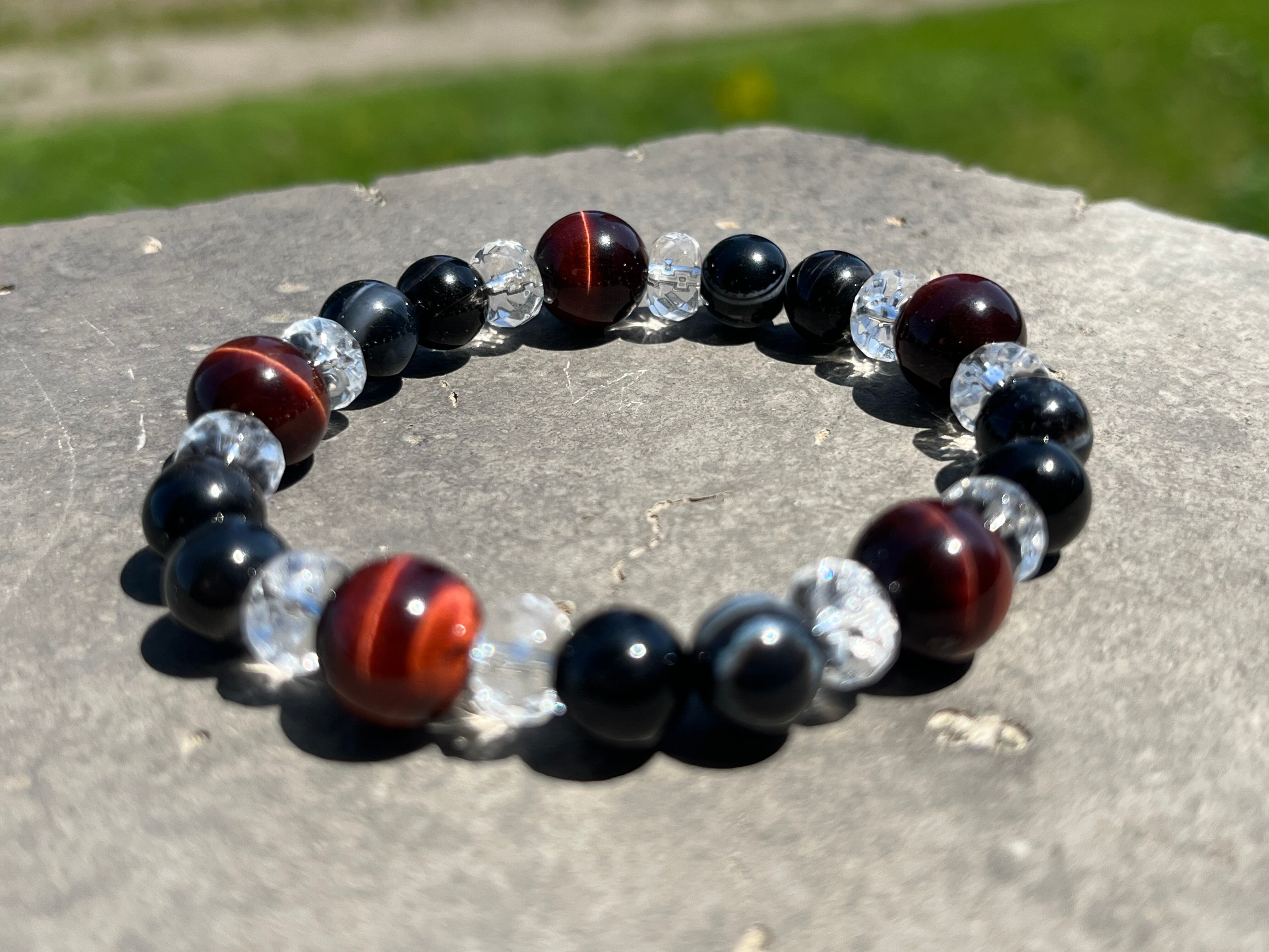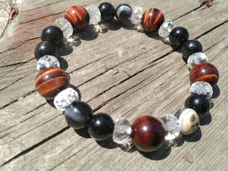 レッドタイガーアイとブラックタイガーアイを組み合わせたブレスを作成しました。間に天眼石を入れることによって魔除けの効果も取り入れ安定したブレスに仕上がりました。
