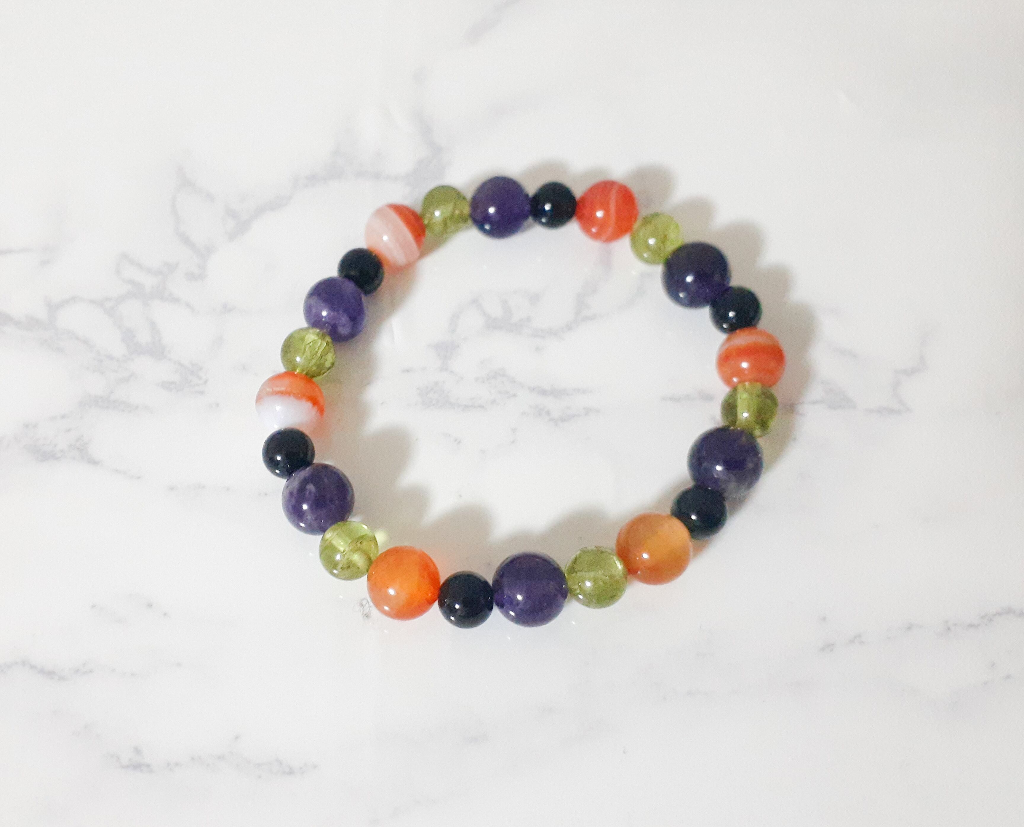 みかん、ぶどう、柿…なんだかいろんな果物に見えてきました…。 太陽の光を集めたようなブレスです。元気が出ない時にもオススメです。8月の誕生石ペリドットのブレスレット。8月お誕生日の方はもちろんのこと、秋色でもあるので、秋好きの方にもオススメ。