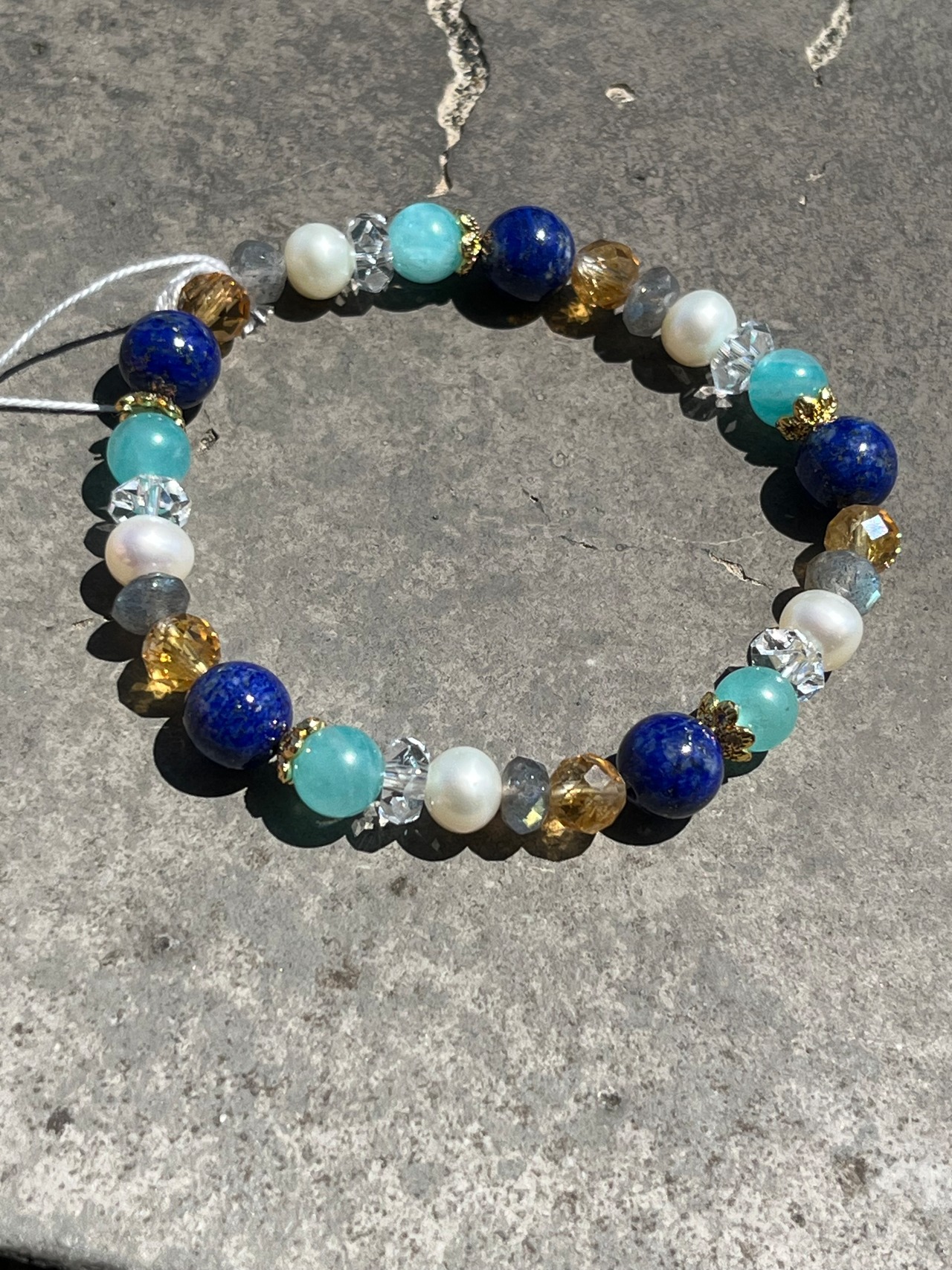 ラピスラズリとアマゾナイトのブレスレット。目標が見つからない、またはあるけれどもなかなか勇気が出ない、というあなたにおすすめのブレスレット。宇宙と繋がりながら自分の役割を全うしていきたい人におすすめ。
