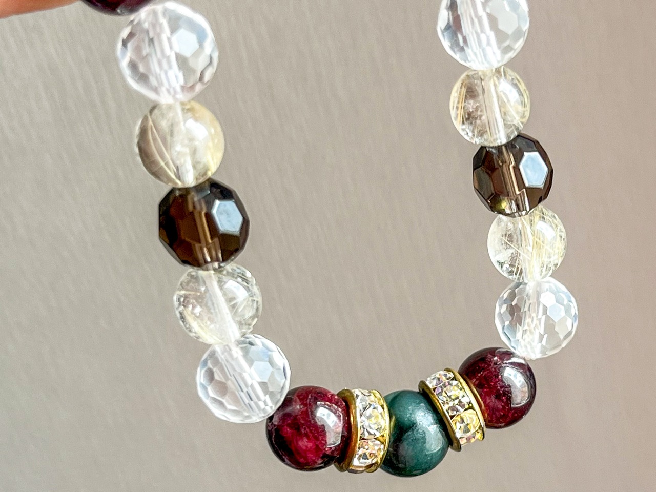 知性を司るエメラルドと金運アップの象徴ルチルの組み合わせブレスレットです。ガーネット、スモーキークオーツを一緒に組み合わせることで地に足をつけながらお金を得ていくようなイメージブレスに仕上がりました。