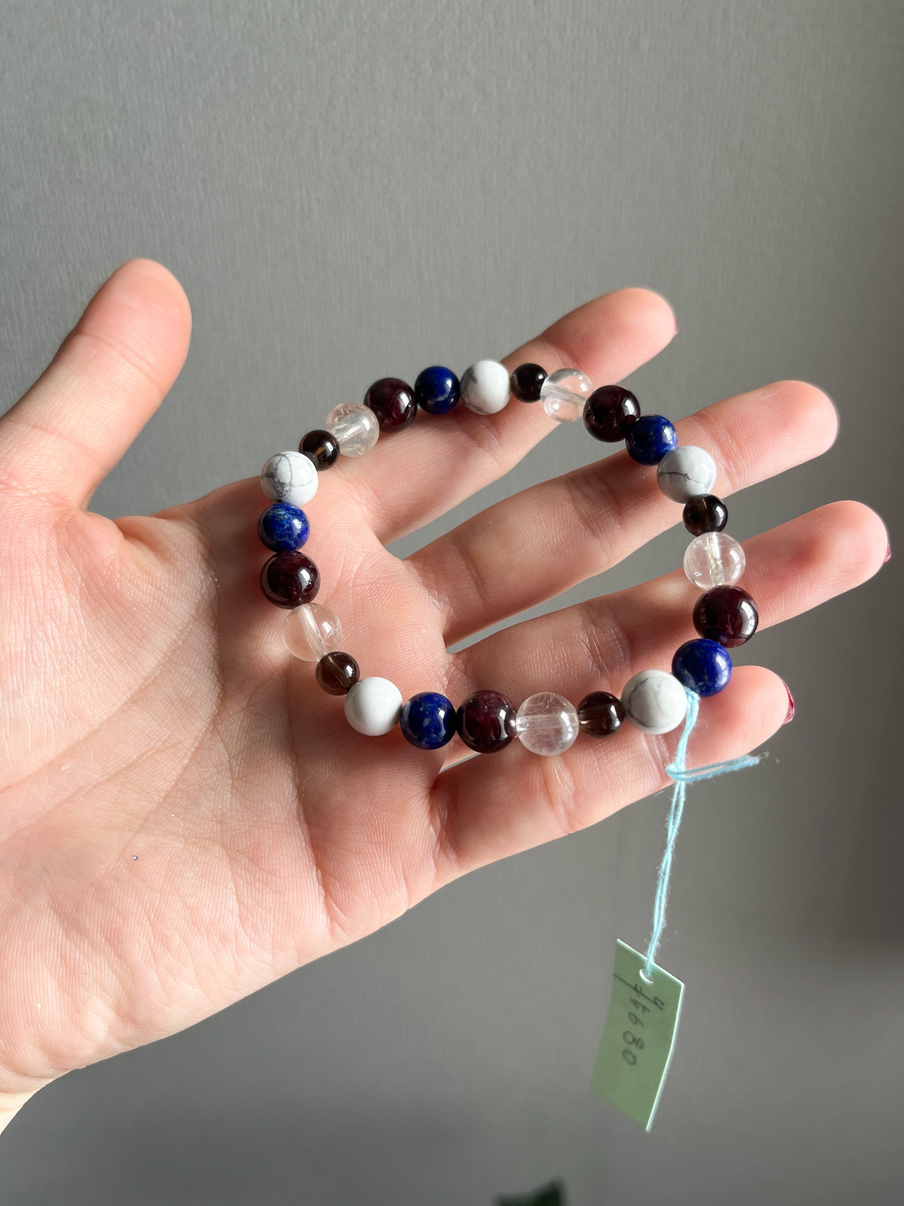 地に足をつける赤の石と言えばガーネット!目標達成にむかって努力していきたいと思っているあなたにオススメのブレスレットです。強い意志で前に進むことを後押ししてくれるラピスラズリと、魔除の効果があるハウライトとスモーキークォーツで新しい人生をスタートさせられます。入学、就職、試験、などにもおすすめ。