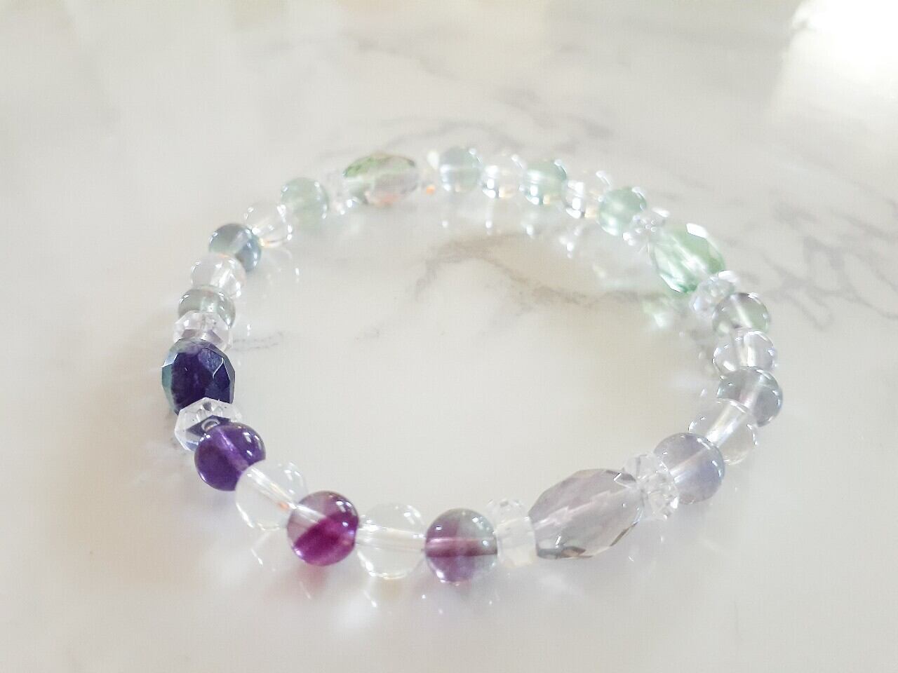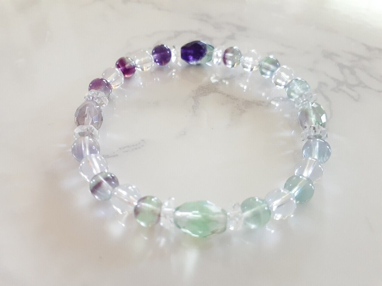 フローライトは霊性を高めるストーンとして人気が高いです。今回はマルチカラーのカラフルなフローライトを使ったうる艶のブレスレットに仕上げました。