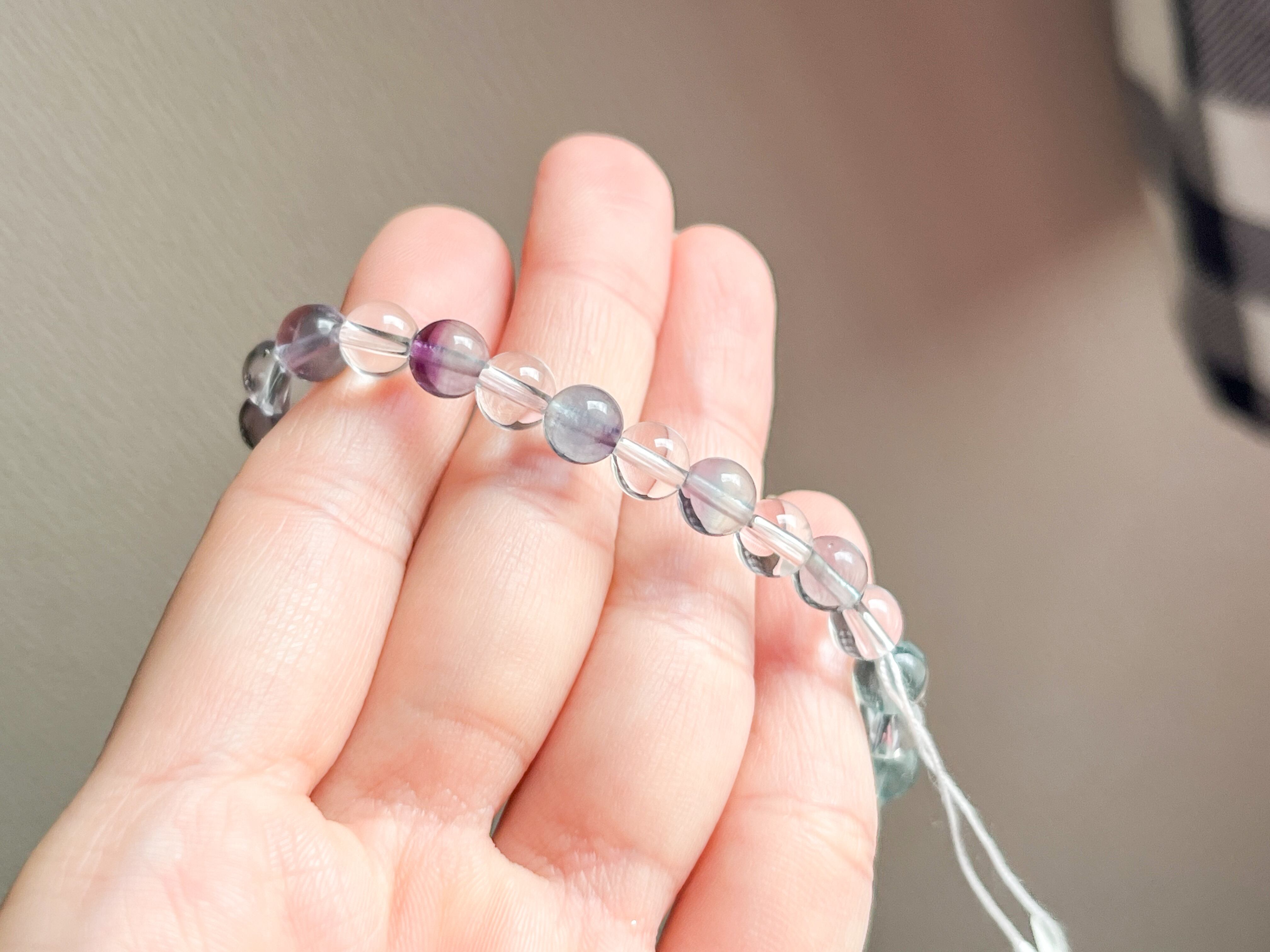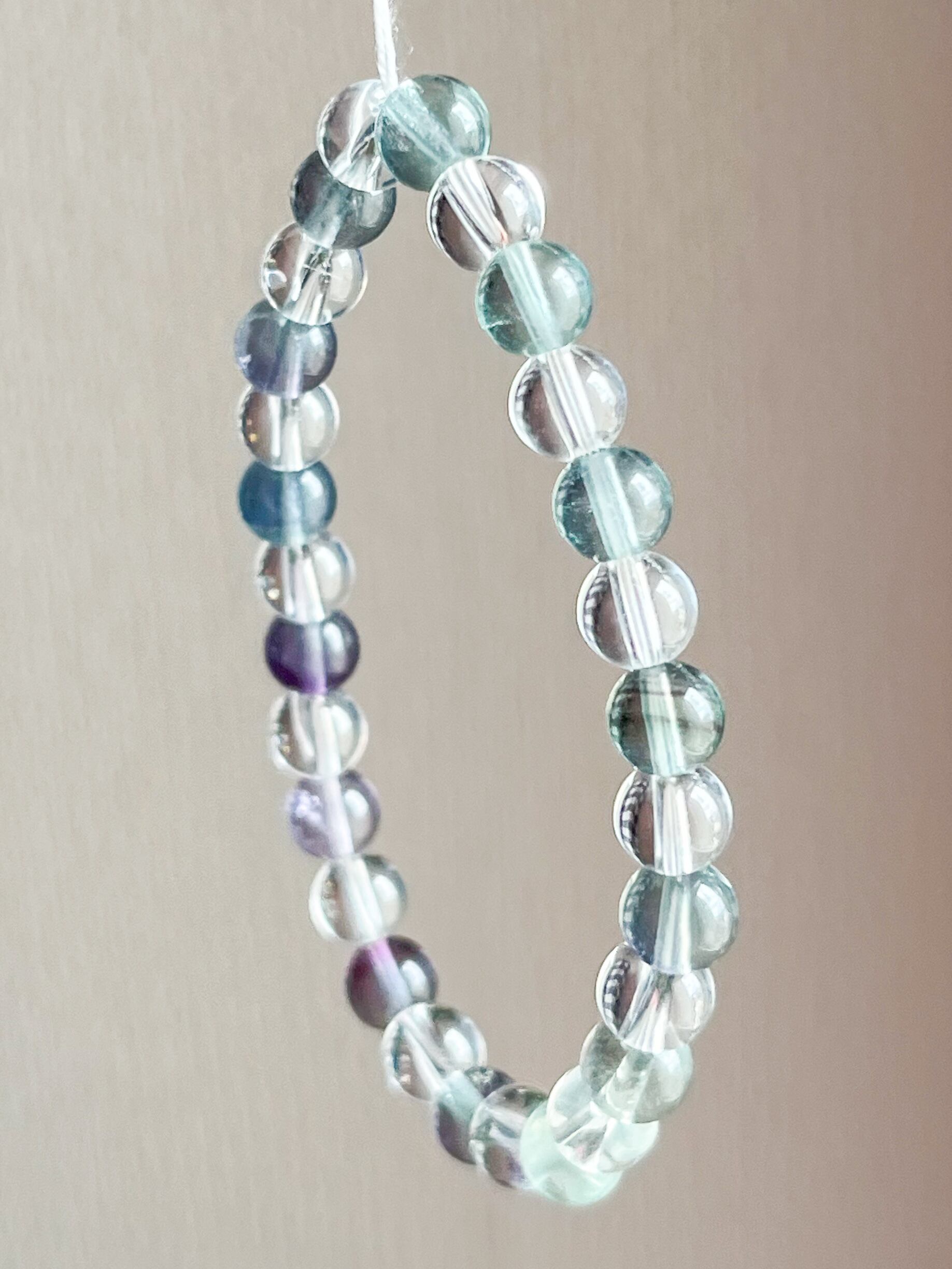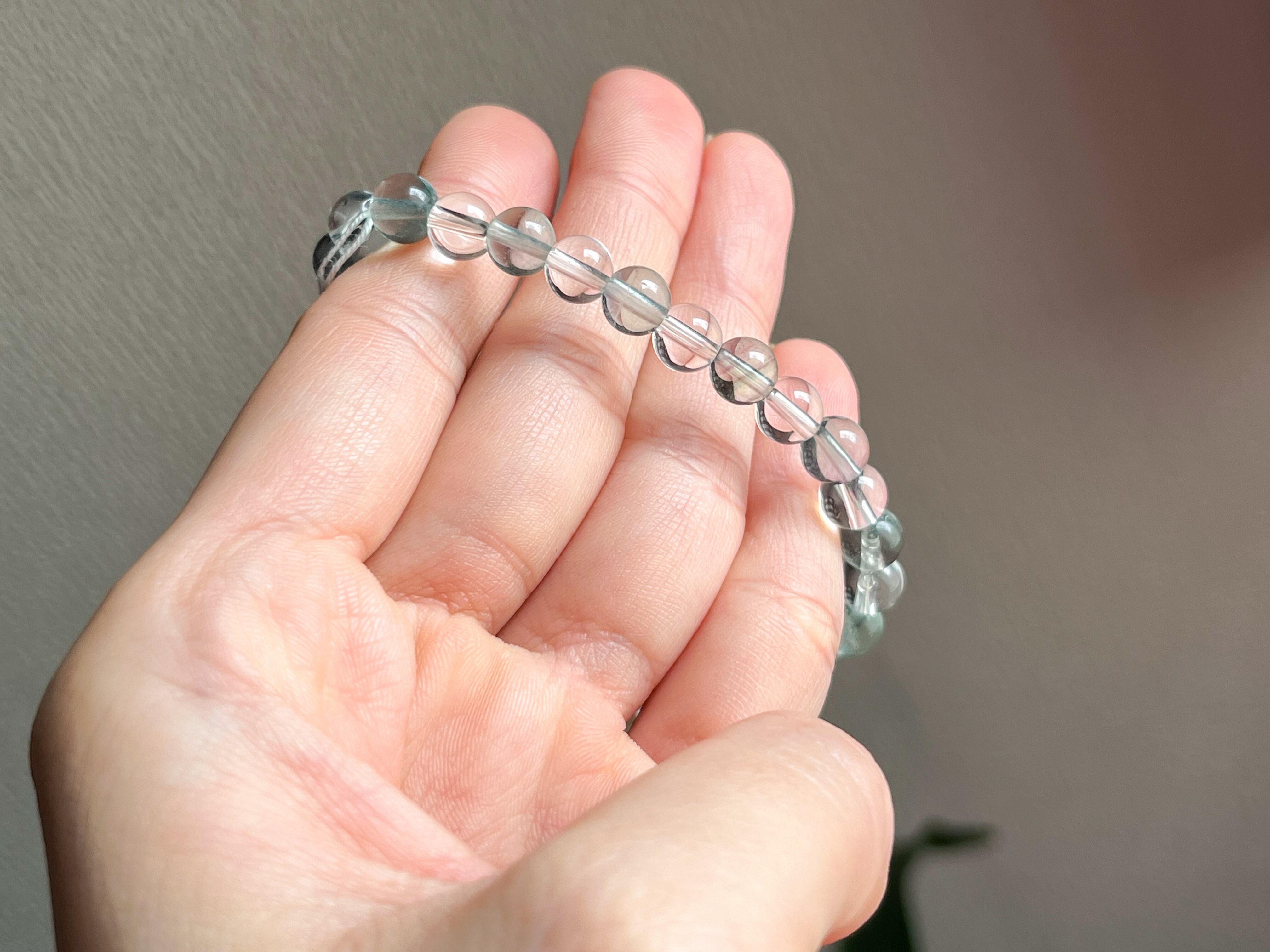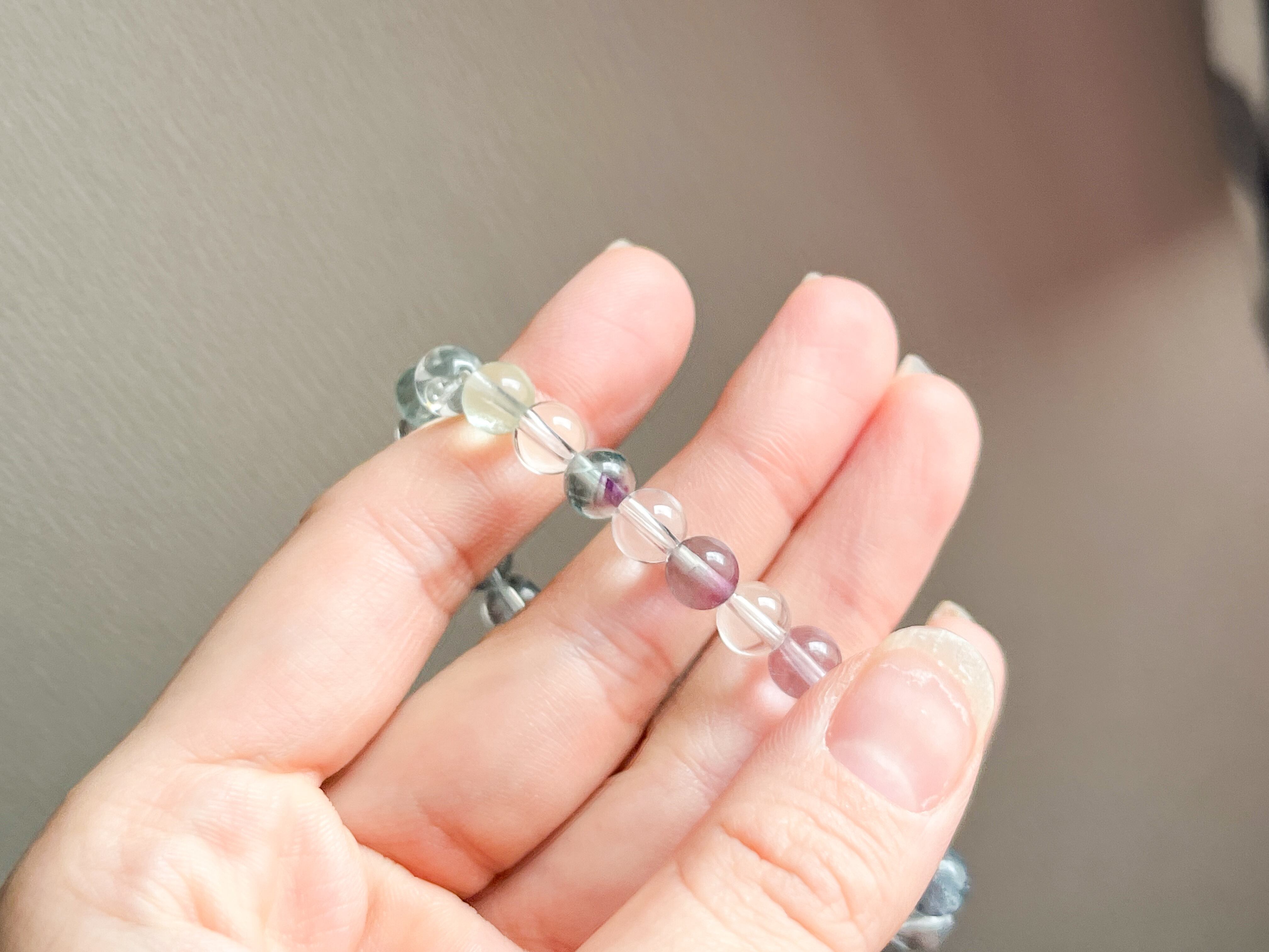 フローライトと水晶を使用した魅力的なブレスレットです。フローライトは多彩な色合いを持ち、見る人を引き込む美しさが特徴です。また、水晶はその透明感と輝きが際立ち、全体の印象を引き締めています。