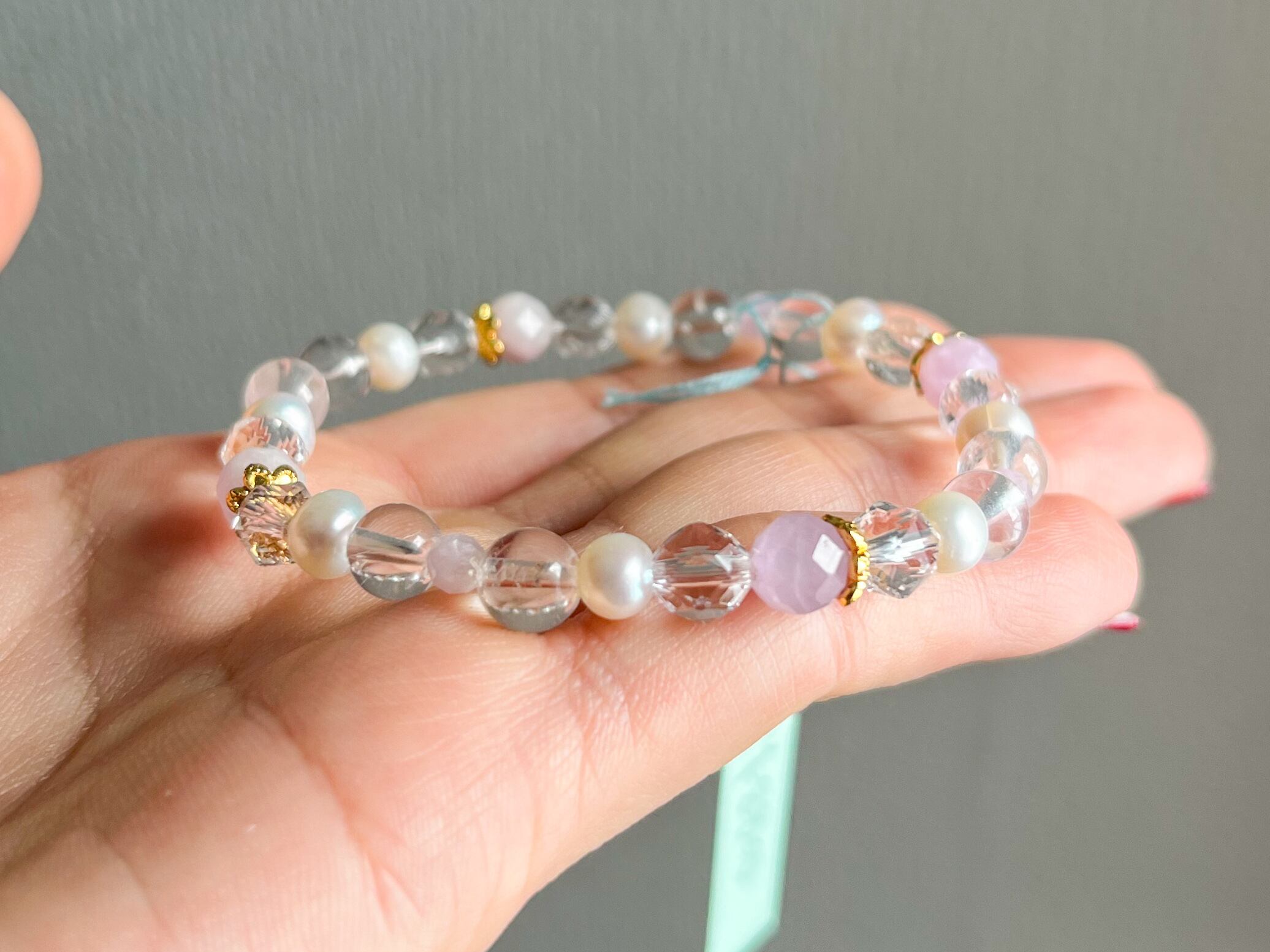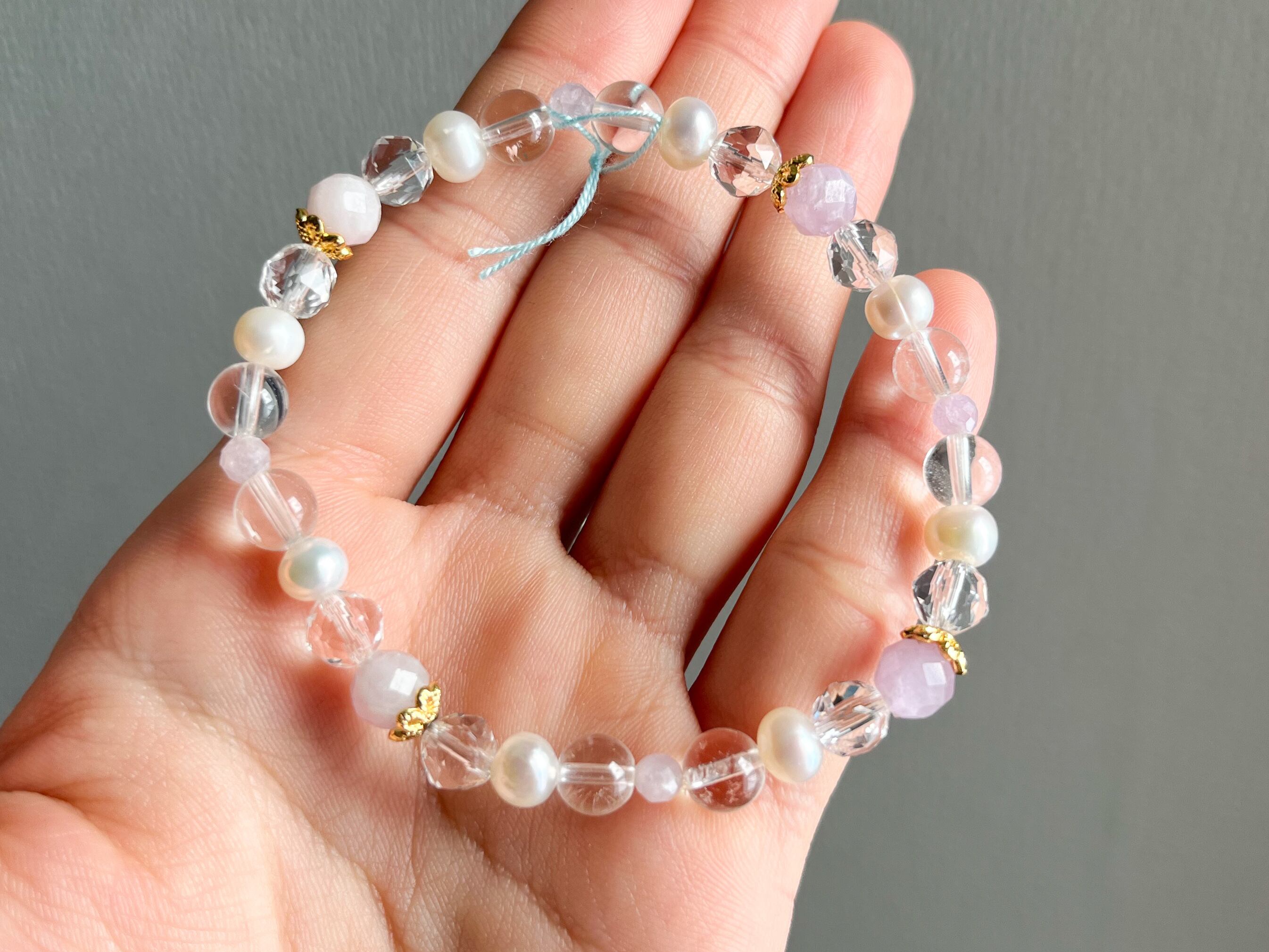 9月の誕生石クンツァイトを組み合わせた上品なブレス。優しいピンクが疲れた心を癒してくれます。夏の疲れを和らげてくれるクンツァイト。2022年から9月の誕生石に仲間入りしました。パールと水晶との組み合わせで上品、かつ爽やかなブレスレットに仕上げました。
