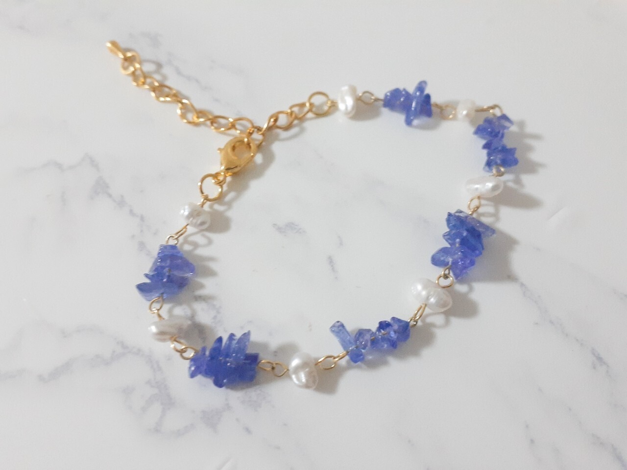 十二月の誕生石、タンザナイトを使ったブレスレットです。透明度の高いタンザナイトサザレなので存在感もあります。パールとの組み合わせで大人かわいい印象に。