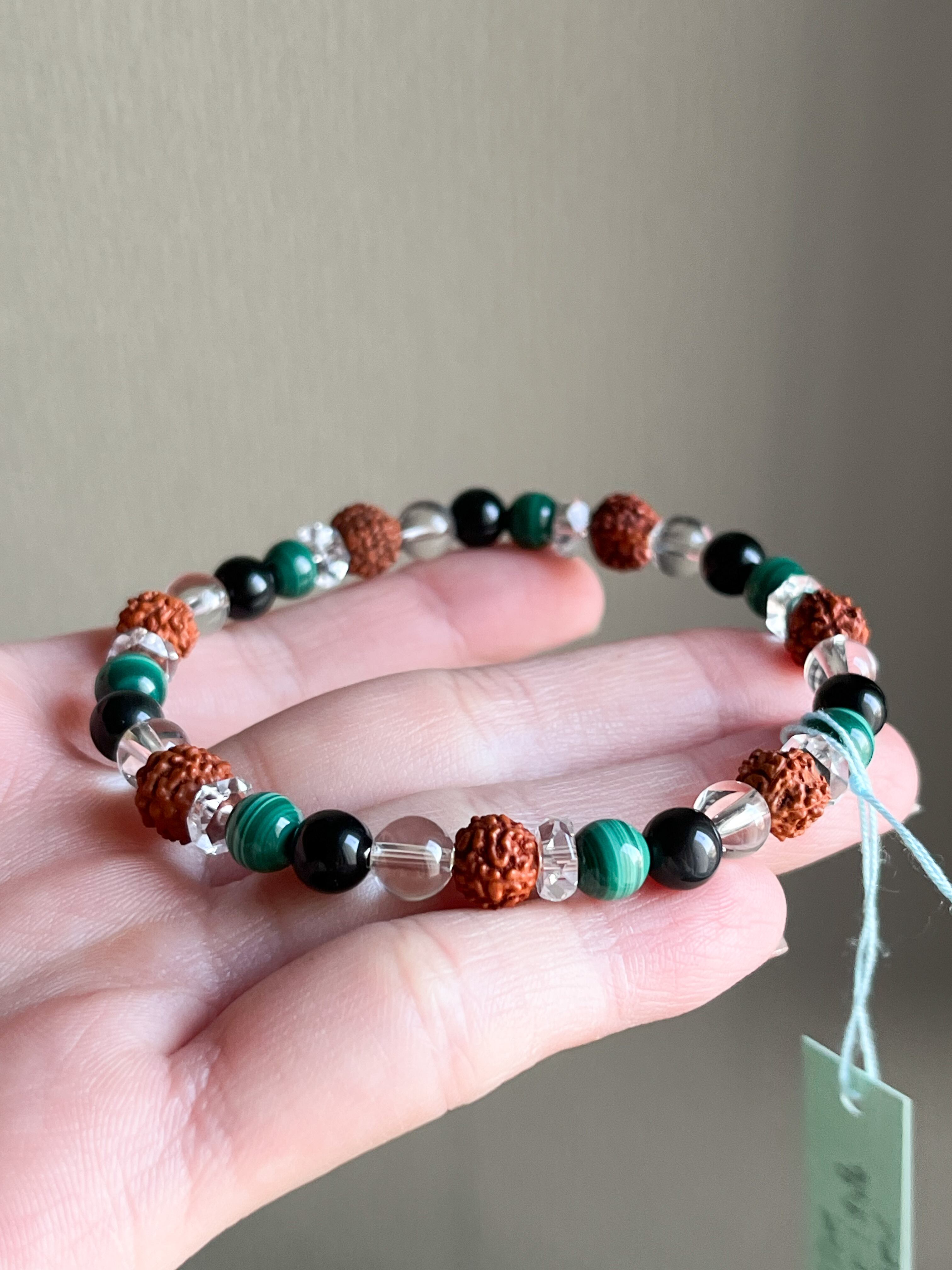ルドラクシャはインドで瞑想の時や魔除けの道具として使われてきた伝統的なものです。マラカイトとオブシディアンとの組み合わせで魔除けの力をさらにアップ。マラカイトは解毒や浄化、睡眠の質を向上させるなどの役目を果たすと言われています。疲れやすい人や憑やすい人にもおすすめのブレスレットです。