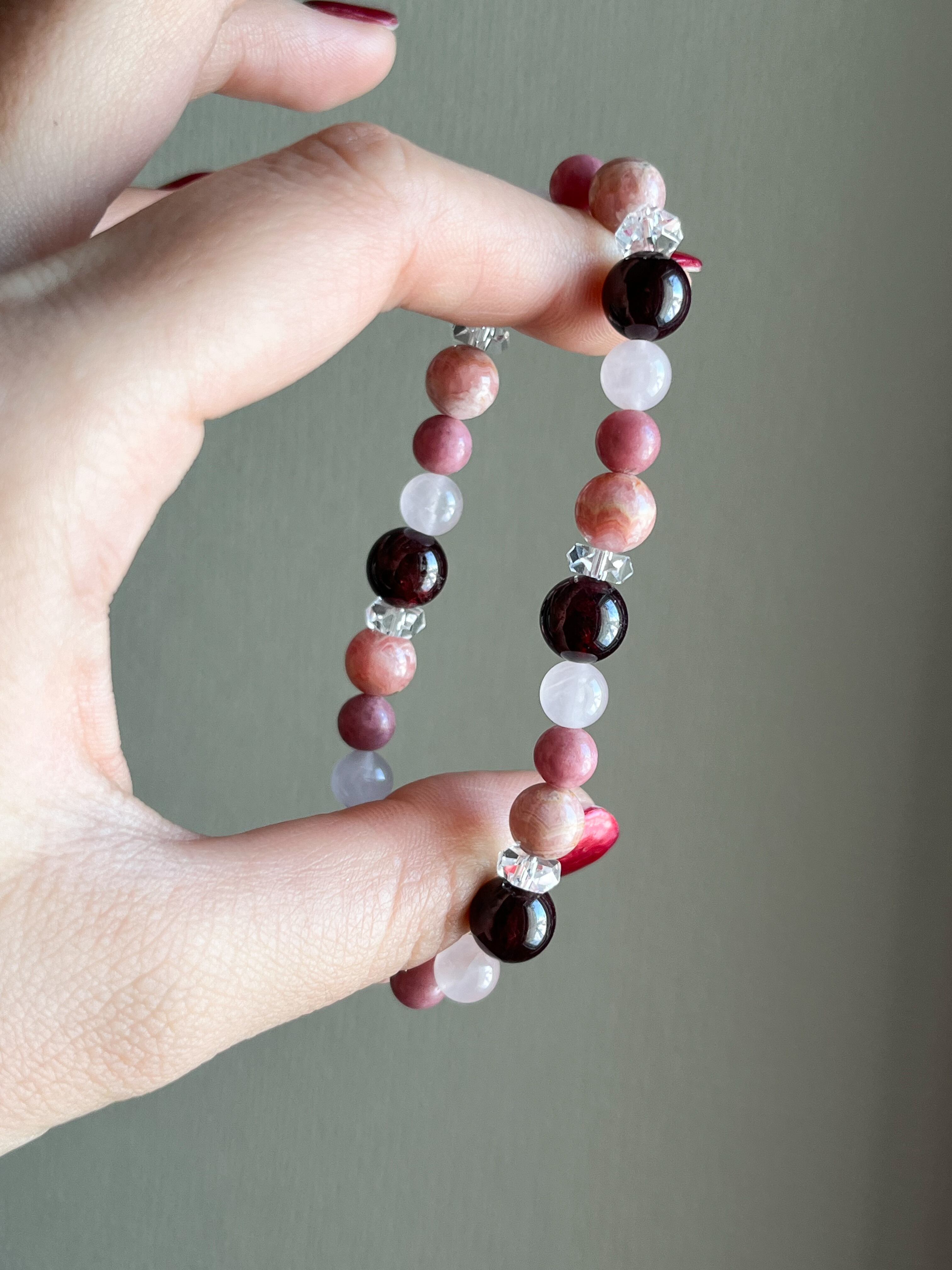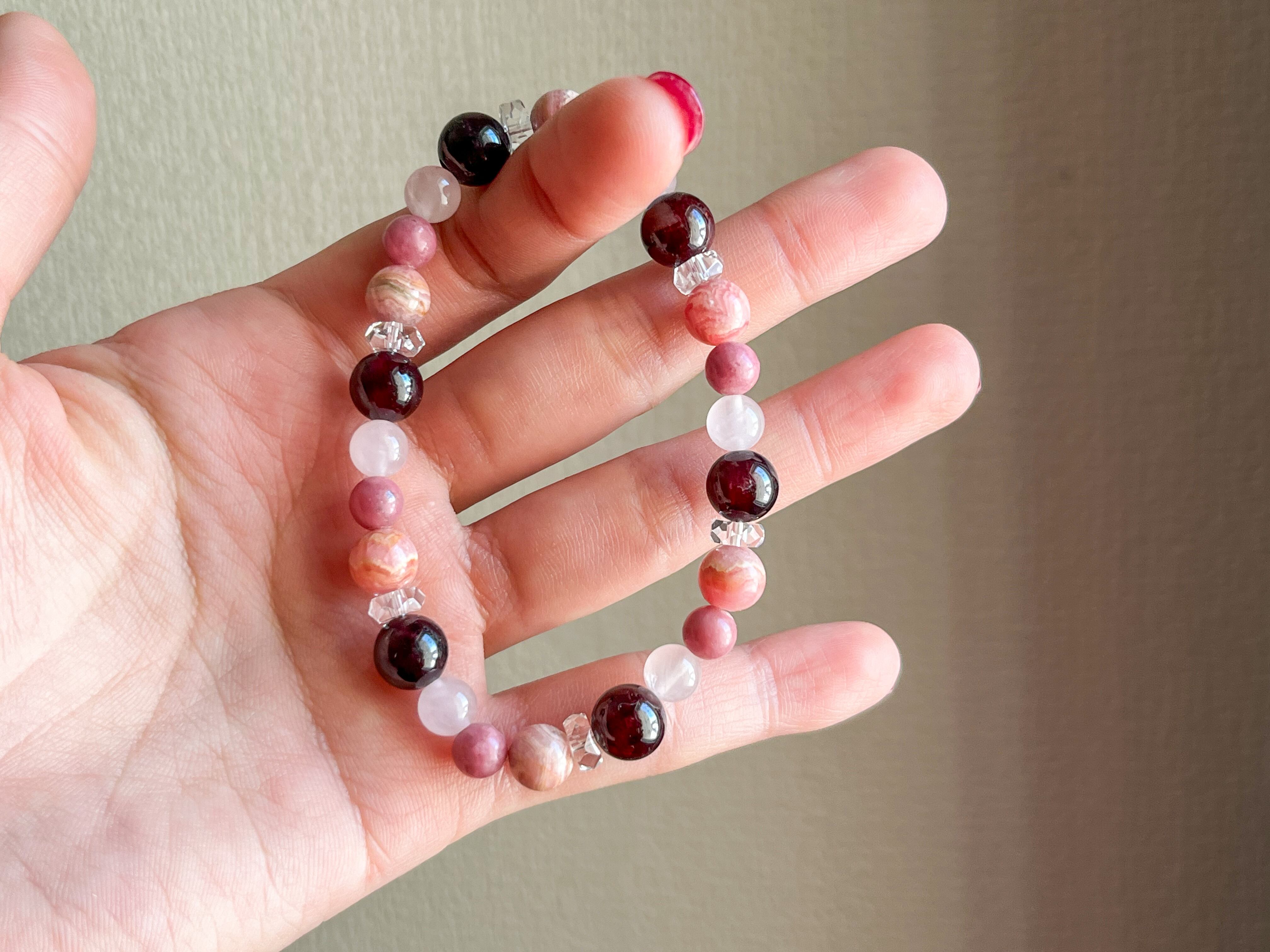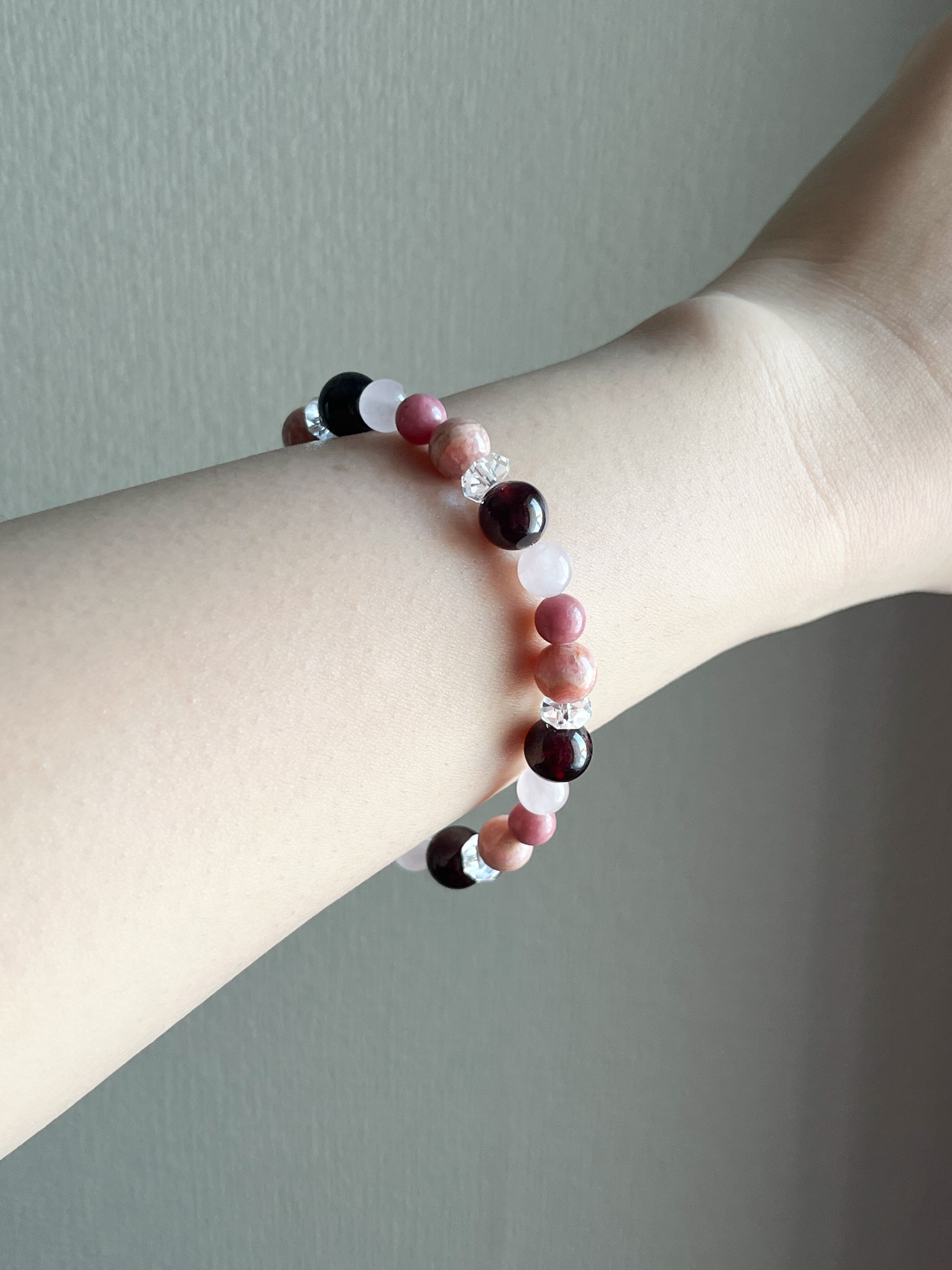 ガーネットとインカローズ、ロードナイト、ローズクォーツ、水晶の組み合わせブレスレットです。ガーネットは気持ちがぶれやすい人や一途になりたい人にもおすすめブレスレットです。