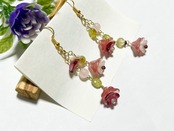 グロッシュラーガーネット(グリーンガーネット)がきらりとひかる可愛らしいイヤリングです。お花の先にはガーネットやラブラドライトなどをちょこんとあしらって細かなところまでこだわったピアスになっています。