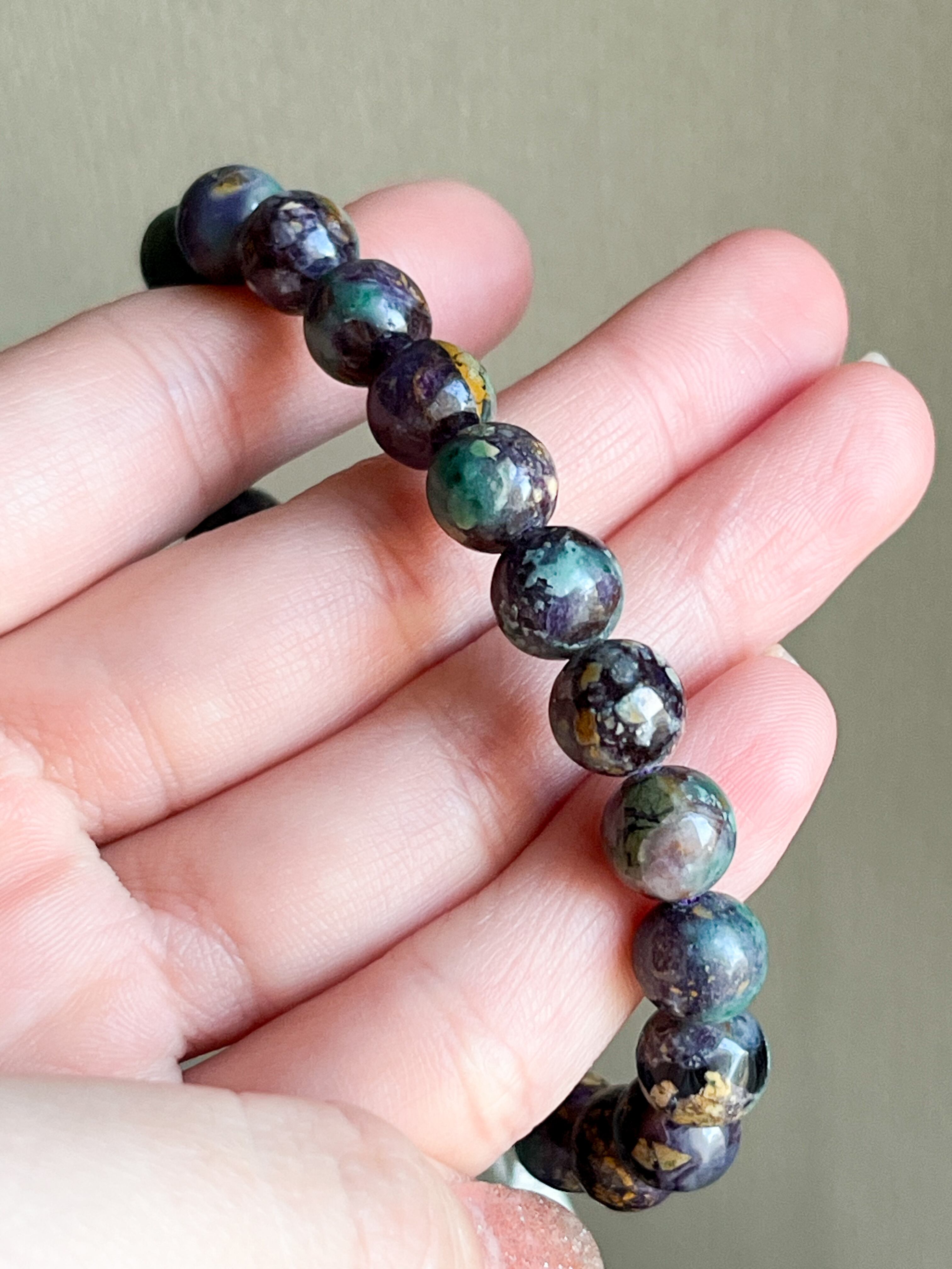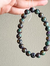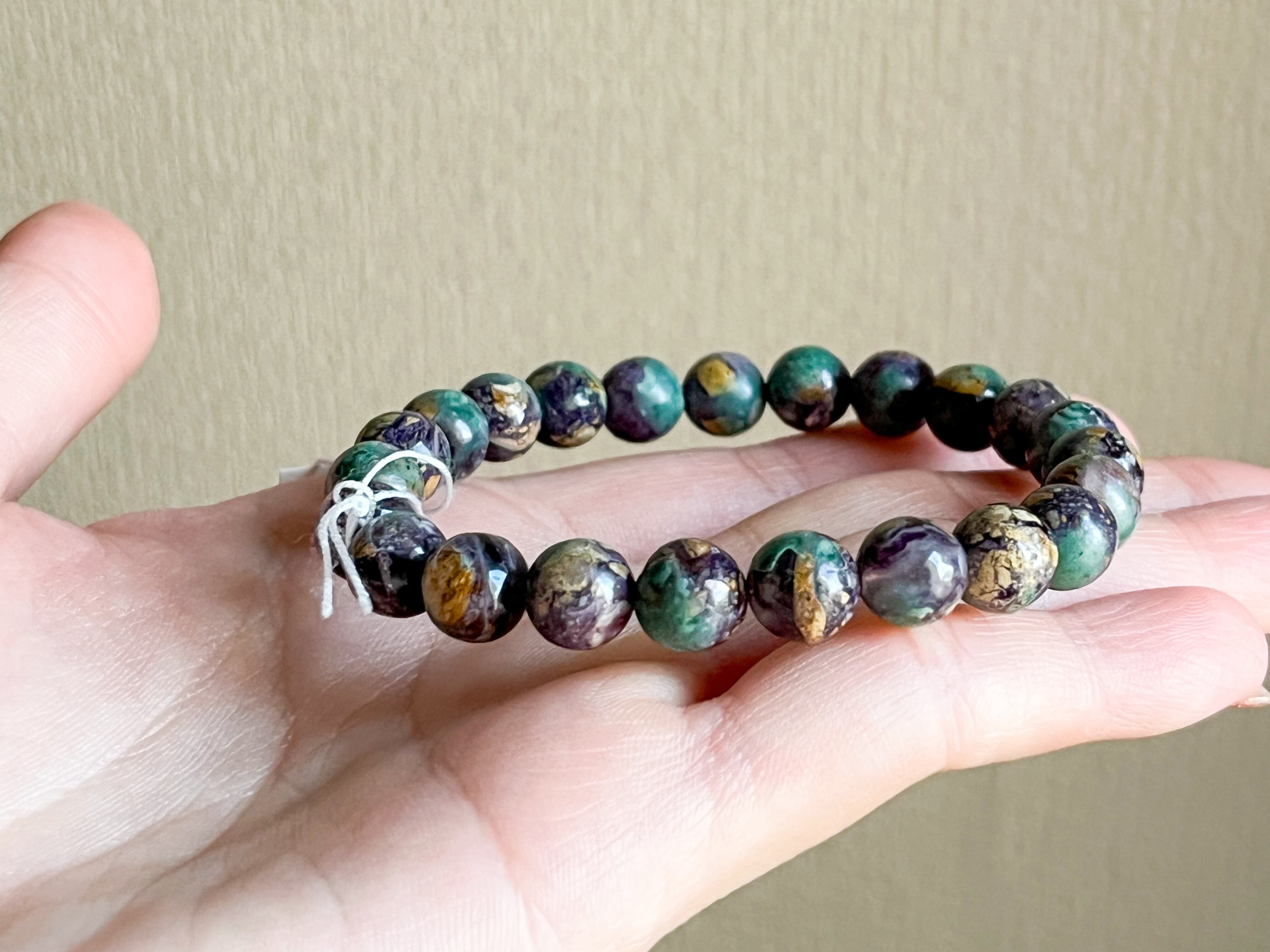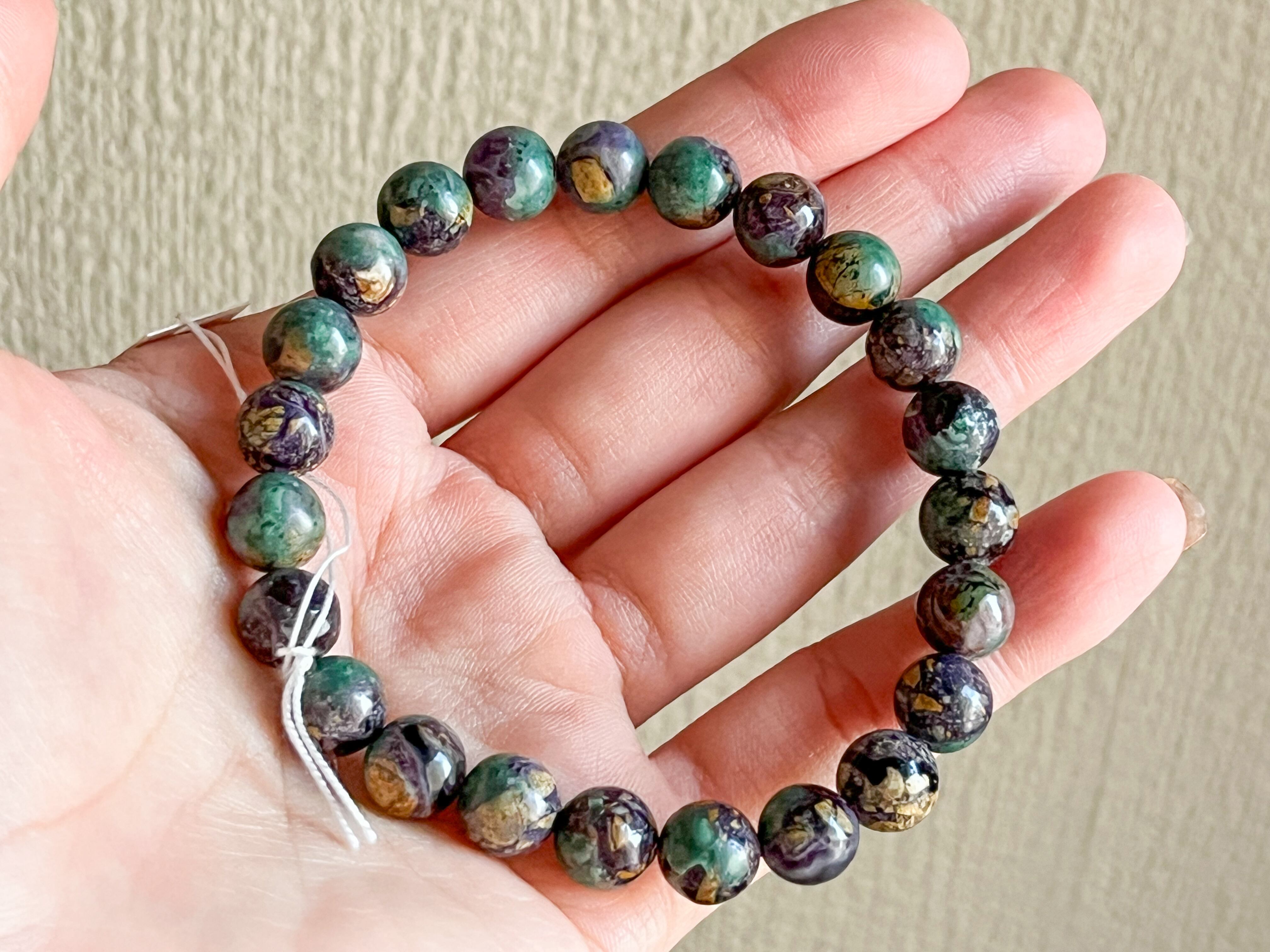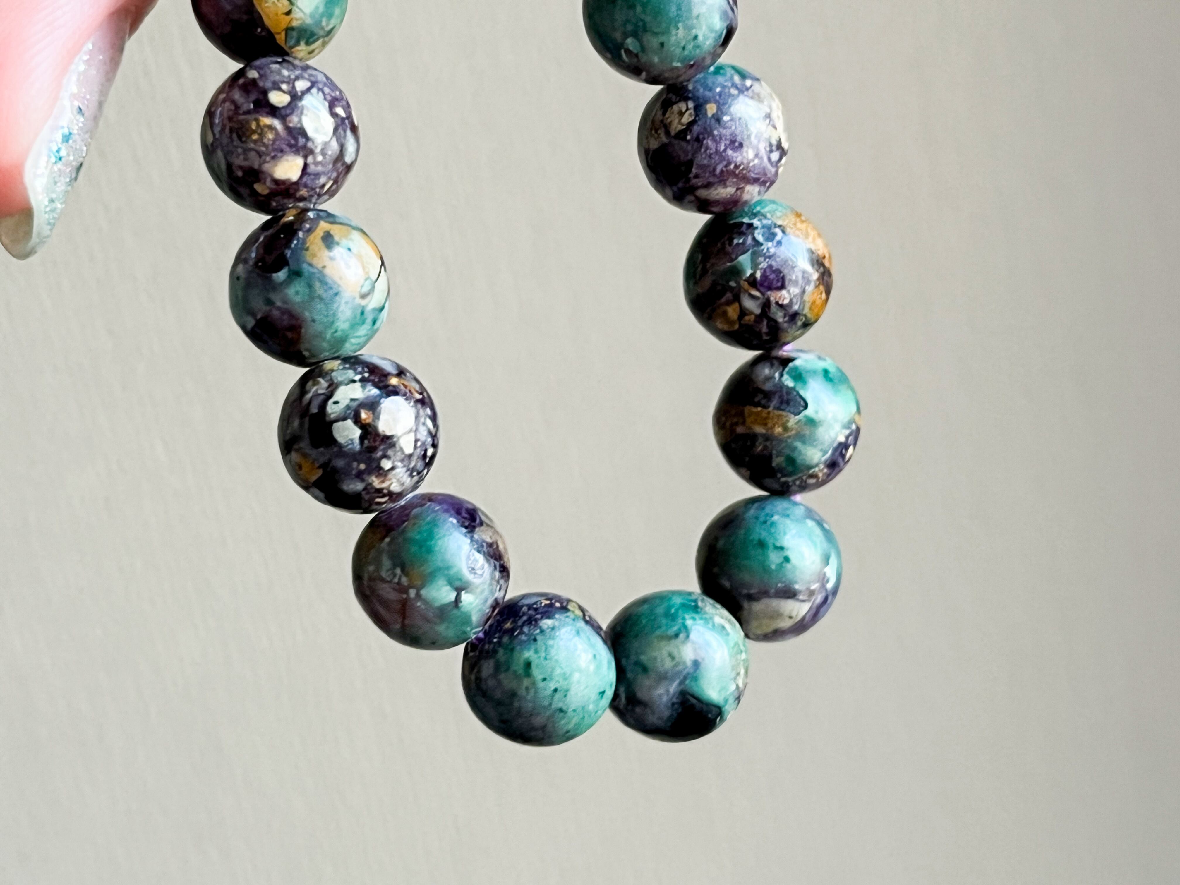 オパールカルセドニーインフローライトは、滅多に共生しない特徴を持ち、一粒一粒が全く異なる柄と色合いを呈しています。これにより、まさに世界に一つだけの特別なブレスレットとして、個性を際立たせるアイテムとなっています。