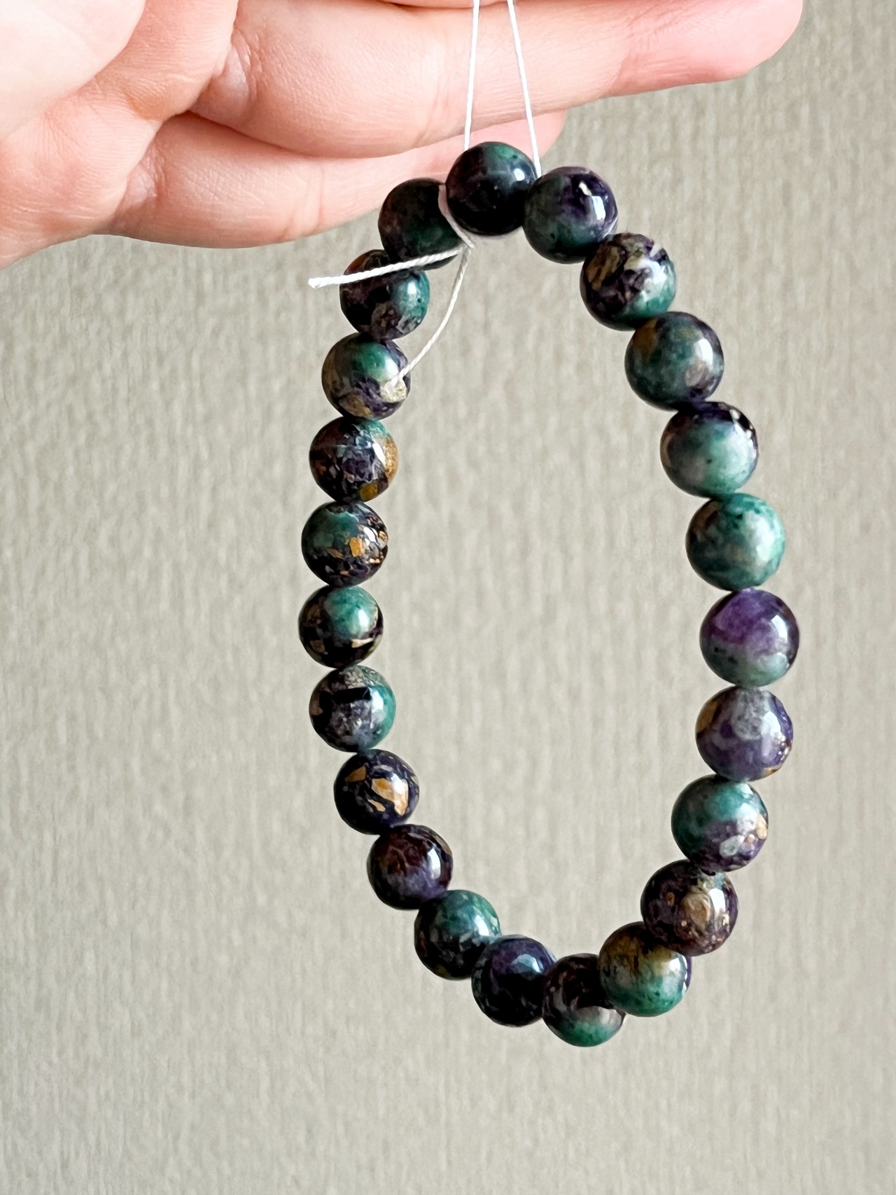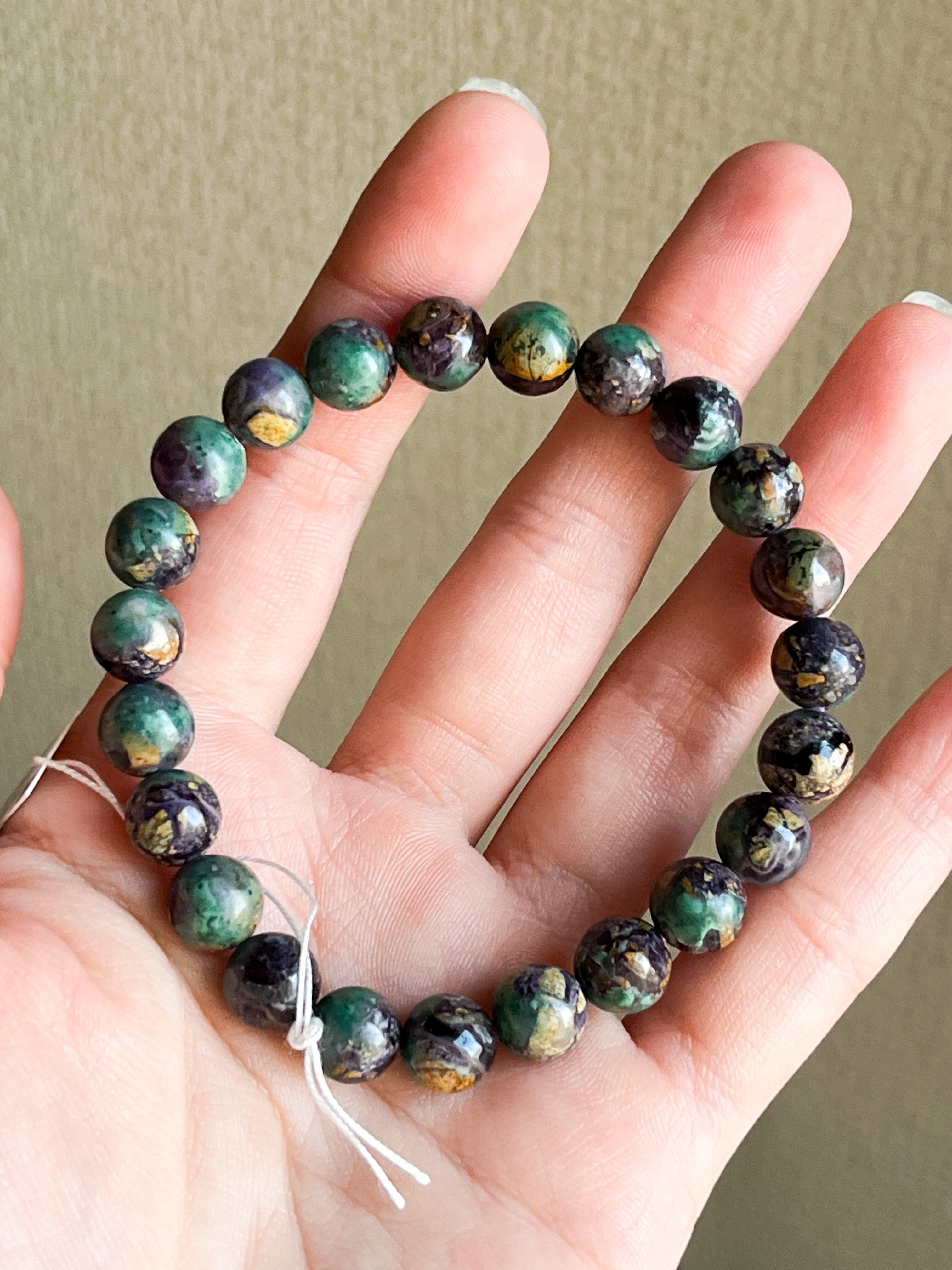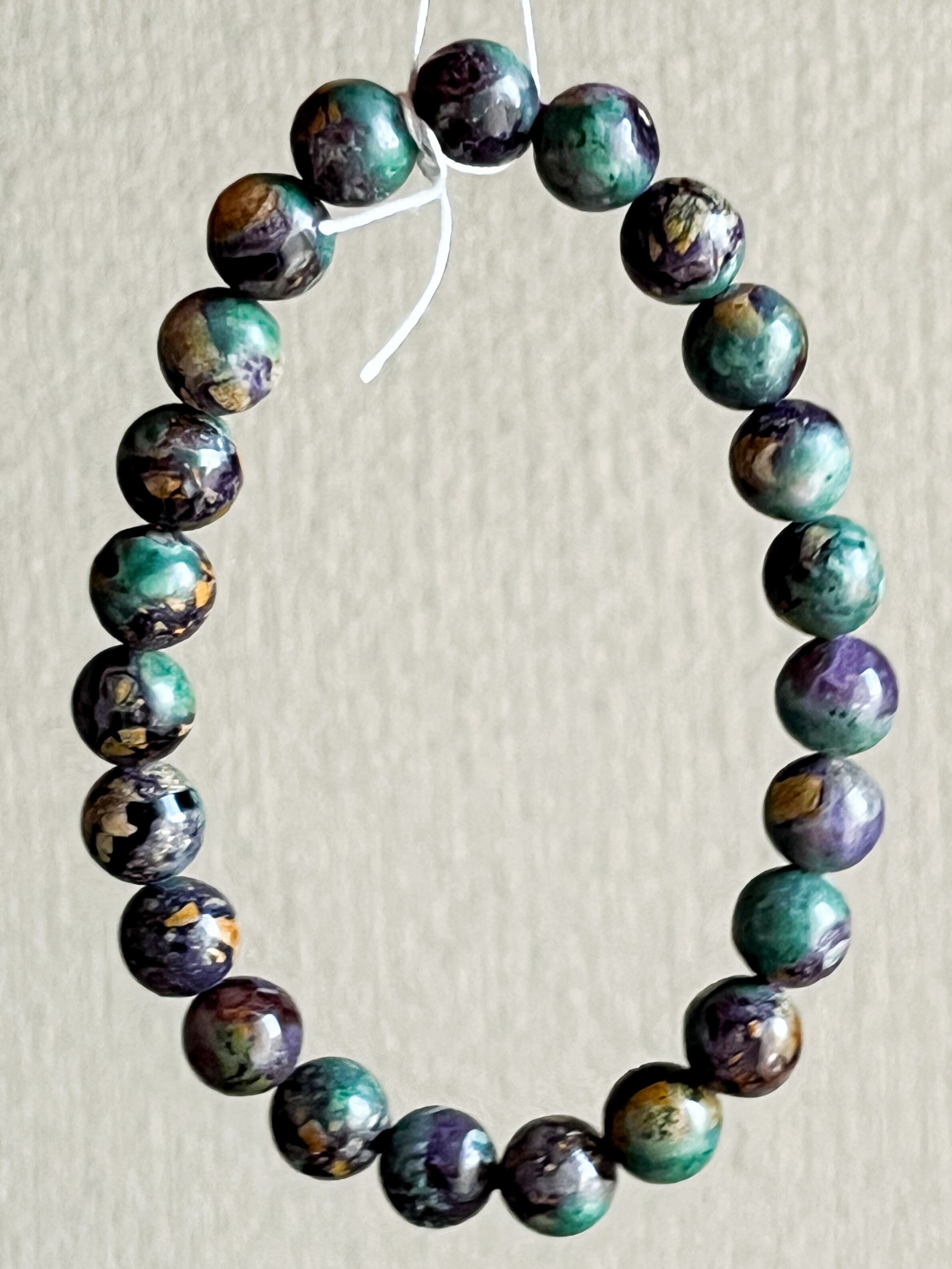 オパールカルセドニーインフローライトは、滅多に共生しない特徴を持ち、一粒一粒が全く異なる柄と色合いを呈しています。これにより、まさに世界に一つだけの特別なブレスレットとして、個性を際立たせるアイテムとなっています。