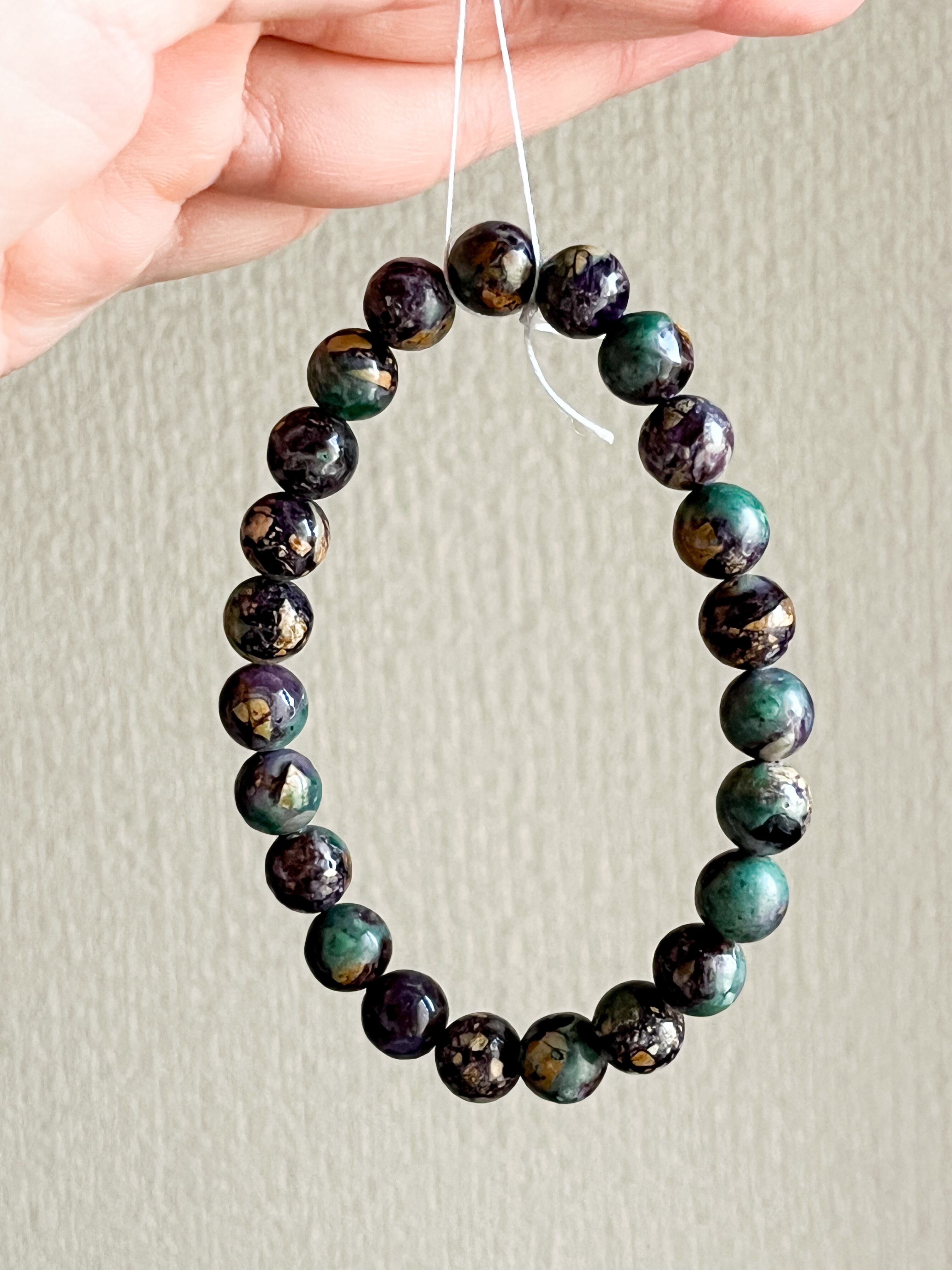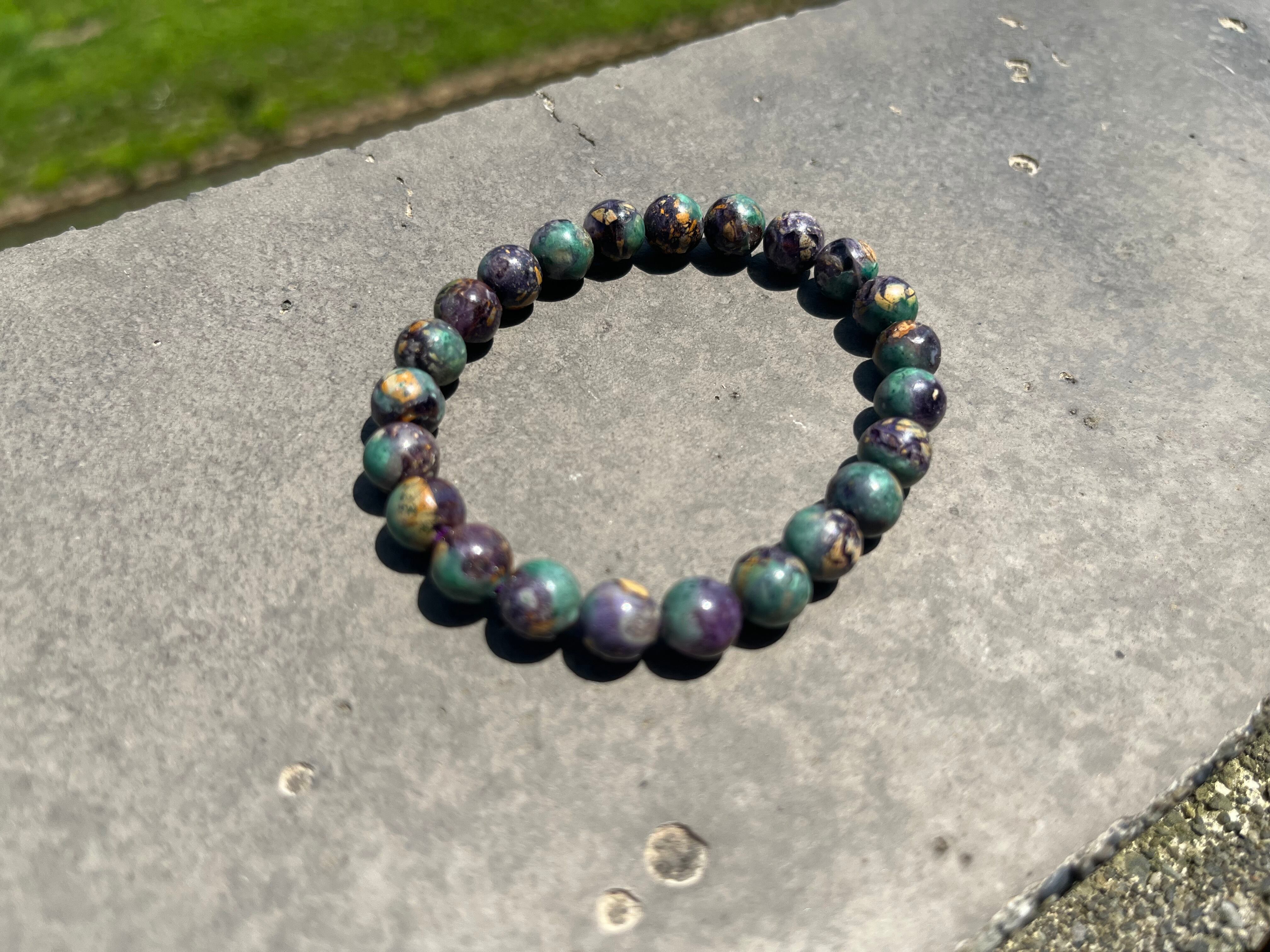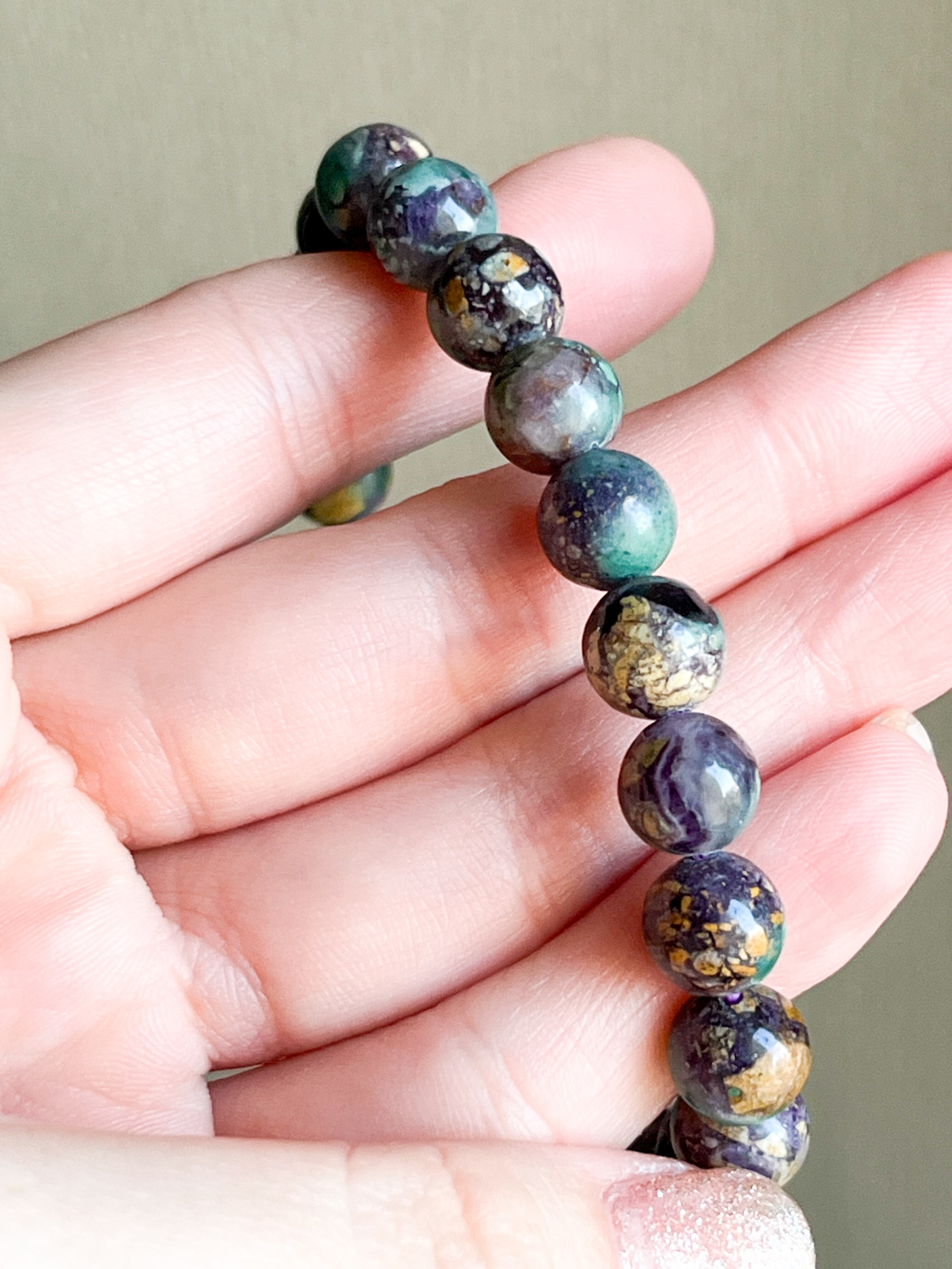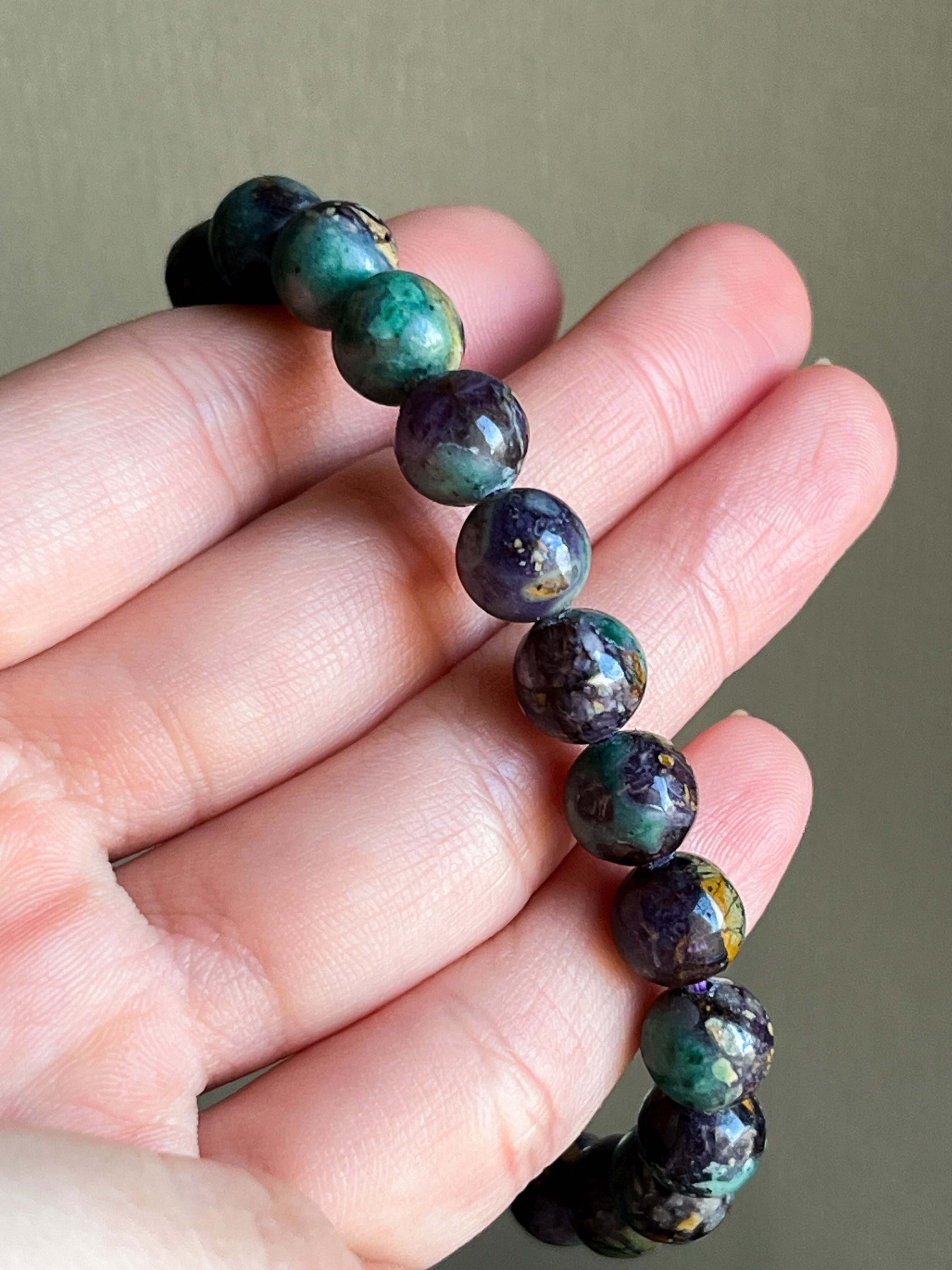 オパールカルセドニーインフローライトは、滅多に共生しない特徴を持ち、一粒一粒が全く異なる柄と色合いを呈しています。これにより、まさに世界に一つだけの特別なブレスレットとして、個性を際立たせるアイテムとなっています。