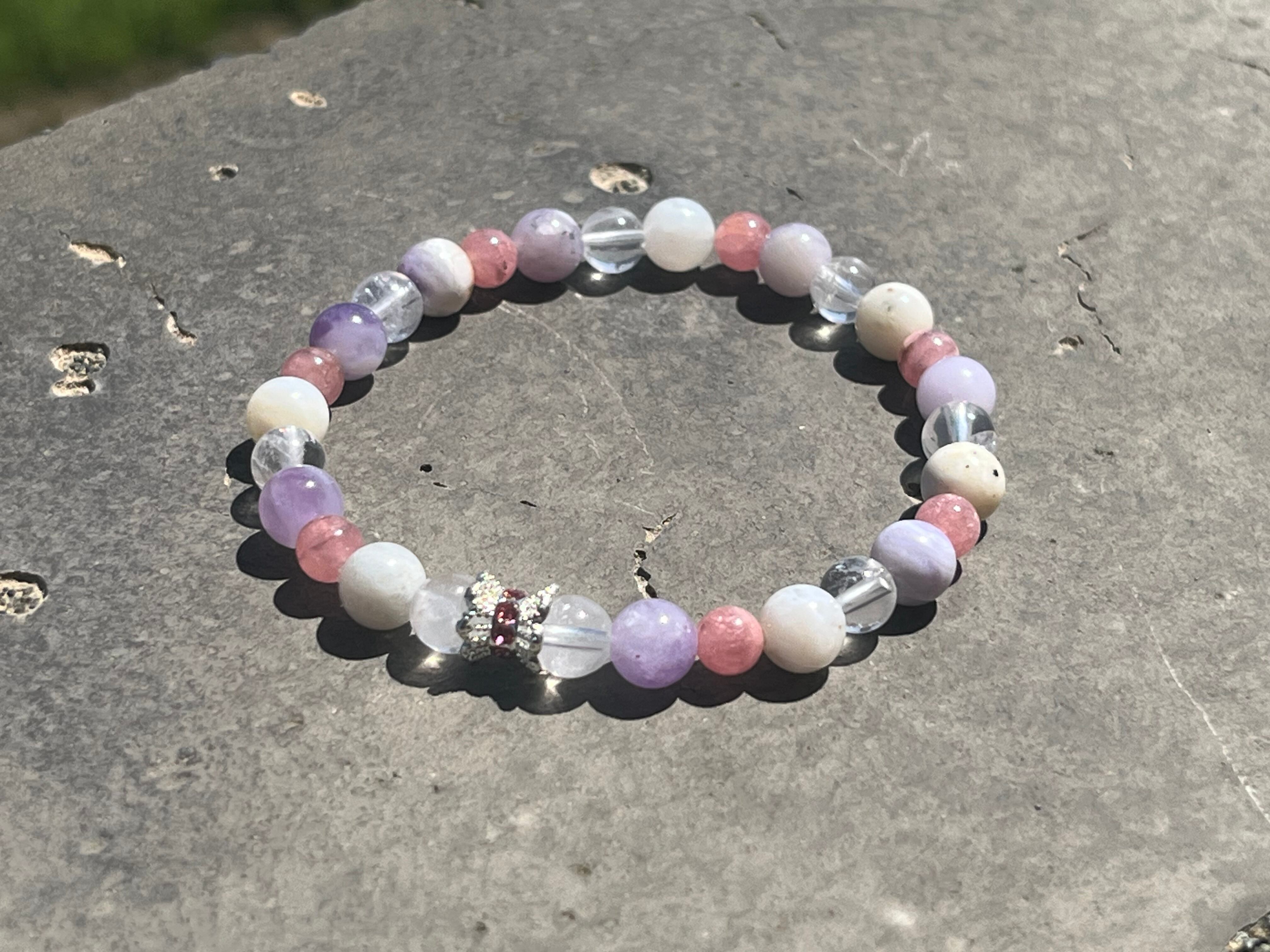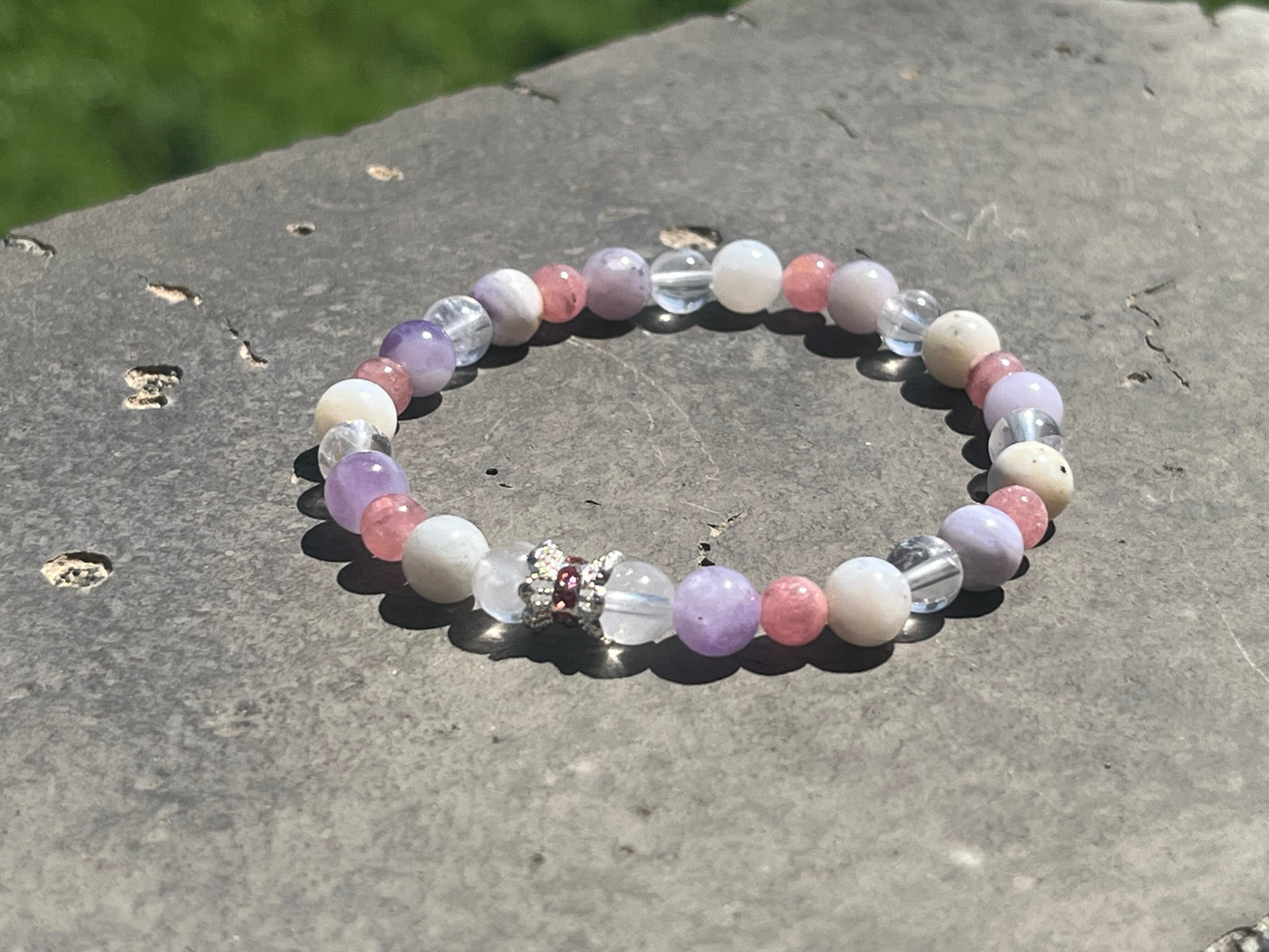 ティファニーストーンとインカローズのブレスレットです。淡い紫と白いティファニーストーンがなんとも言えない可愛らしいブレスレットです。インカローズも小粒ながらに濃いピンクで質感も良いです。縞は少なめのインカローズとなっています。